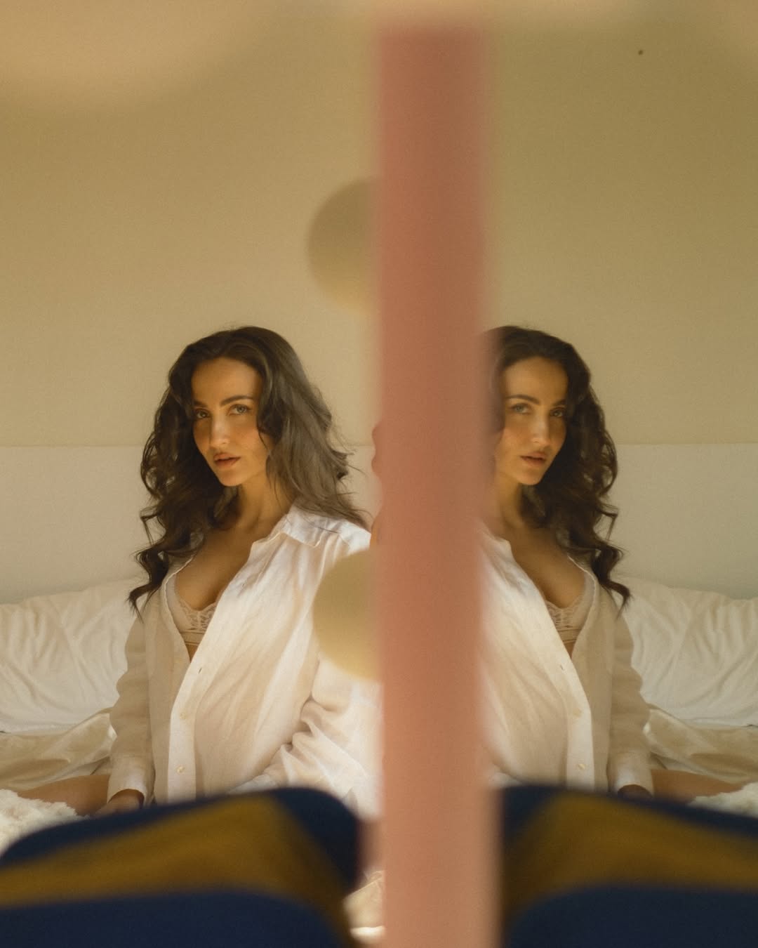 Elli AvrRam captivates in this intimate bedroom photoshoot, radiating effortless sensuality and natural beauty.