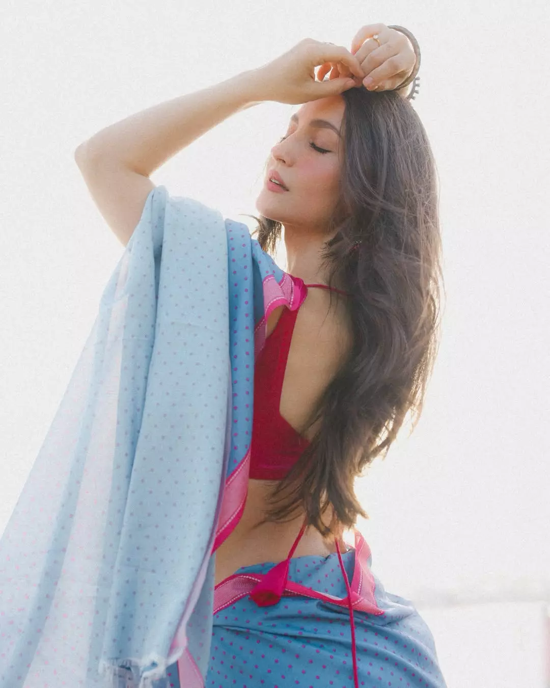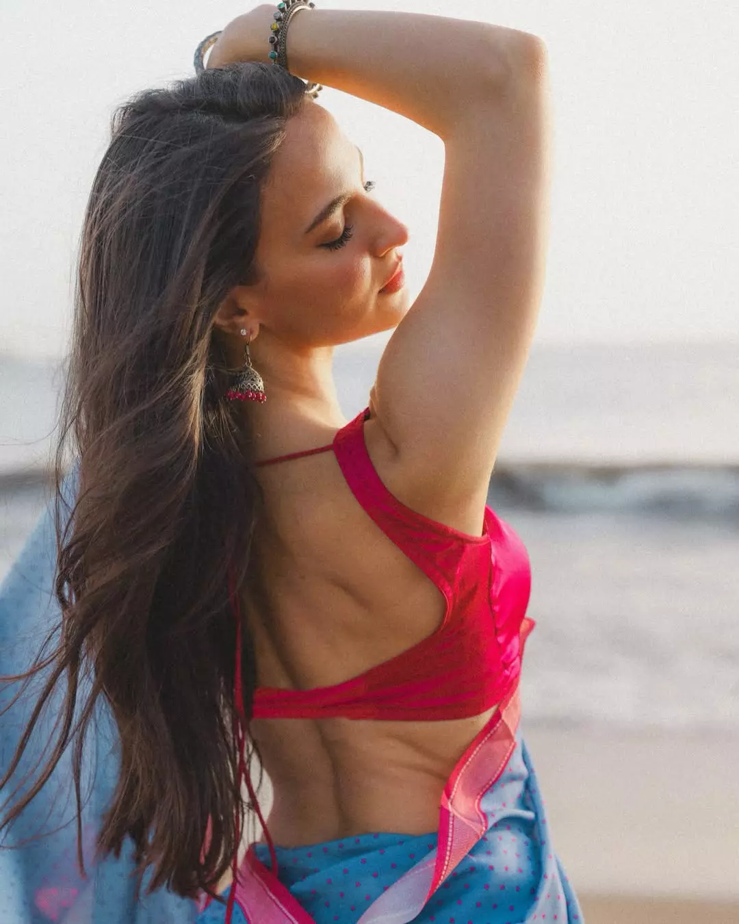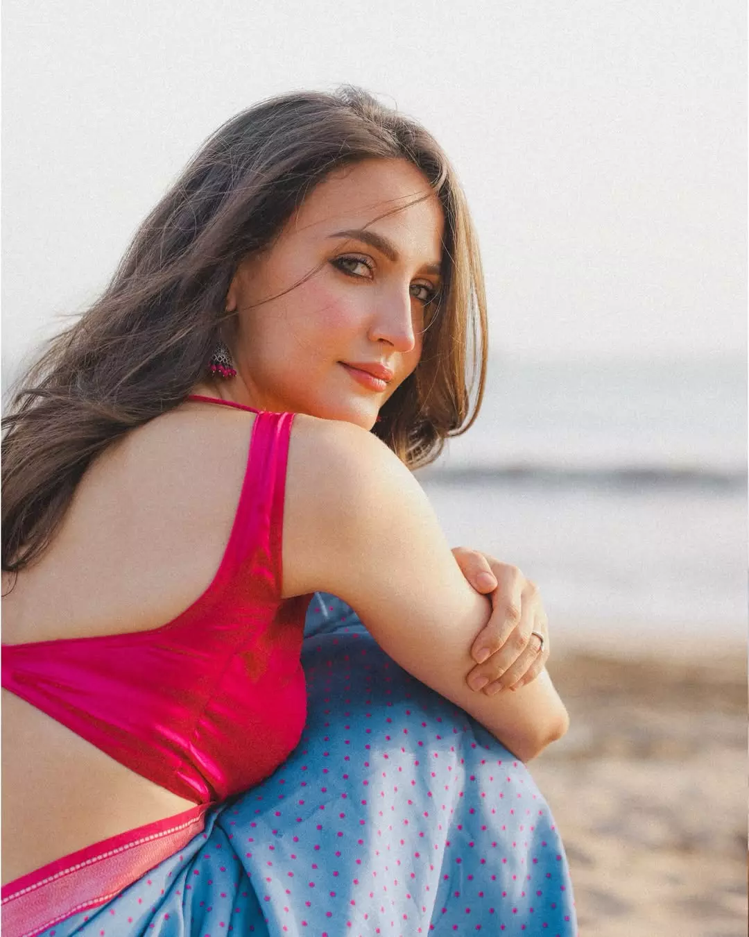 In this breathtaking beachside shot, Elli AvrRam looks radiant and confident in a vibrant pink top paired with a blue saree.