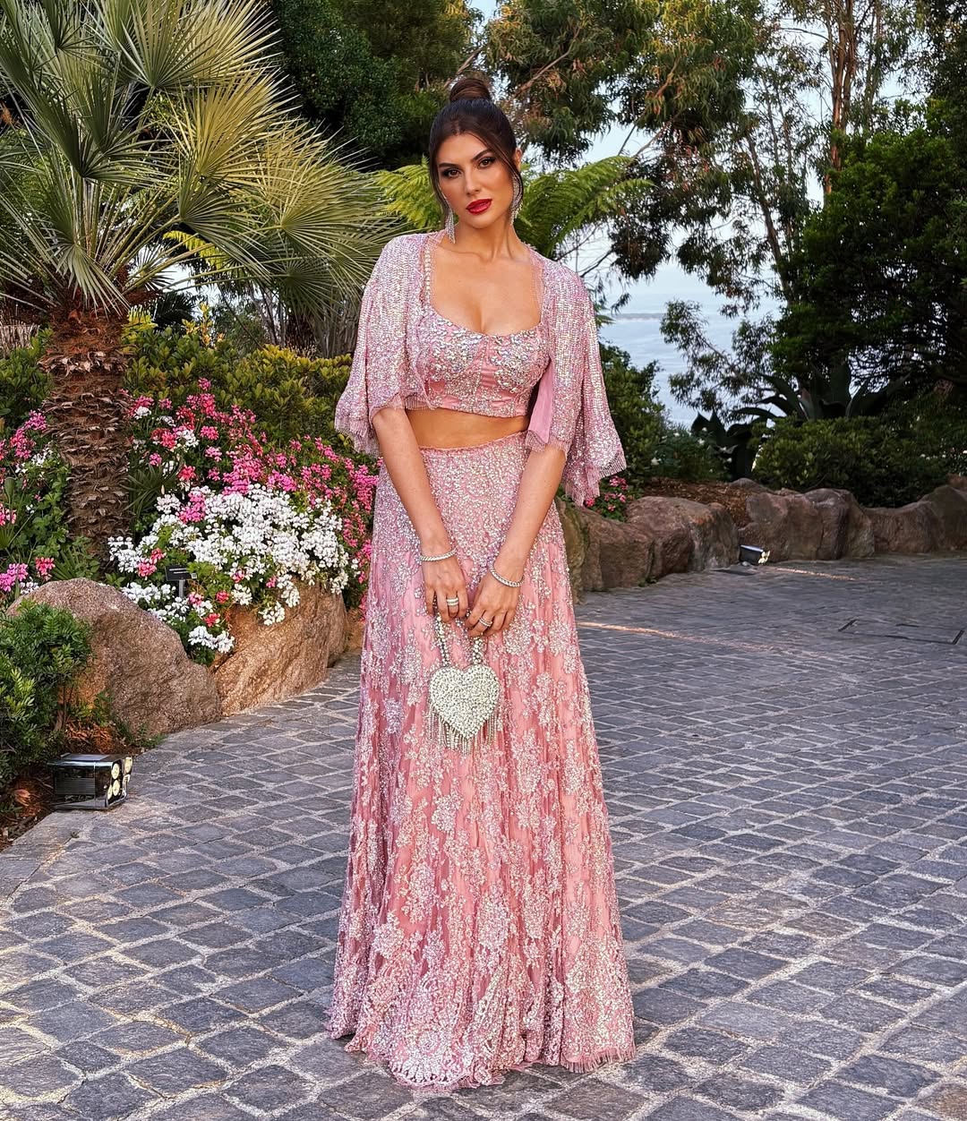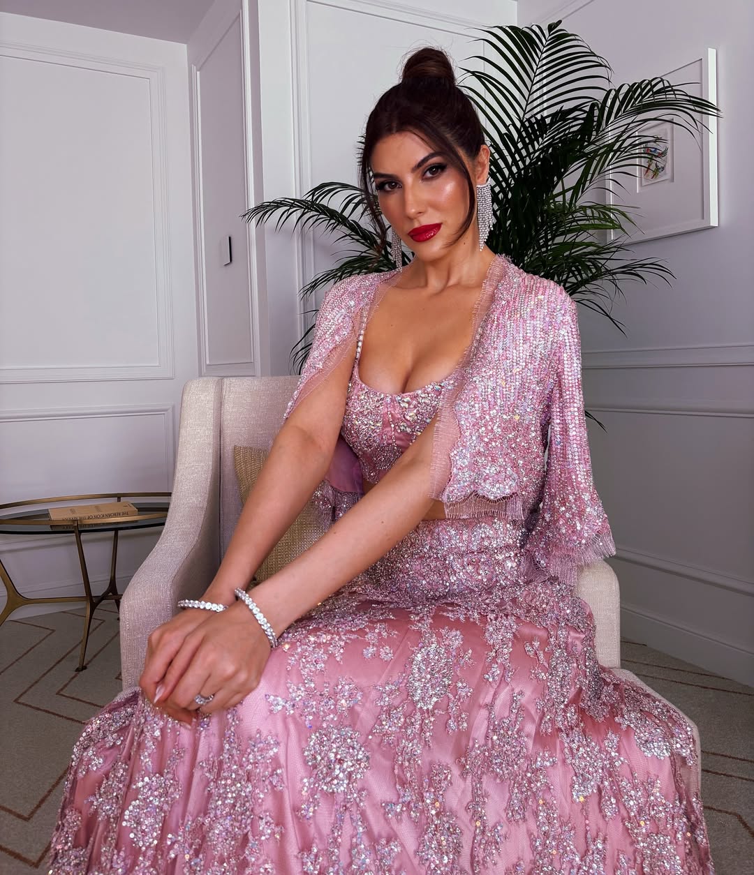 Elnaaz Norouzi serves pure cinematic seduction, latte corset laced tight with ruffled edges while a fringed midi skirt sways like film reels in the wind.