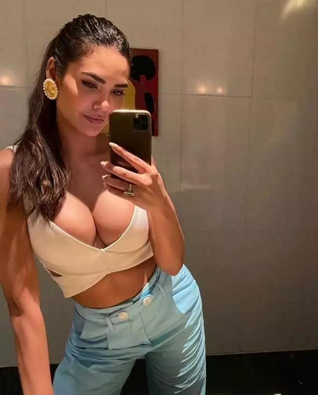 Esha exudes classic glamour and bold confidence. featuring a plunging neckline and fitted long sleeves, highlighting her toned figure. Her wavy hair, dramatic makeup, and confident pose amplify the sultry vibe, making this look a perfect blend of elegance and sensuality. Esha Gupta truly knows how to make a powerful fashion statement.