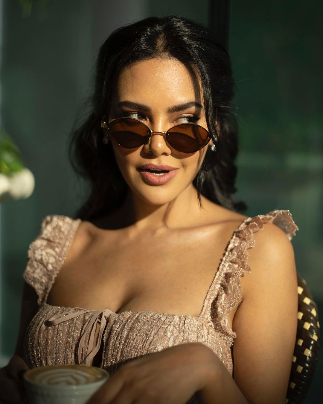 This captivating photo features Esha in a chic mint green ensemble: a cropped tube top paired with a tailored blazer and high-waisted trousers. Her wavy hair cascading over one shoulder, minimal gold necklace, and confident pose against a matching teal backdrop exude modern sophistication and effortless allure—pure boss-lady vibes.