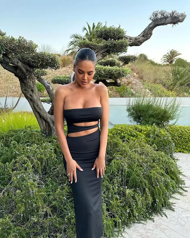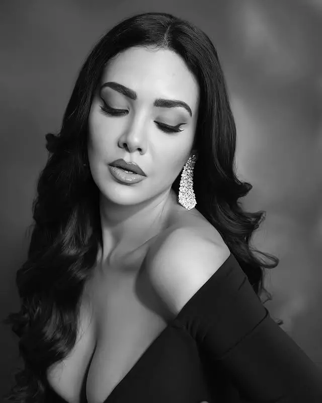 In this captivating black-and-white photo, Esha exudes classic glamour and bold confidence. She dons a daring black outfit featuring a plunging neckline and fitted long sleeves, highlighting her toned figure. Her wavy hair, dramatic makeup, and confident pose amplify the sultry vibe, making this look a perfect blend of elegance and sensuality. Esha Gupta truly knows how to make a powerful fashion statement.