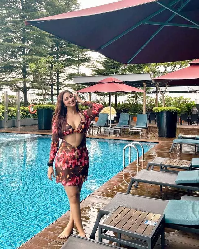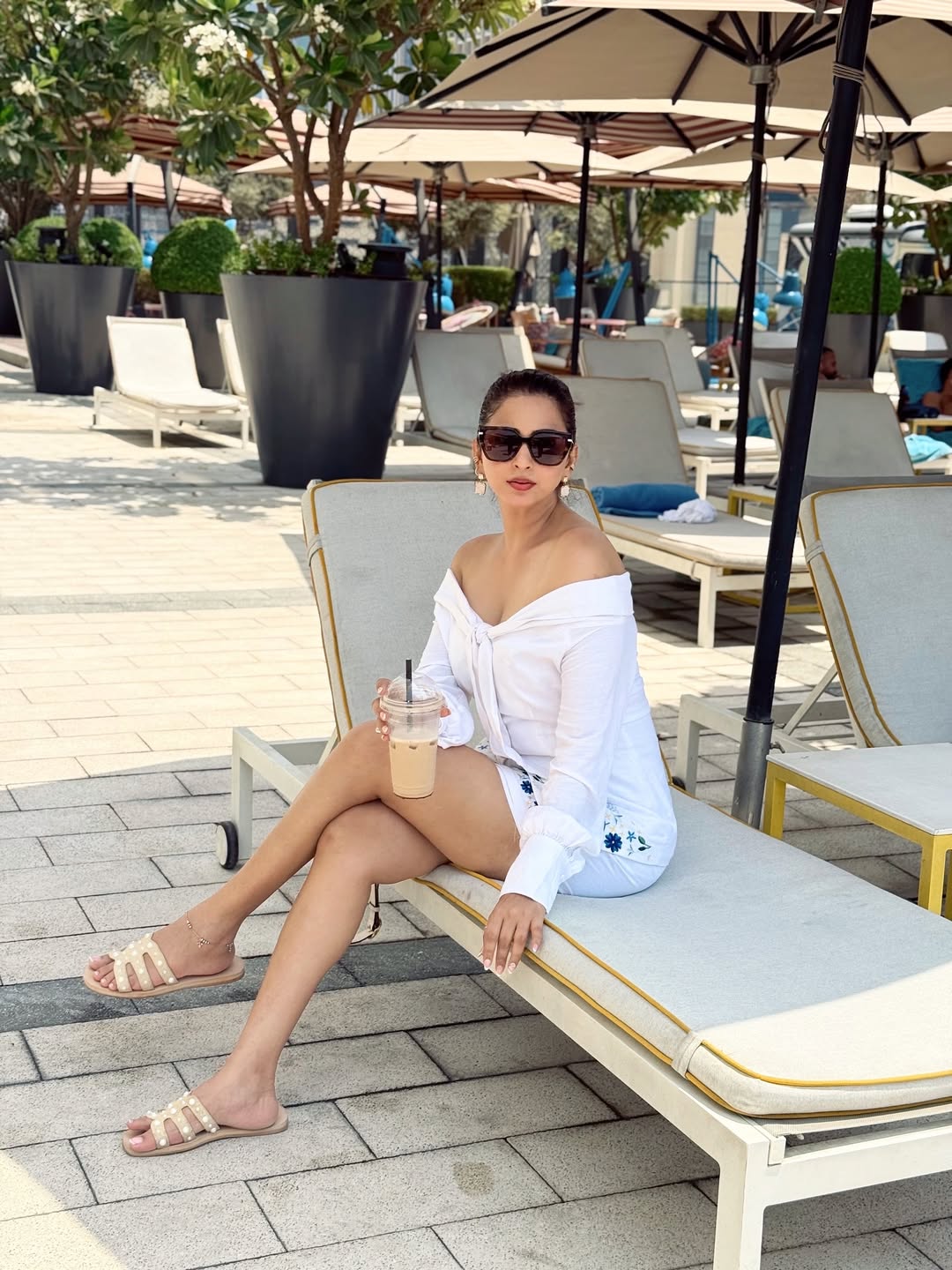 Eshaanya perfectly reflects this vibe as she enjoys a moment of relaxation by the pool, embodying the essence of an urban retreat in the heart of Dubai.