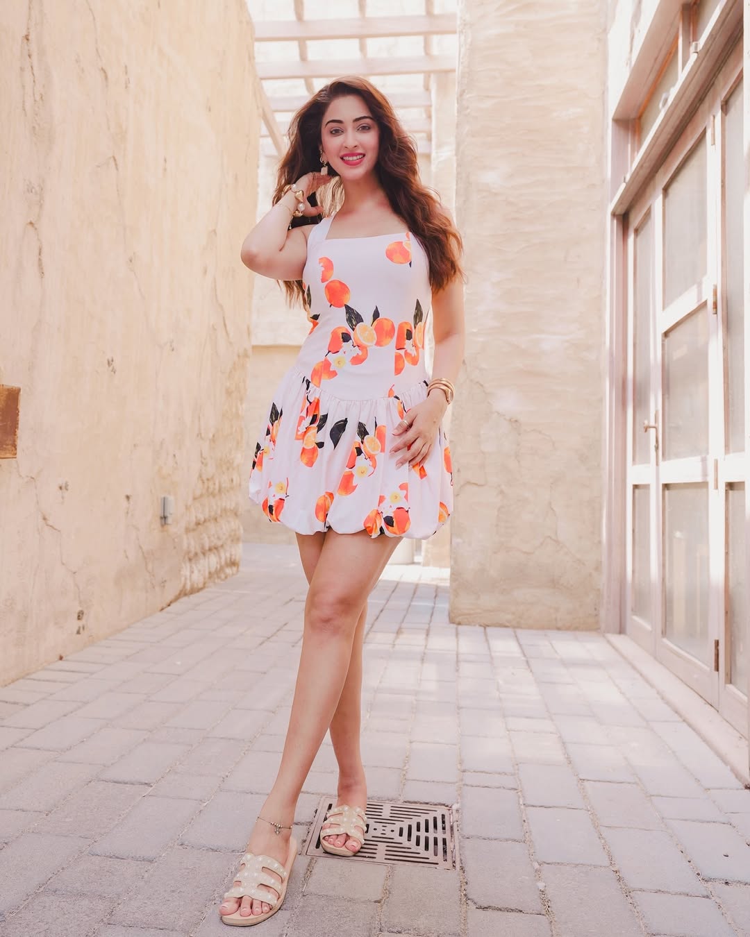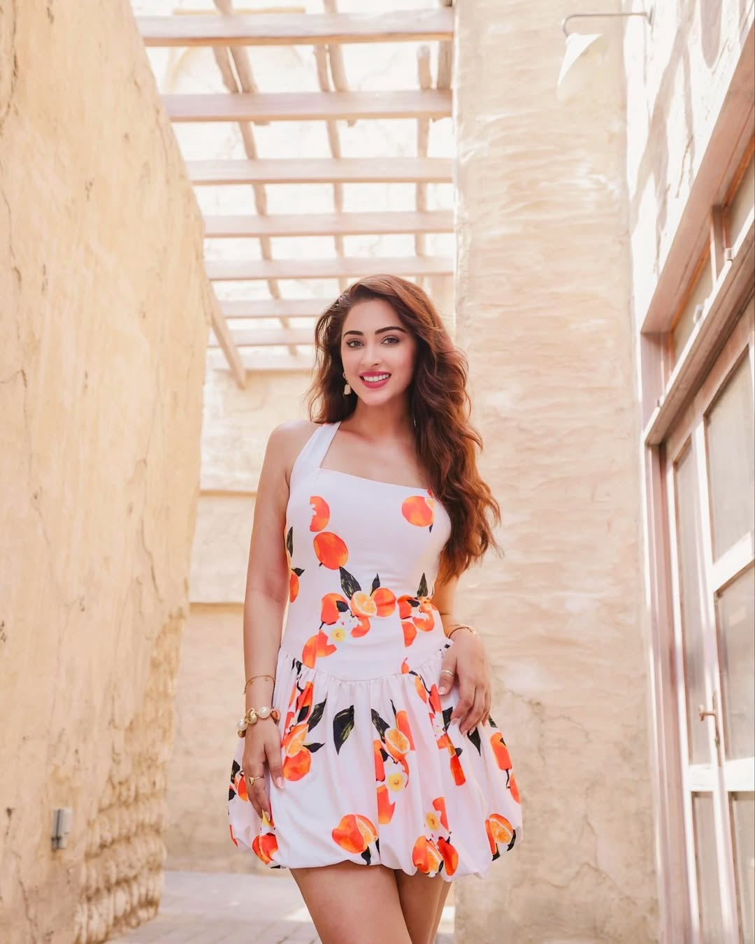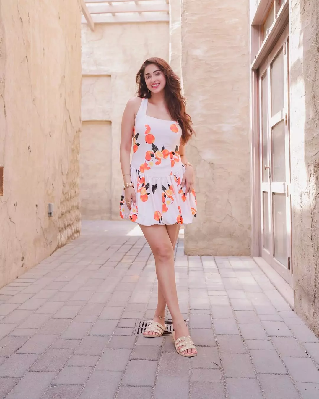 Eshanya Maheshwari recently shared a beautiful picture on Instagram that perfectly captures her charm and elegance. In the photo, she is seen wearing a white dress with colorful citrus prints, standing gracefully in the old city lanes of Dubai. Her caption read, “Serving sunshine with a pop of citrus in the heart of Dubai ☀️🍊 When fashion meets the old city charm ✨.” The photo was clicked at Al Seef, Dubai, a location known for its cultural beauty and heritage vibes, which added more magic to her look.