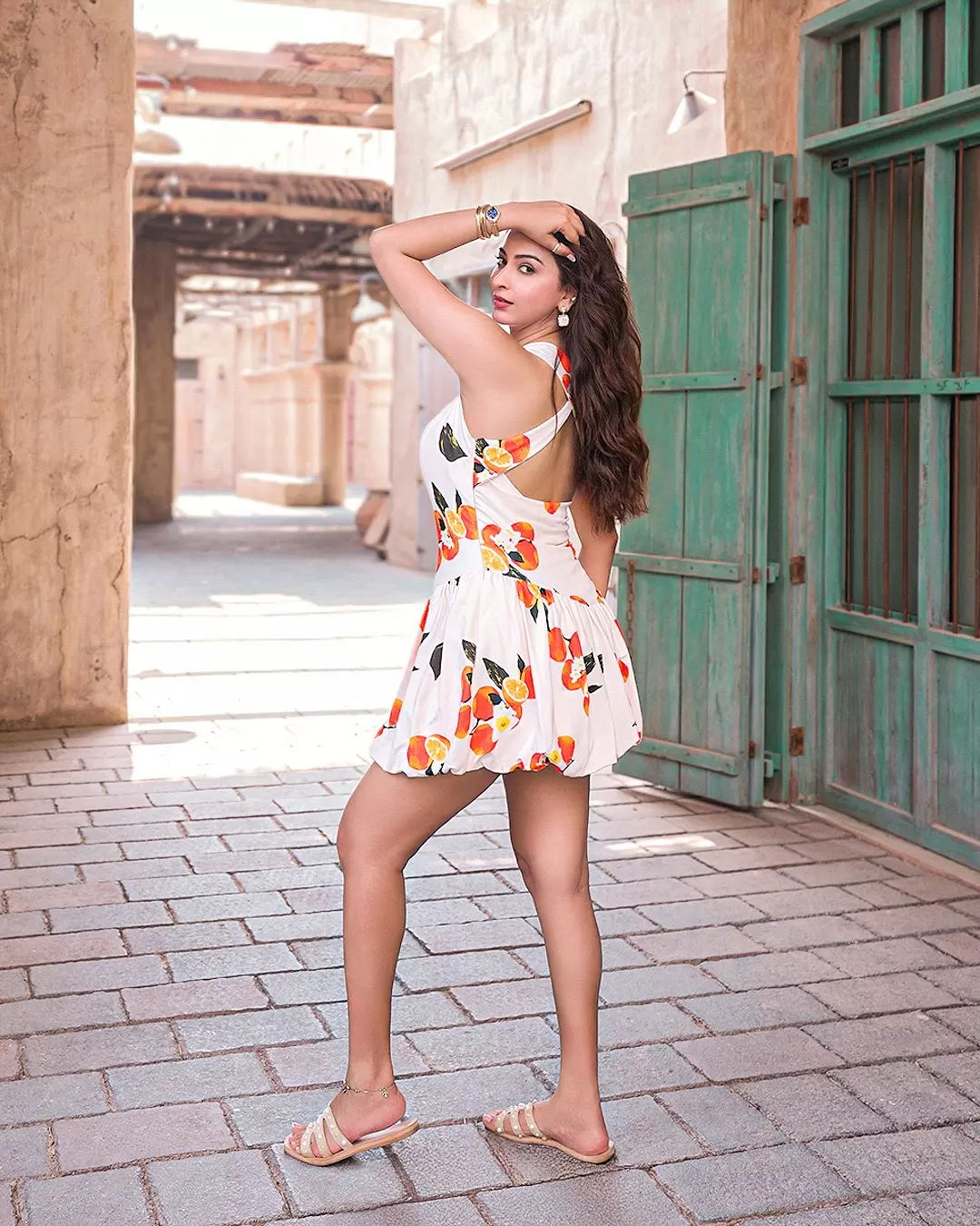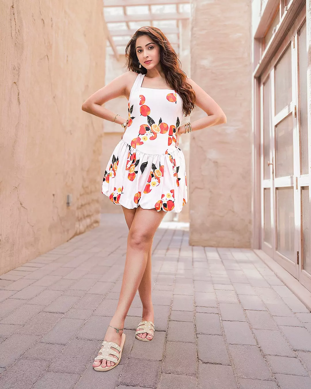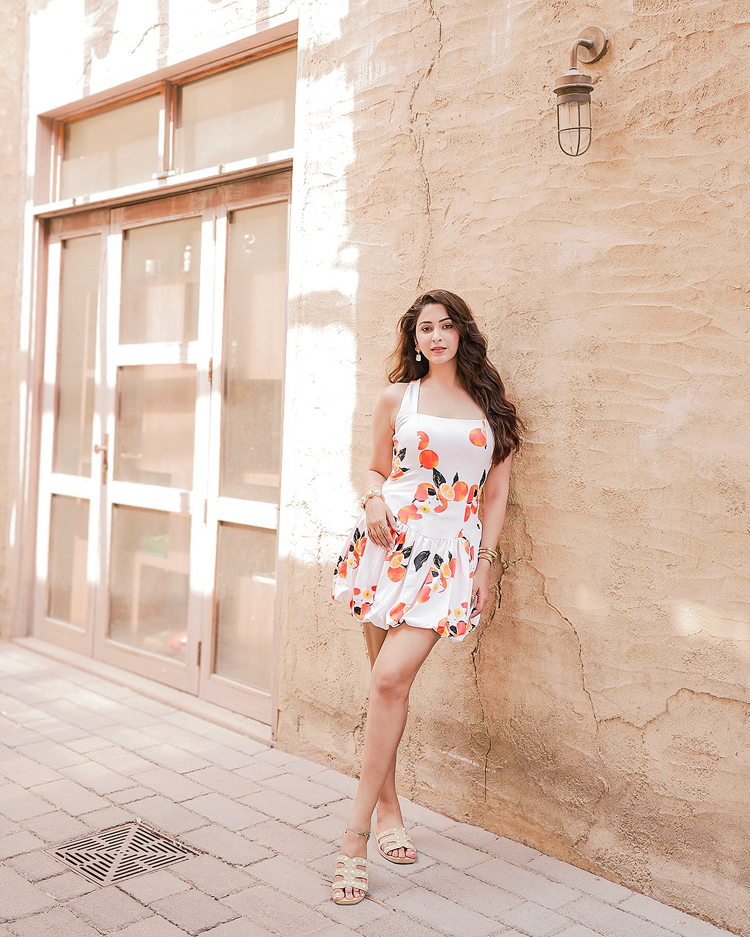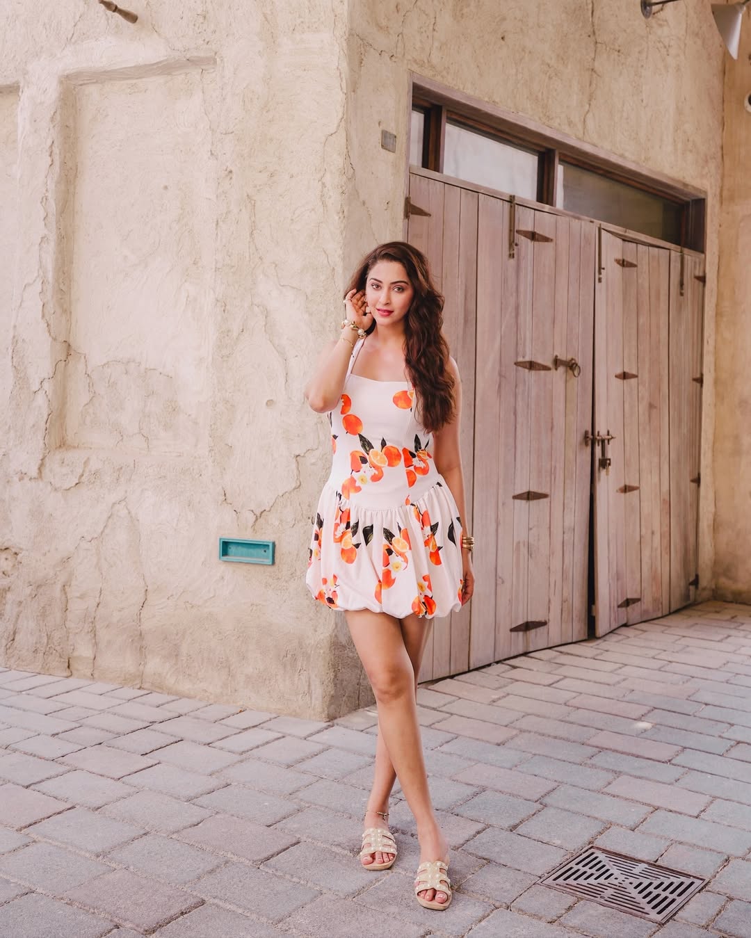 Eshanya Maheshwari recently shared a beautiful picture on Instagram that perfectly captures her charm and elegance. In the photo, she is seen wearing a white dress with colorful citrus prints, standing gracefully in the old city lanes of Dubai. Her caption read, “Serving sunshine with a pop of citrus in the heart of Dubai ☀️🍊 When fashion meets the old city charm ✨.” The photo was clicked at Al Seef, Dubai, a location known for its cultural beauty and heritage vibes, which added more magic to her look.