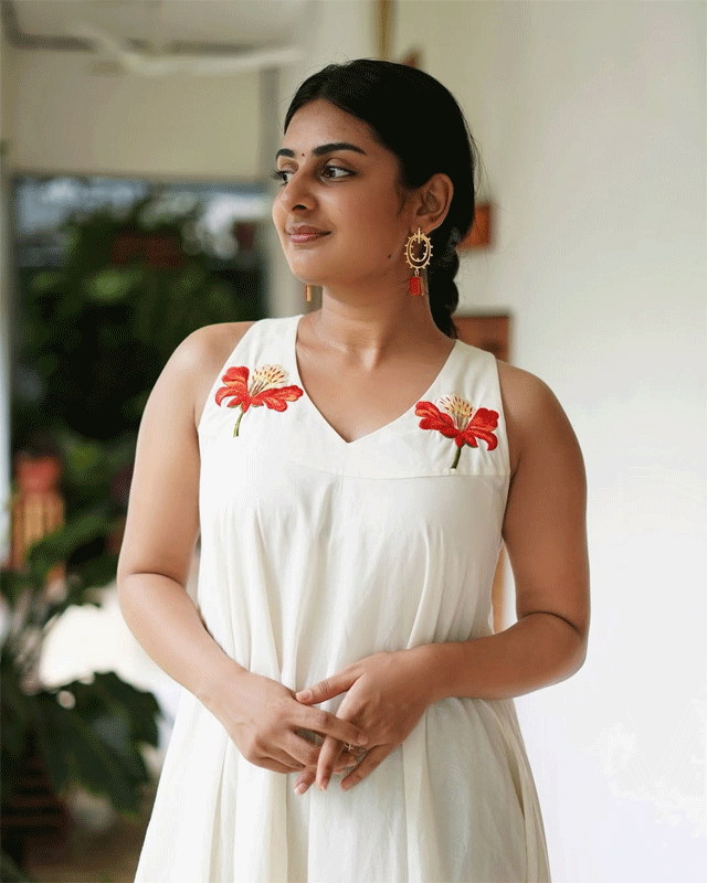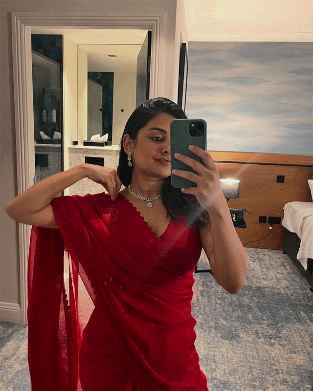 Esther Anil shared a picture from Dublin and she looks just adorable. In the pic, she wore a plain red saree with a matching blouse. She added a simple necklace and earrings. She took the picture in a hotel room in Dublin. The caption only had a red balloon emoji and her look felt graceful. The soft red shade matched the quiet setting. The picture looked natural and pure.