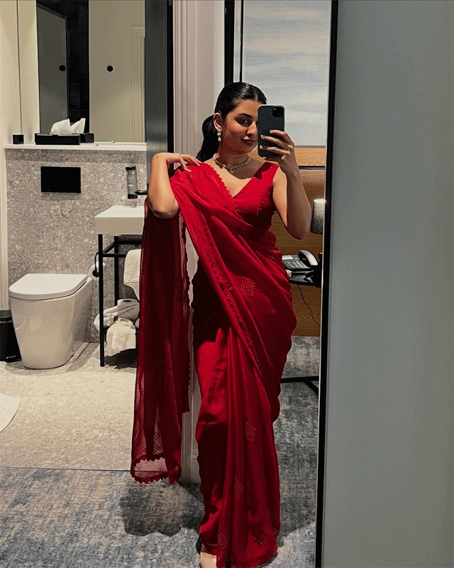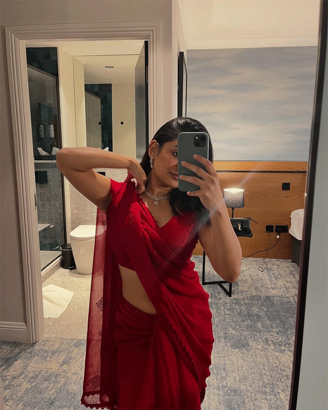 Esther Anil shared a picture from Dublin and she looks just adorable. In the pic, she wore a plain red saree with a matching blouse.
