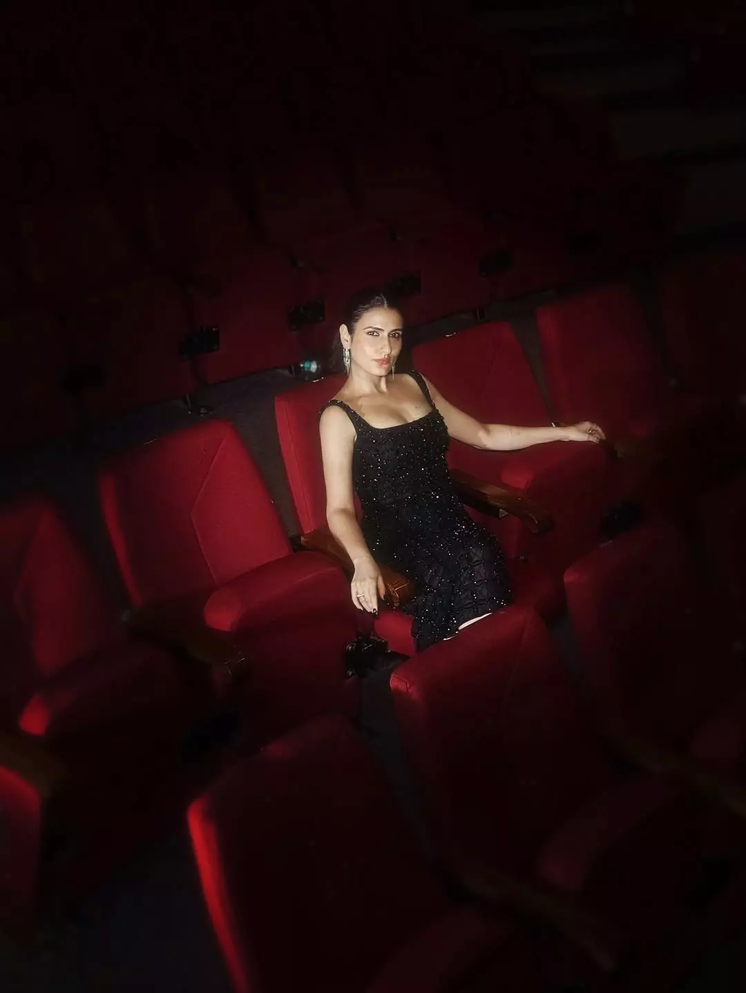 The actress shared a stunning image of herself seated alone in a theatre wearing a sleek black dress that caught the eye.
