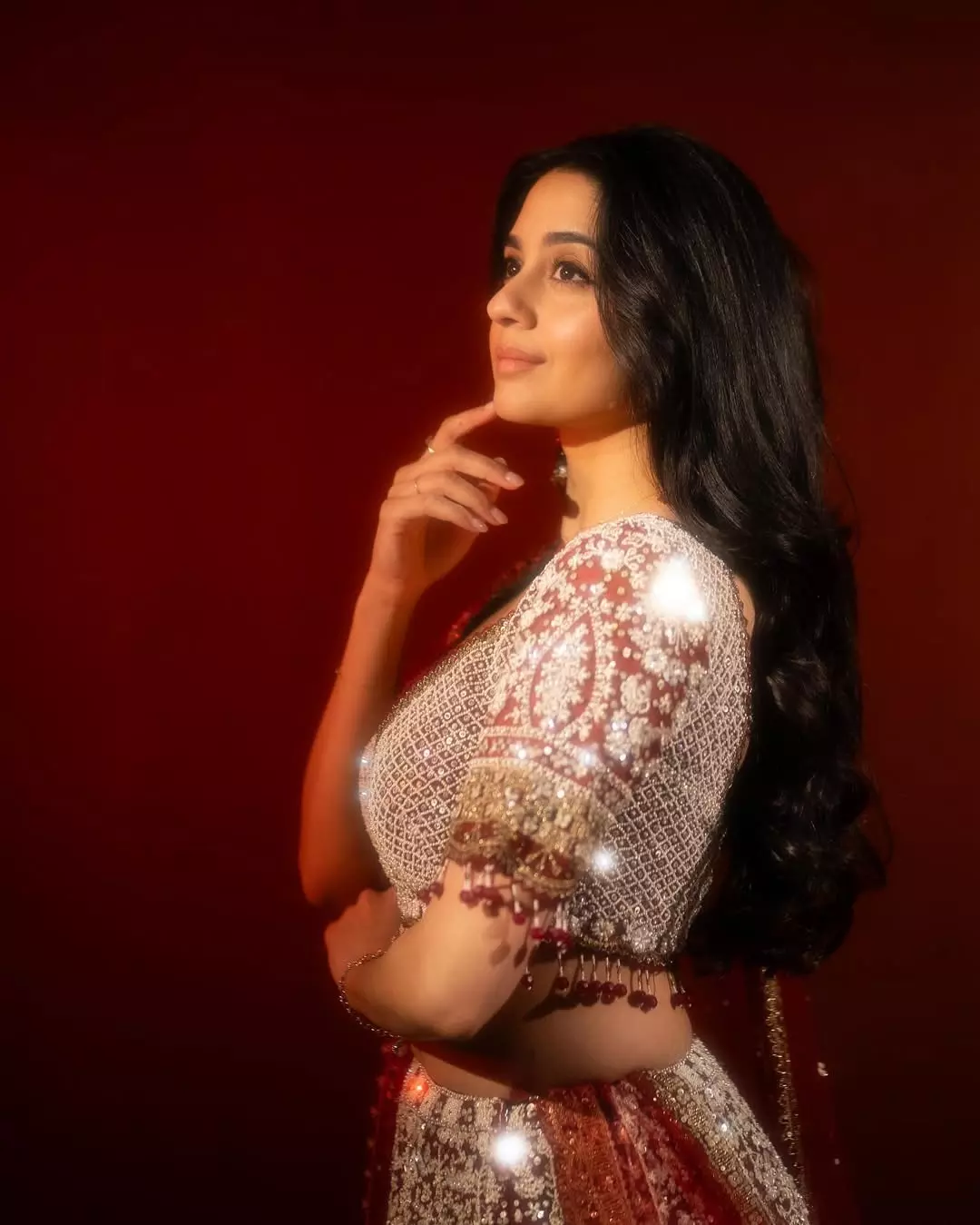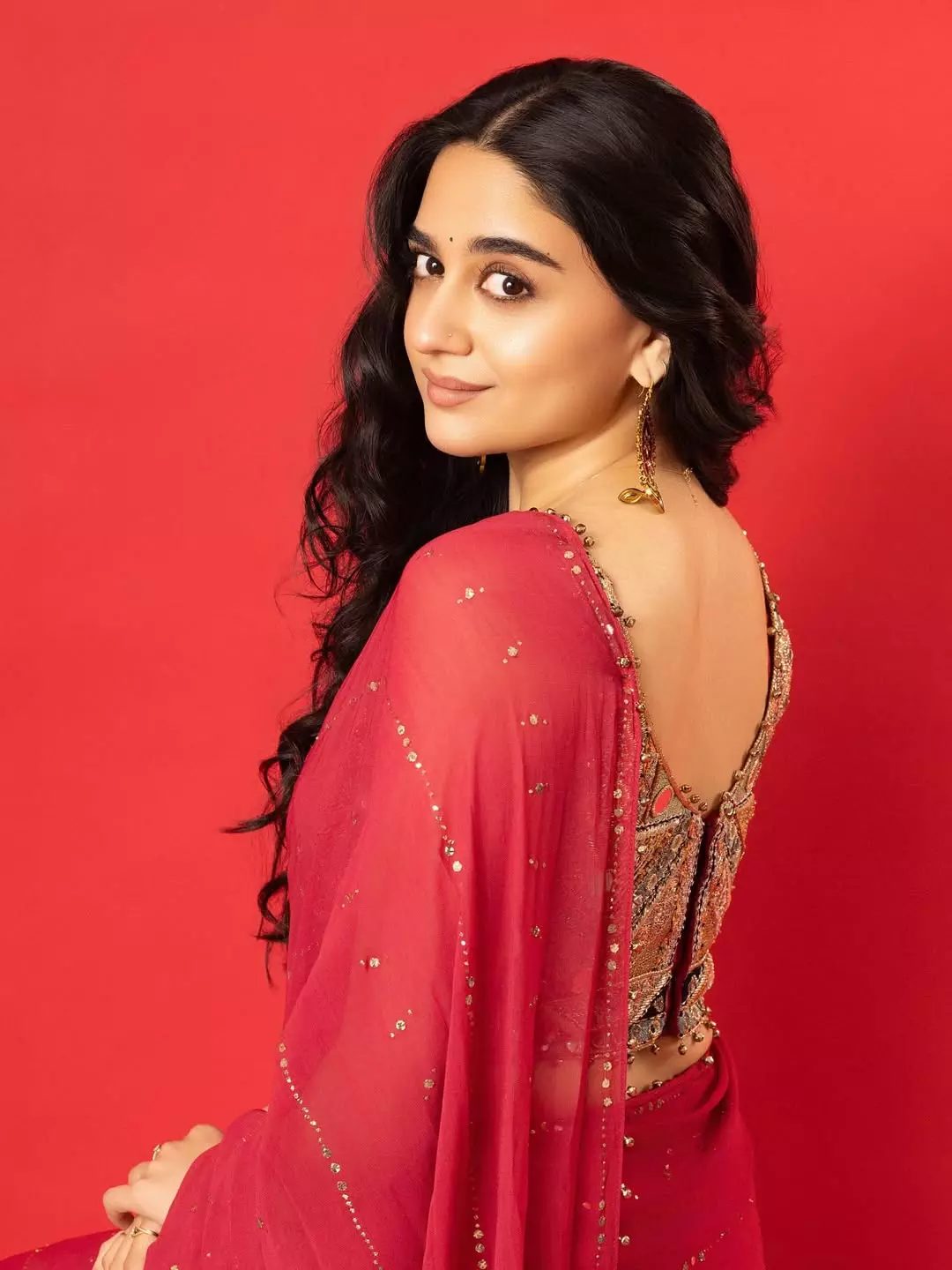Rising star Imanvi (Iman Esmail) stuns in this vibrant photoshoot, draped in a shimmering red saree with intricate gold-embroidered blouse, ornate earrings, and flowing wavy hair against a bold red backdrop.