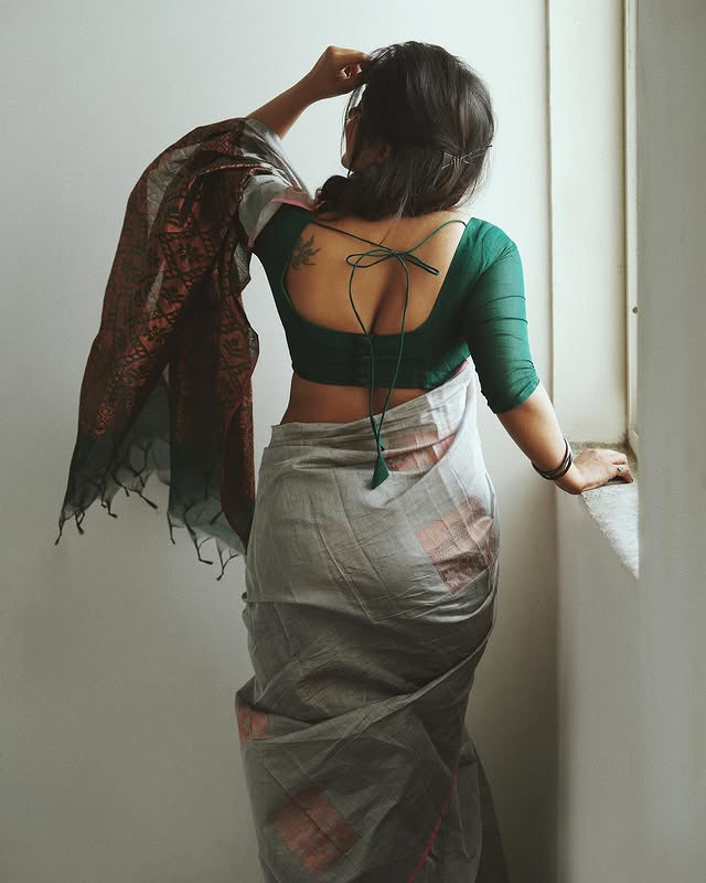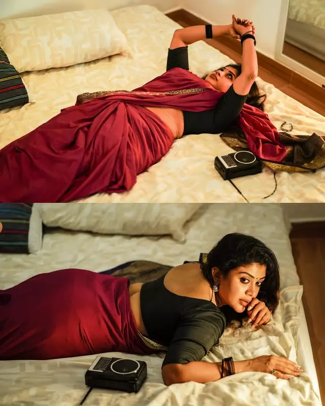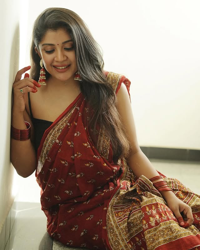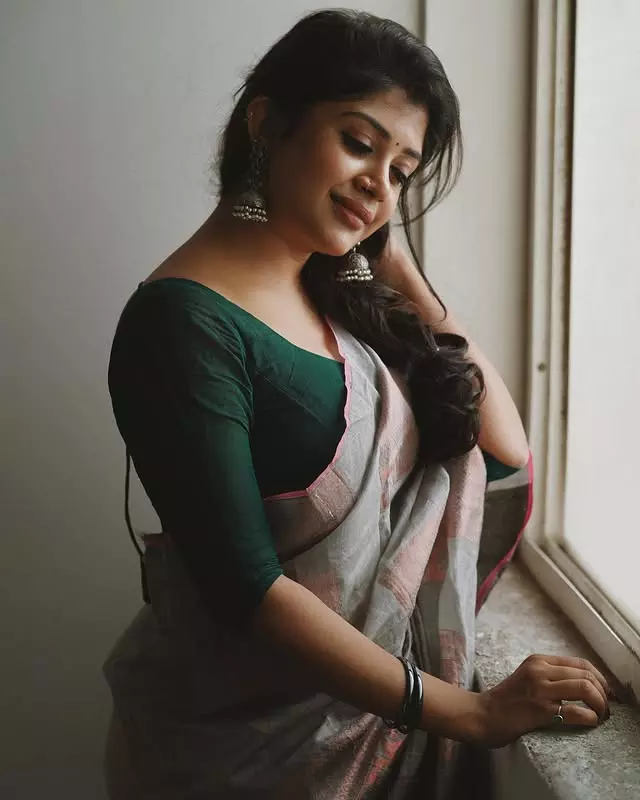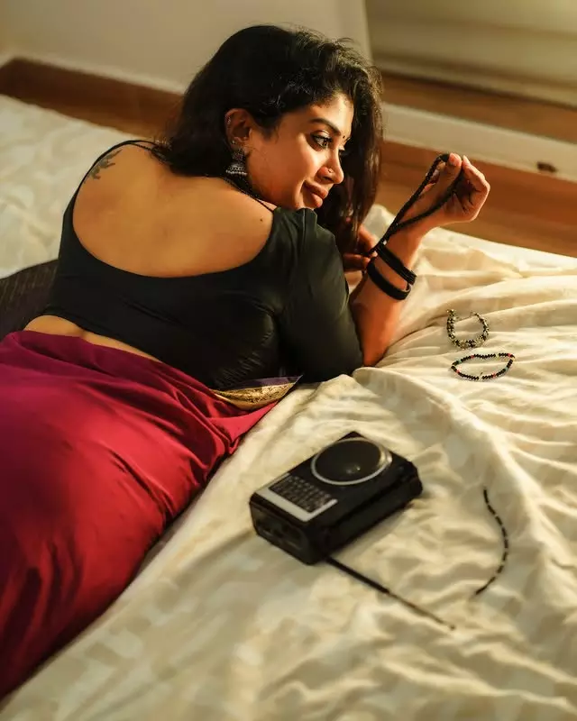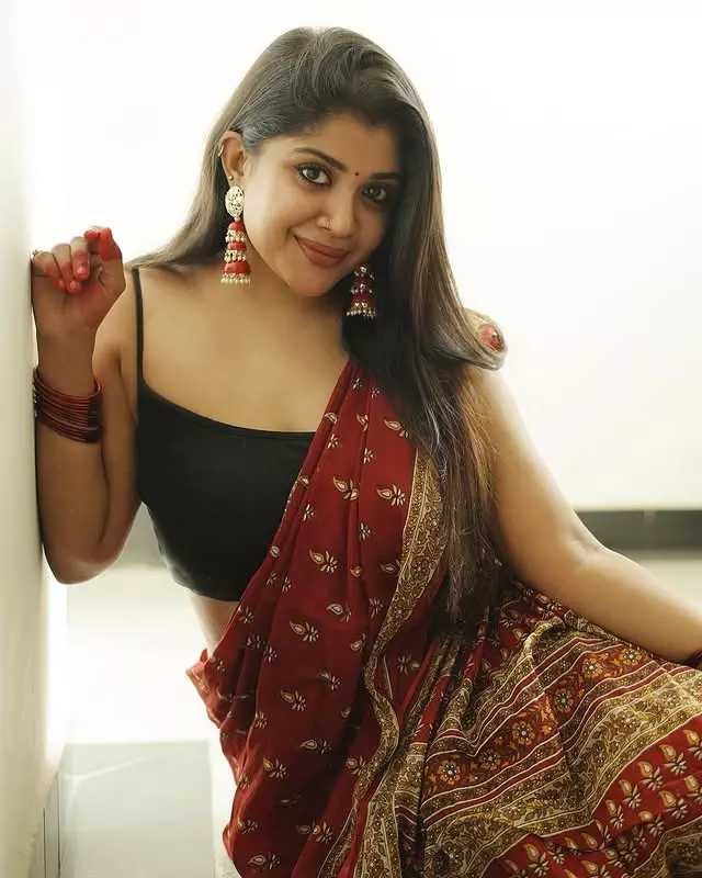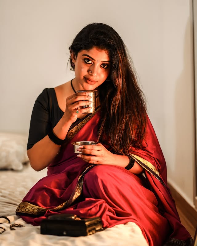 Meanwhile in her Instagram photo, Gayathri Shan is seen wearing a maroon saree. It has a gold border. She matched it with a plain black blouse. She wore simple black bangles and a nose ring. Her hair was left open. Her eyes were lined with kajal. She held a traditional tumbler in her hand. She sat on a bed with calm lighting. Her caption read "en moochu ninnu pochu.”