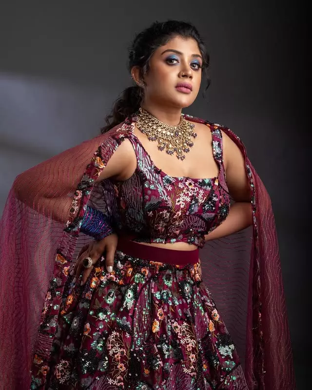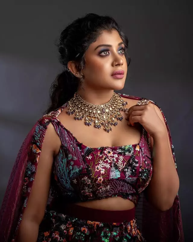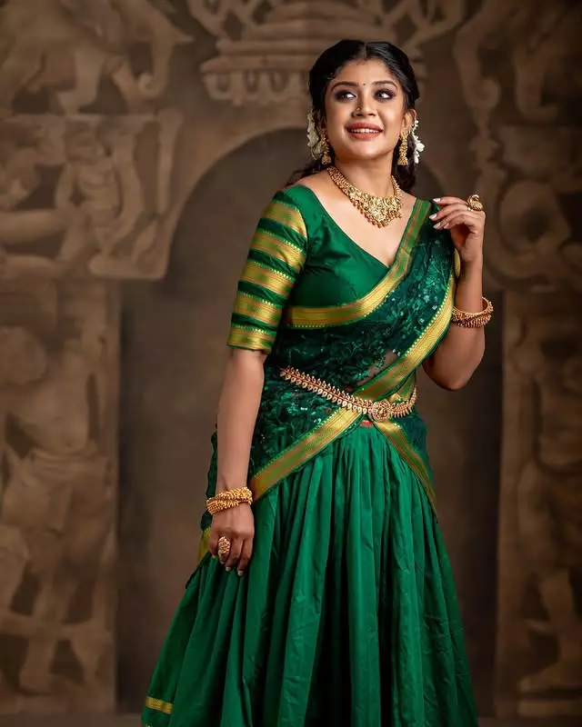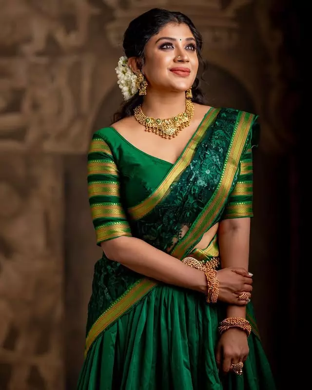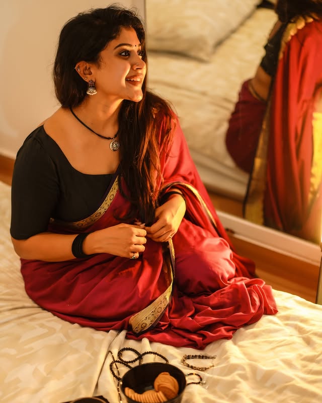 Gayathri Shan wore a deep maroon saree with a black blouse. Her look brings out the essence of traditional charm.