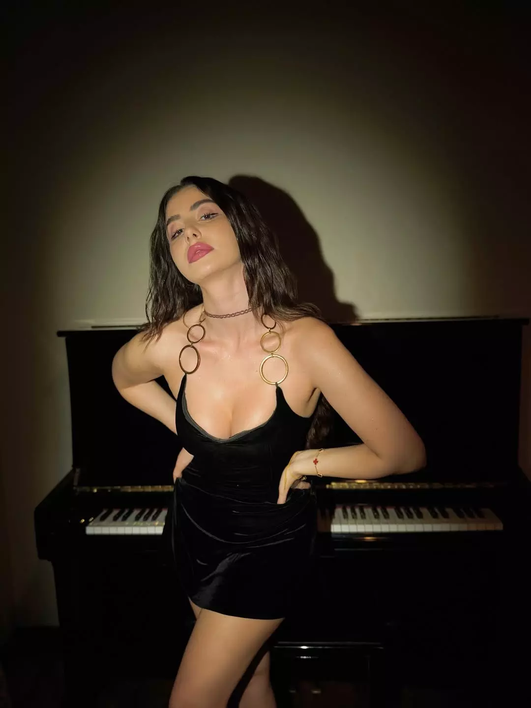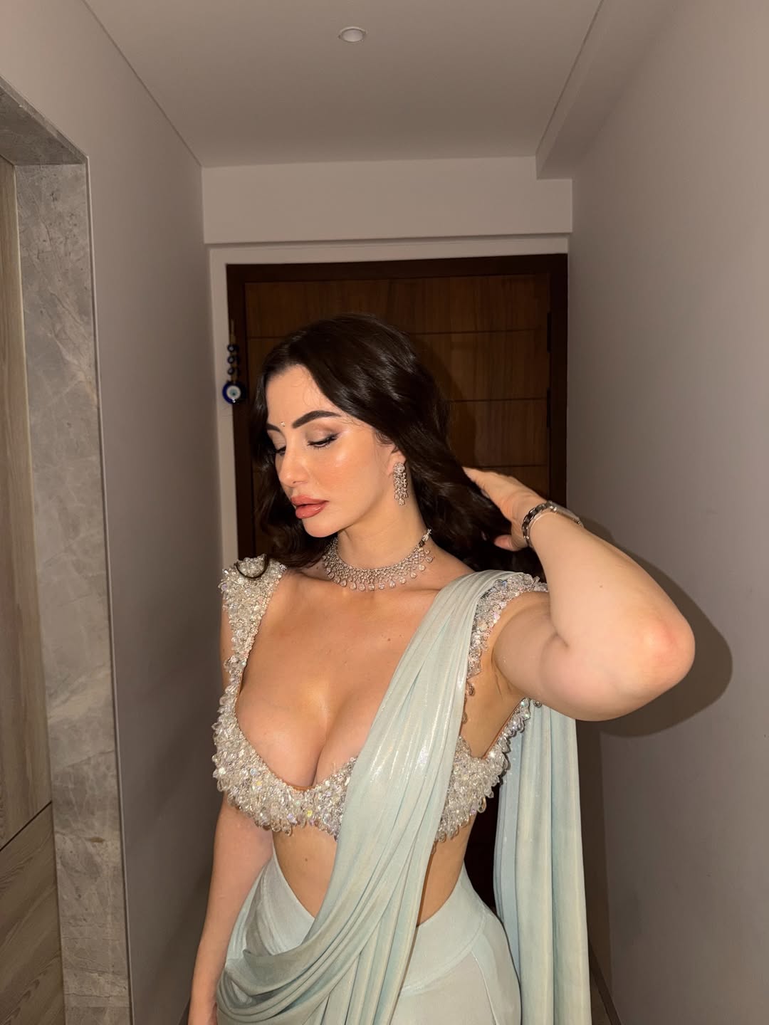 In this sultry studio shot, Giorgia Andriani serves major soft girl mf era vibes — effortlessly seductive yet effortlessly cool. With her long, tousled dark waves cascading over one shoulder, piercing gaze, and a soft baby-blue halter top paired with low-slung white bottoms, the Italian beauty looks confident, sensual, and completely in her element. Captured by @official.khushal.photography with creative support from @dynamitepikachu, the image perfectly captures her blend of European charm and bold Indian industry appeal.