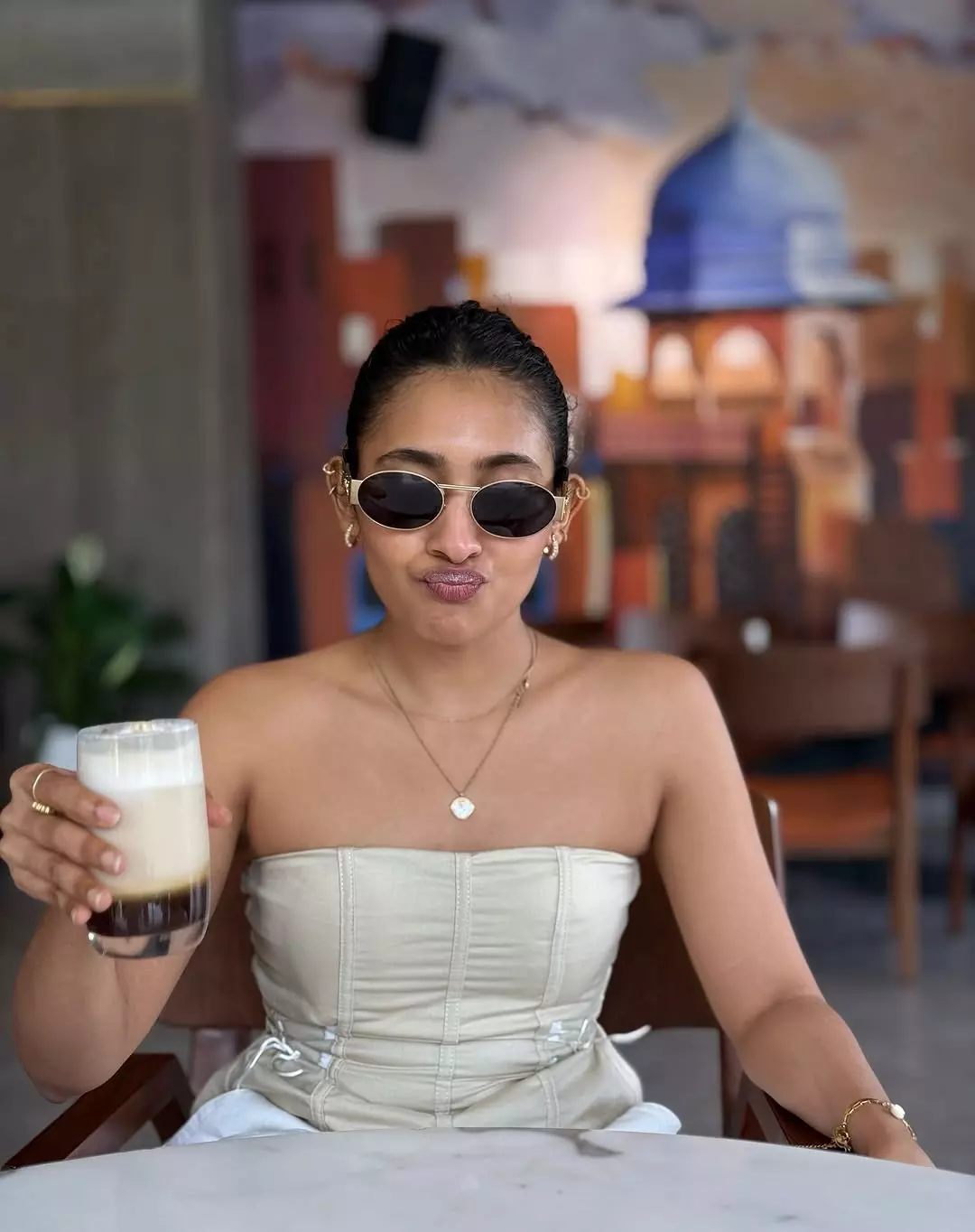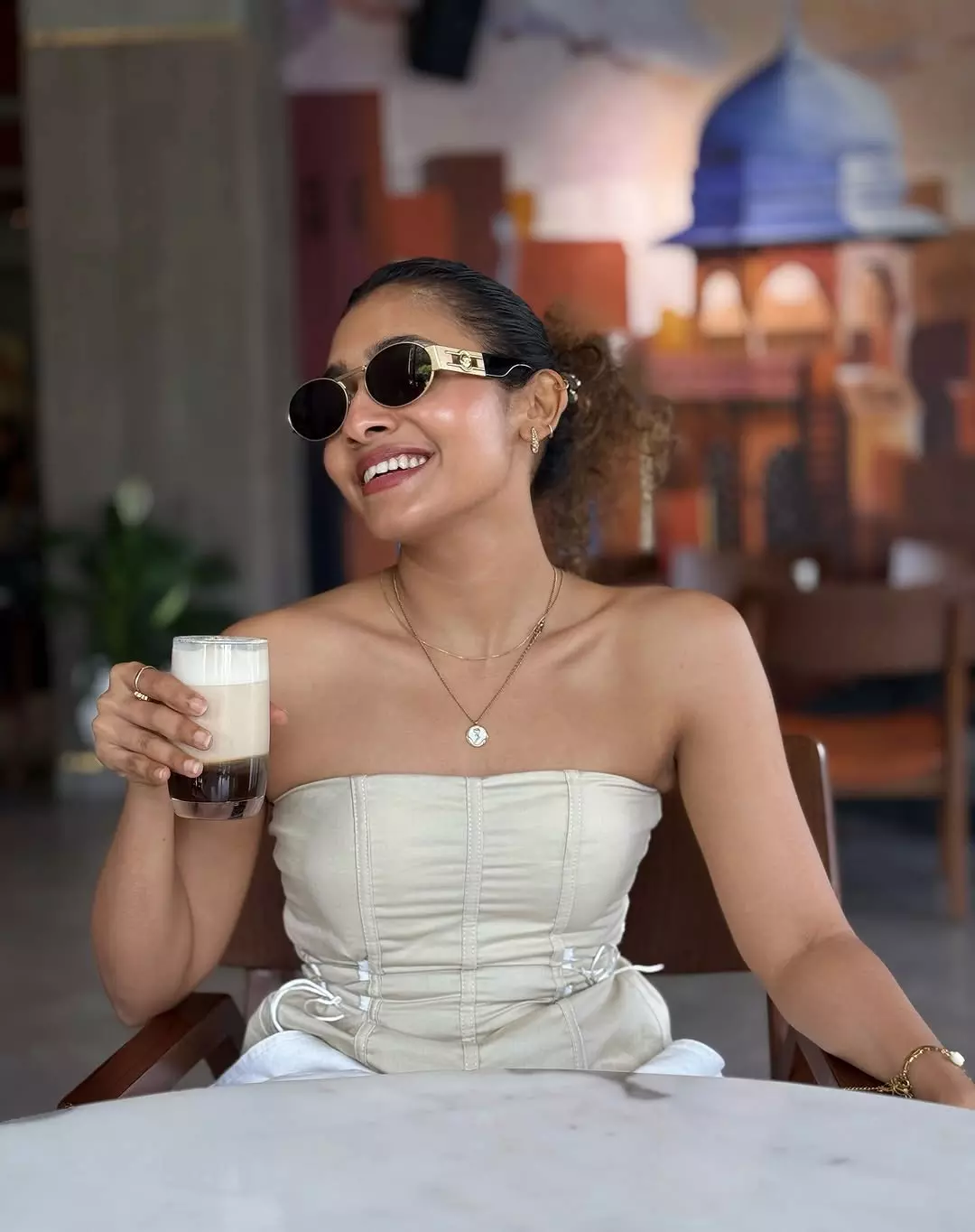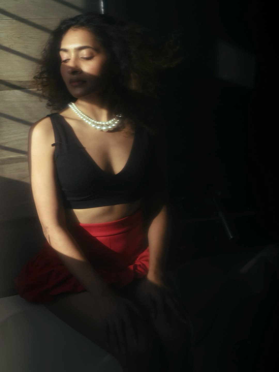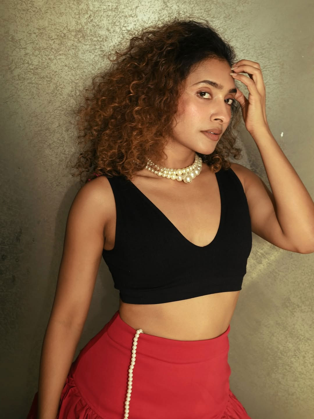 Gnaneshwari often shares her pictures from photo shoots and trips on her social media pages. Recently, she took to Instagram to post a few pictures from her latest photoshoot. In these pictures, Gnaneshwari is seen wearing a black sleeveless crop top with a deep V-neckline and a high-waisted red skirt. She opted for layered pearl necklaces as accessories. With minimal jewellery and striking costumes, Gnaneshwari surely grabs our attention. Her striking poses made the pictures more beautiful. "She Eats, sleeps & walks," she captioned the picture. Within no time, the post went viral on social media, winning the hearts and likes of her followers.
