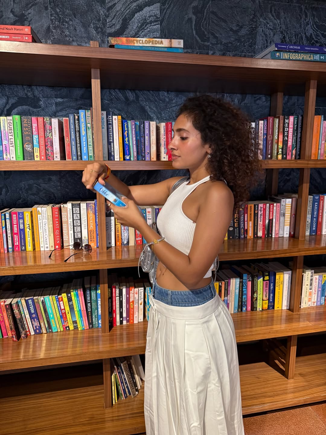 Gnaneshwari Kandregula shared a new picture today, and it has already become a favourite among her followers. In the photo, she stands in front of a long bookshelf filled with colourful books, looking relaxed and happy. Her simple white top, long skirt, soft curls, and silver bag give the picture a clean and peaceful look. The caption on the post reads, “What stories will you take home today?”.