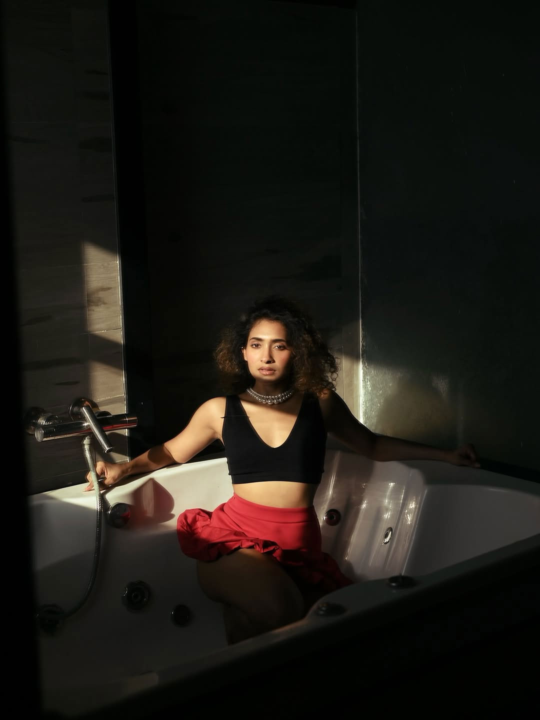 By: Tupaki Desk | 1 Jun 2025 4:00 AM ISTActress Gnaneswari Kandregula shared a powerful picture on Instagram that caught the attention of her fans. Sitting in a bathtub with dramatic lighting, she wore a black crop top, a red skirt and a pearl necklace. The photo was captured beautifully by @armaani-_photography. She captioned it, “She wearing her inner goddess with Goddess Kingdom!”