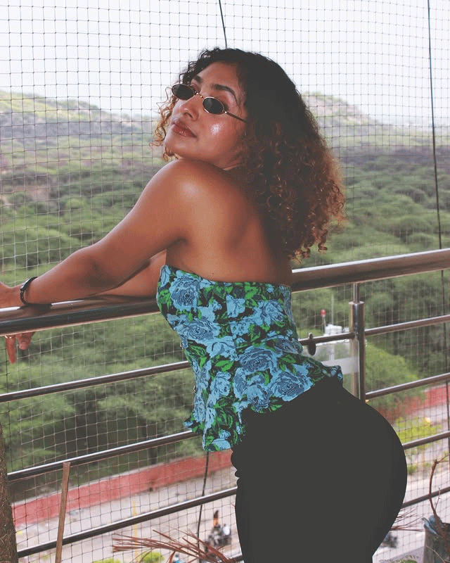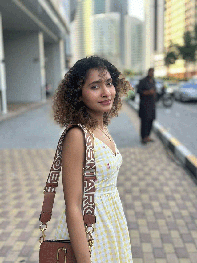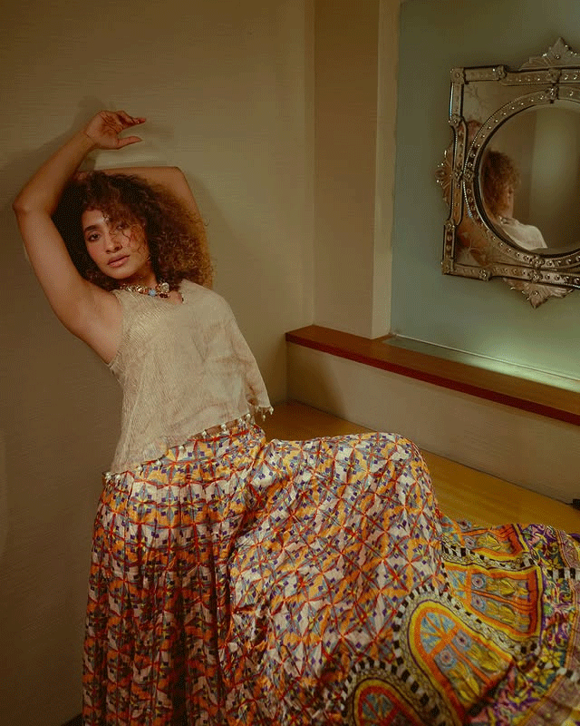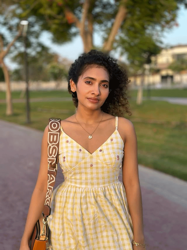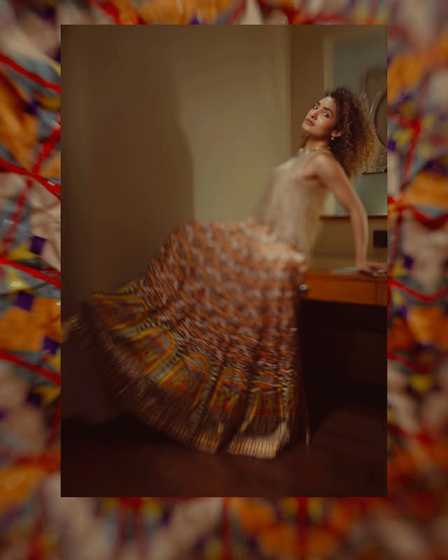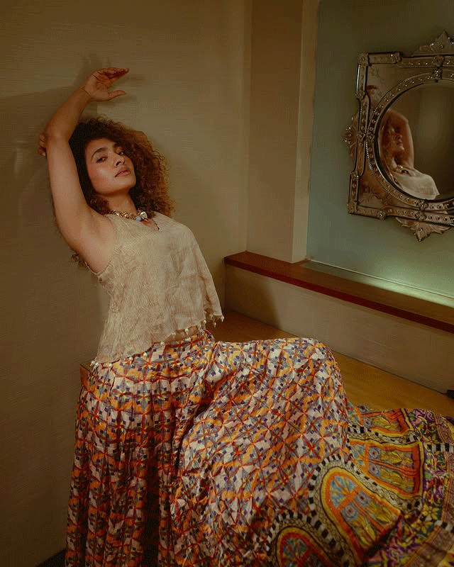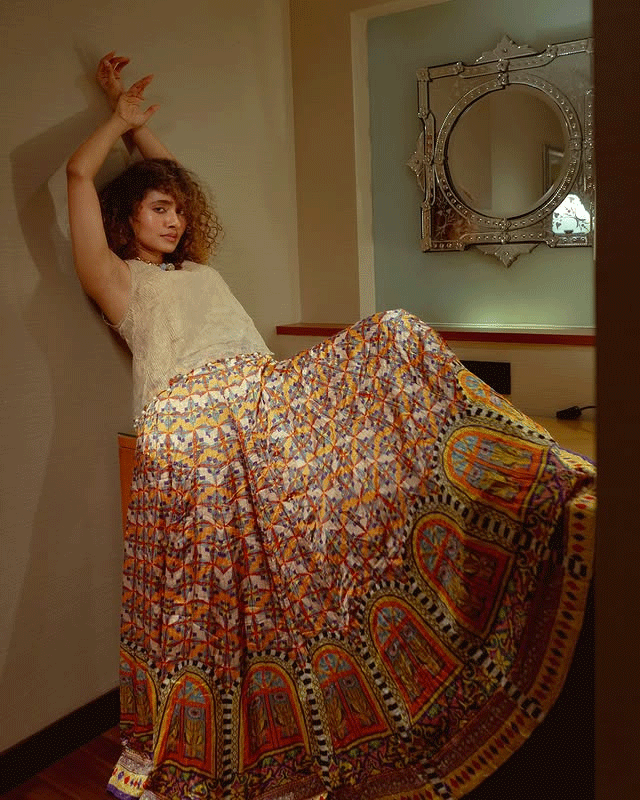 In the photo, Gnaneswari is seen gracefully at Courtyard by Marriott Chennai wearing a vibrant and detailed look from Saundh India. The patterns on her flowing piece burst with color creating a lively and artistic vibe. Her curly hair frames her face as she leans back. The pic is captured by photographer Ganesh Yoganathan drawing viewers into a world of style and culture.