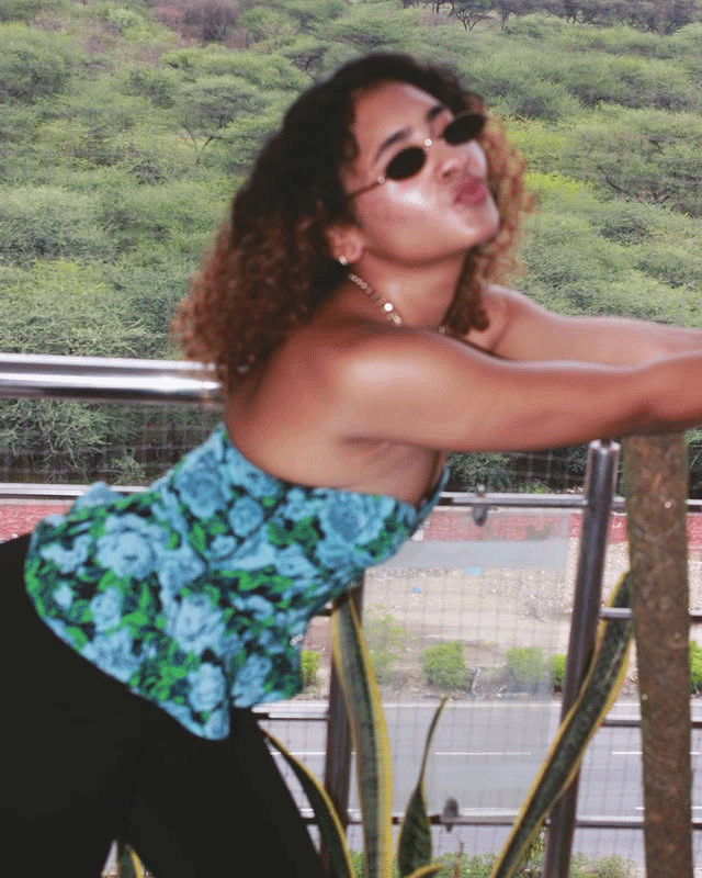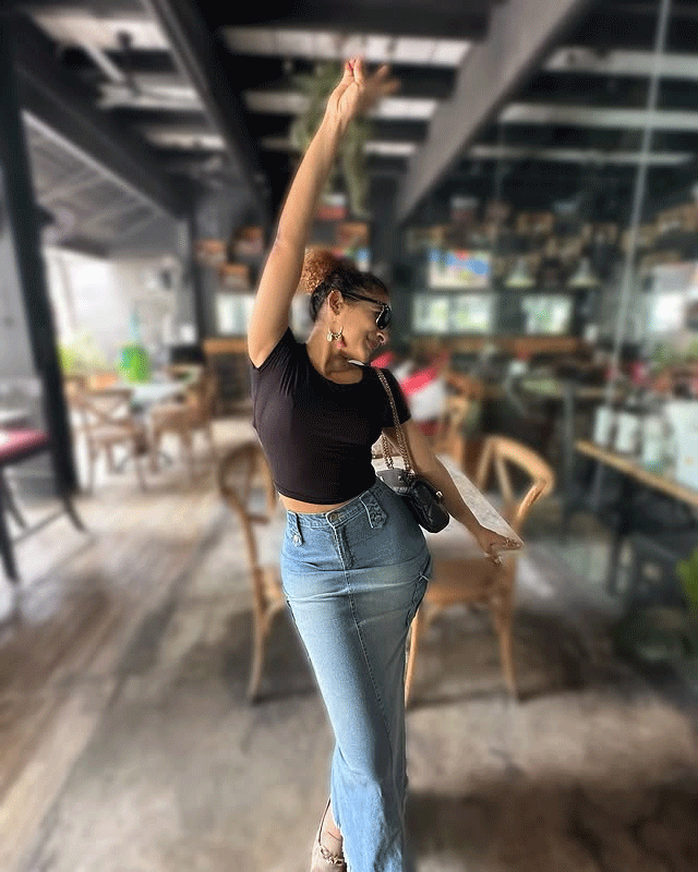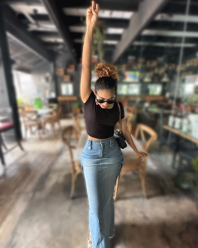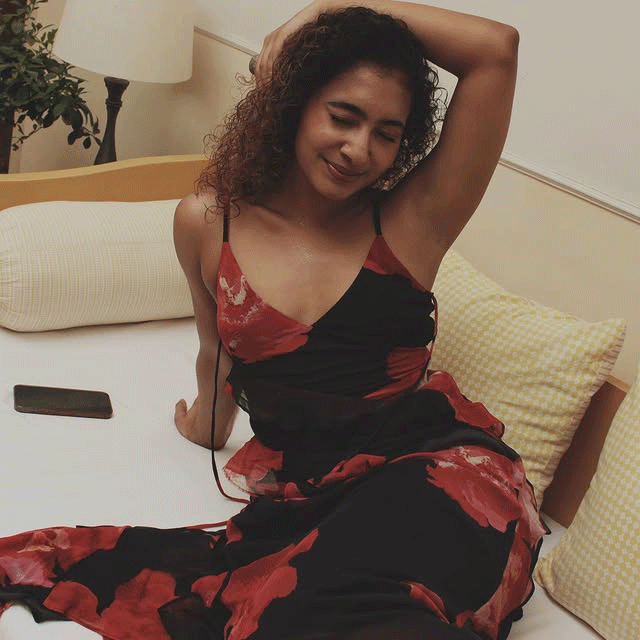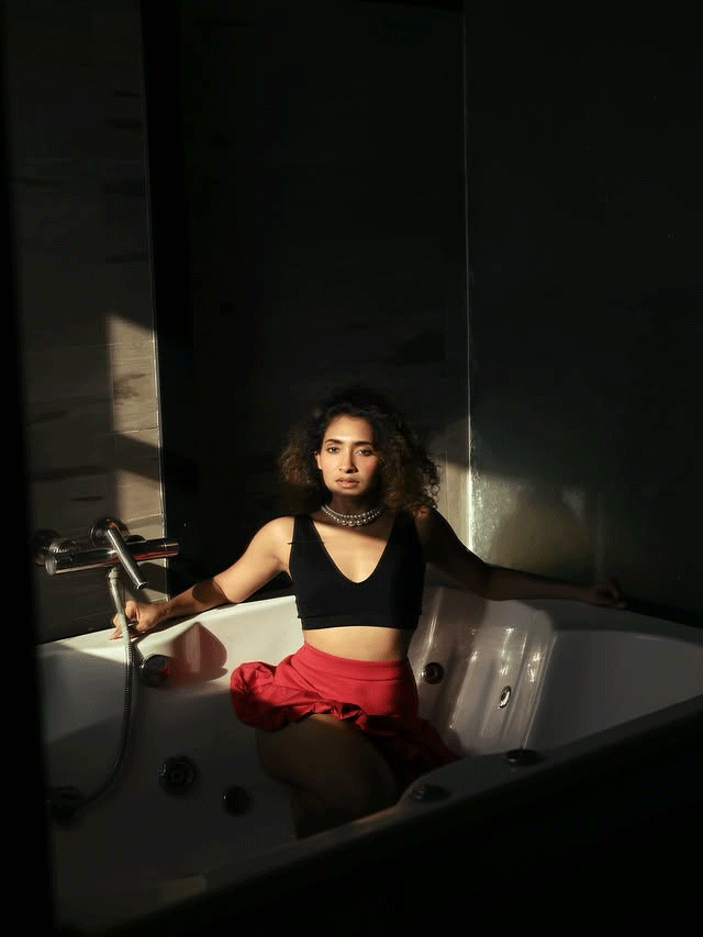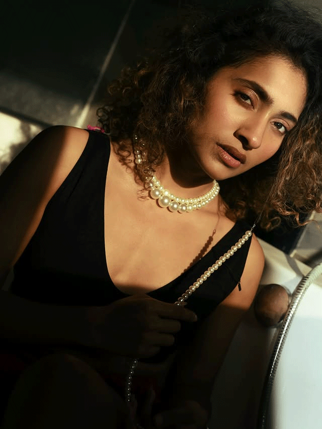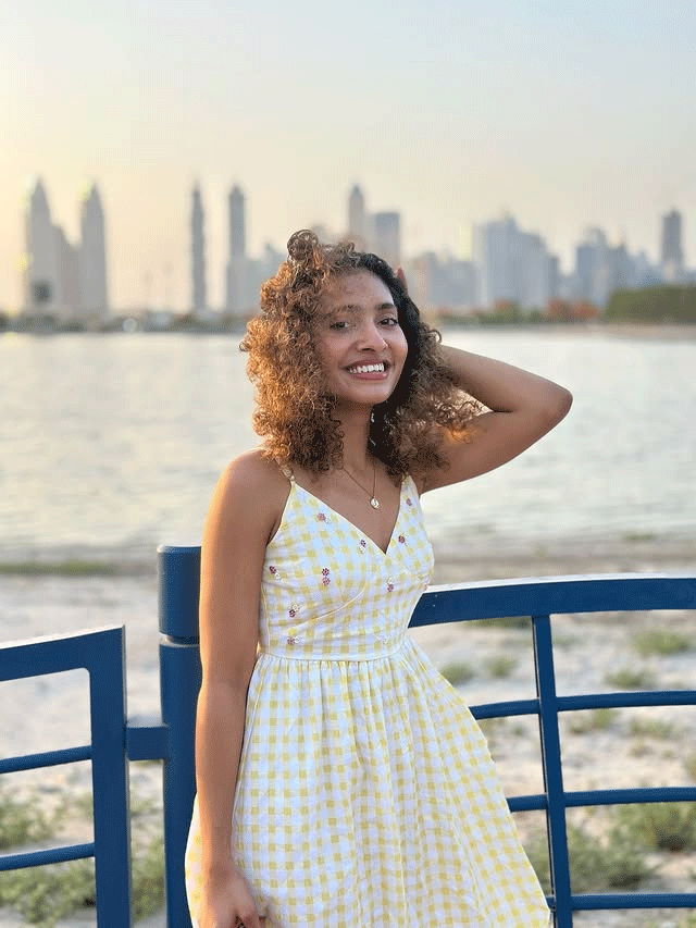 In the photo, Gnaneswari is seen gracefully at Courtyard by Marriott Chennai wearing a vibrant and detailed look from Saundh India. The patterns on her flowing piece burst with color creating a lively and artistic vibe. Her curly hair frames her face as she leans back. The pic is captured by photographer Ganesh Yoganathan drawing viewers into a world of style and culture.