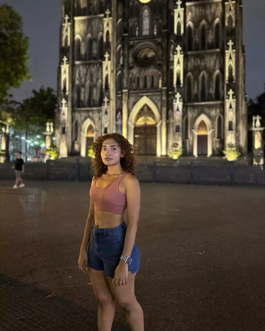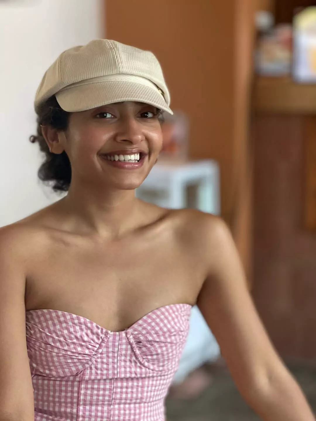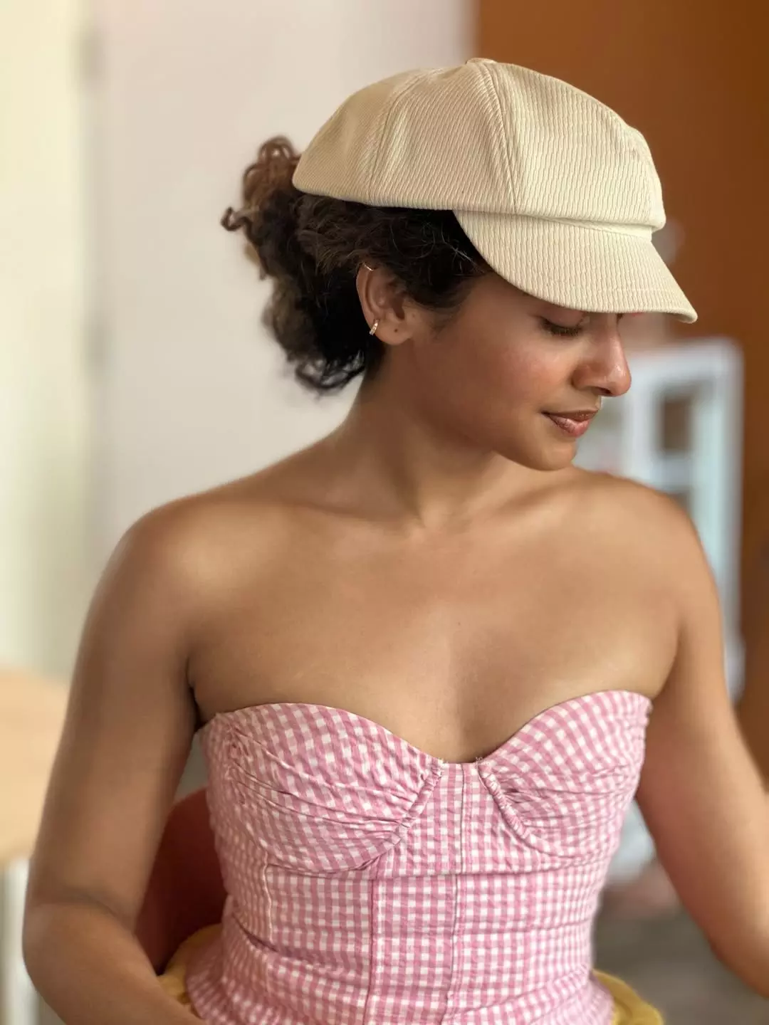 In the picture, Gnaneswari is seen wearing a light pink checkered strapless top paired with mustard yellow shorts decorated with small floral embroidery. She completed her look with a beige cap giving the whole dress a relaxed and cheerful vibe. The photo was clicked in a cozy café. Gnaneswari’s caption, “Live, let live.”