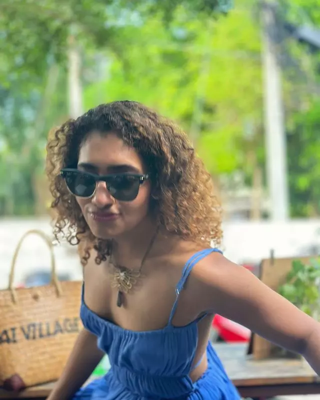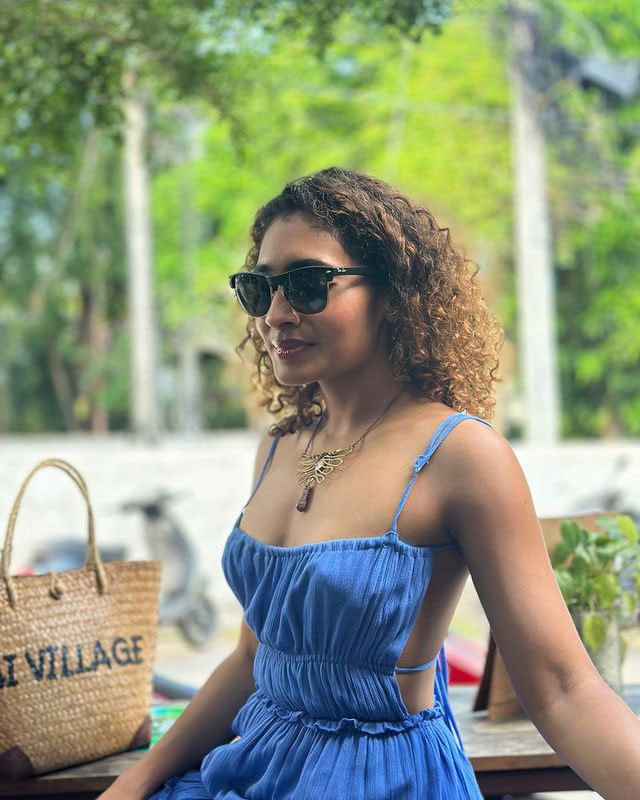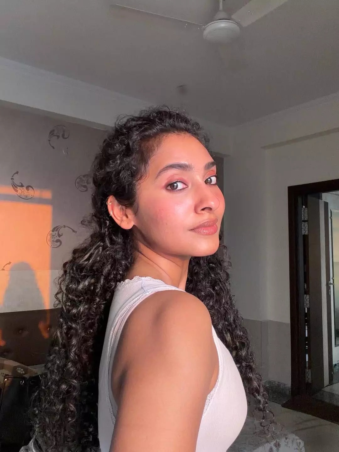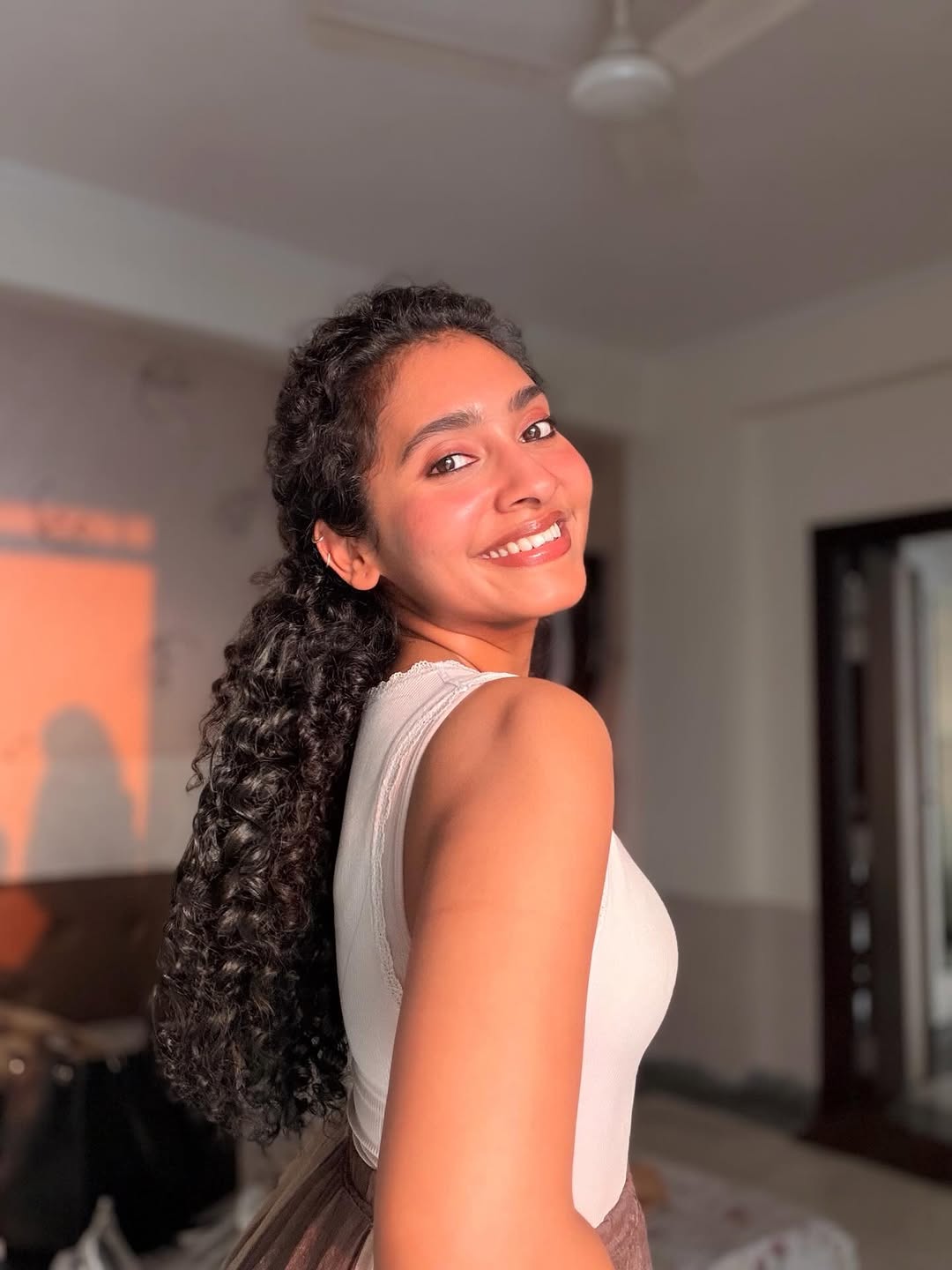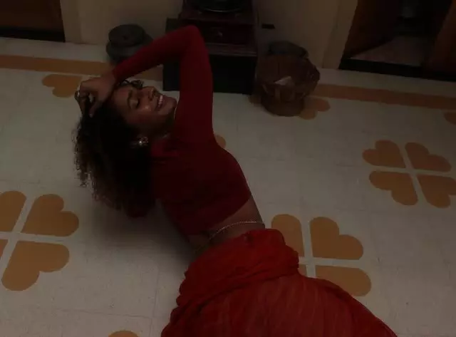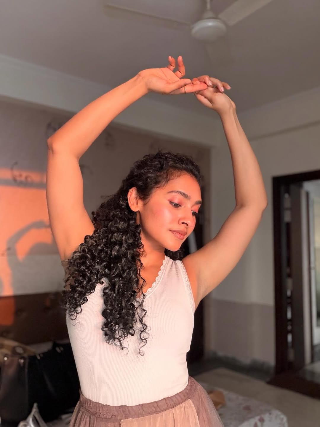 Dressed in a simple, sleeveless ribbed white top and comfortable bottoms, Gnaneswari embraces minimalism with elegance, proving that true style comes from authenticity and ease. The soft lighting enhances her glowing complexion, highlighting her fresh, makeup-free look and emphasizing her natural features and healthy skin.