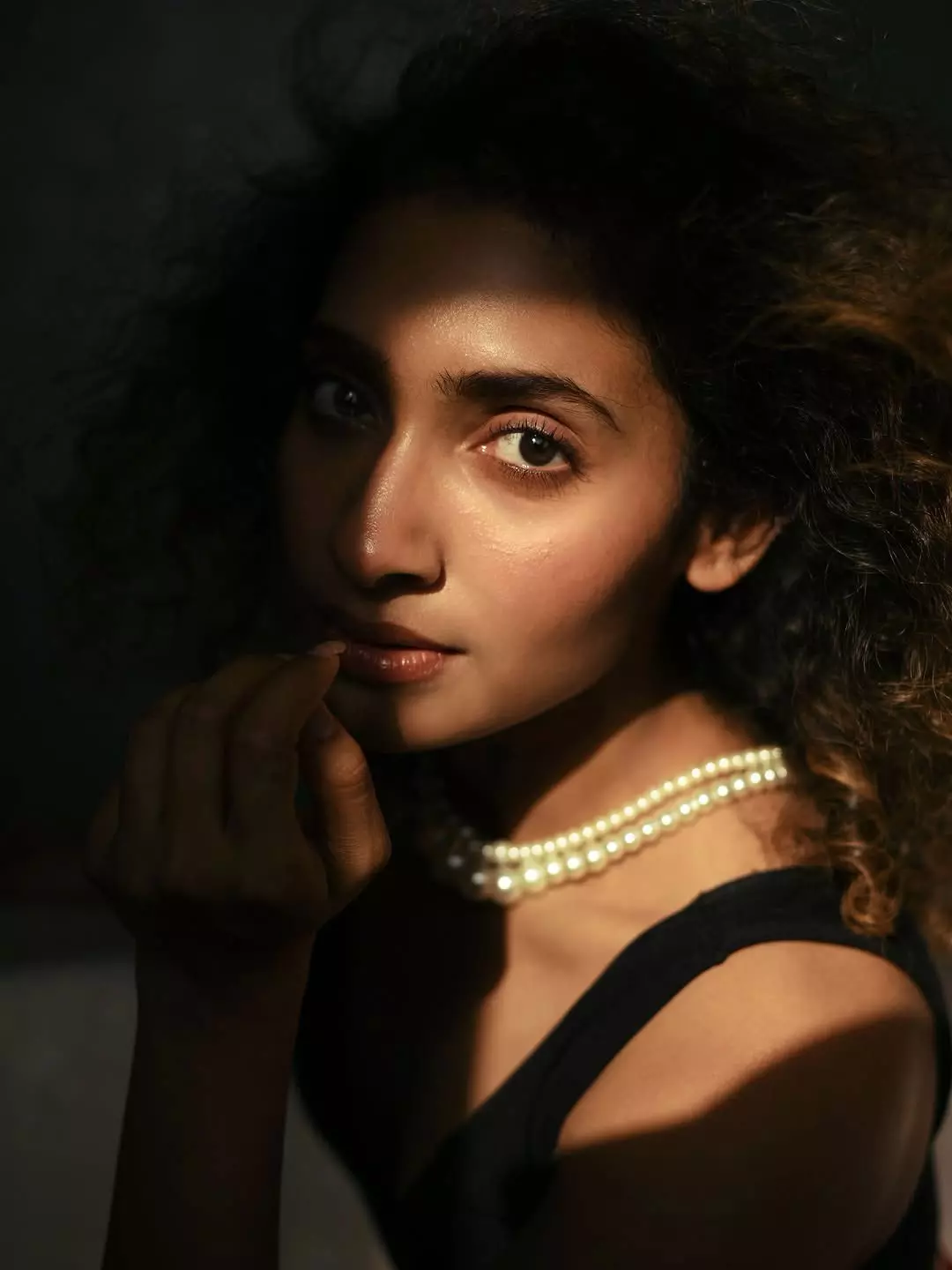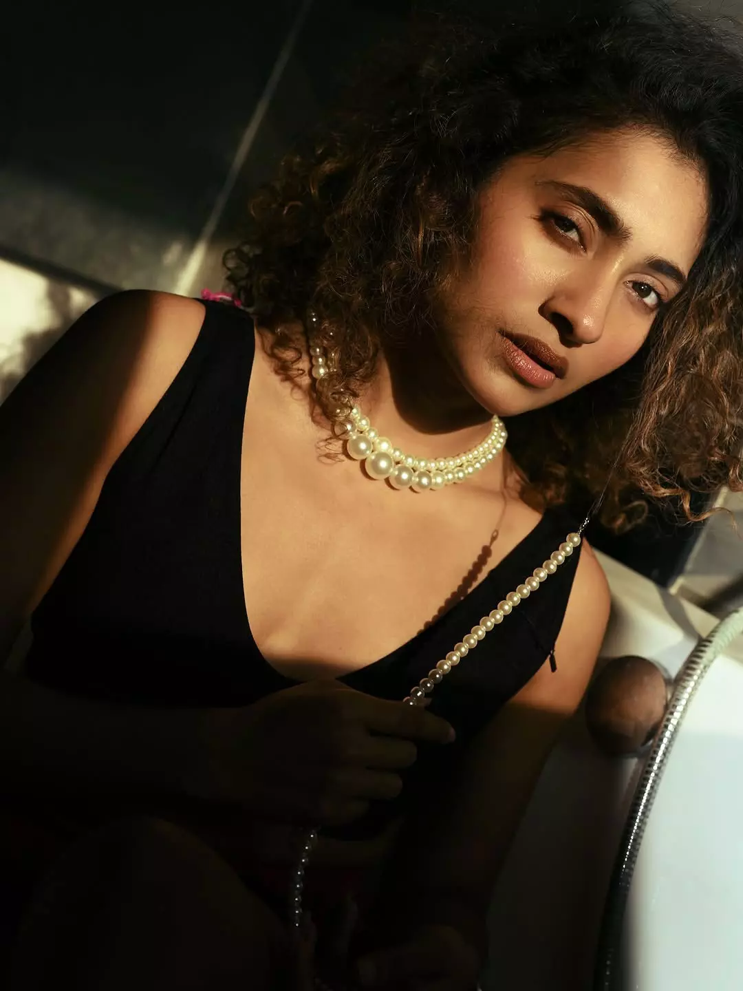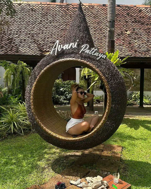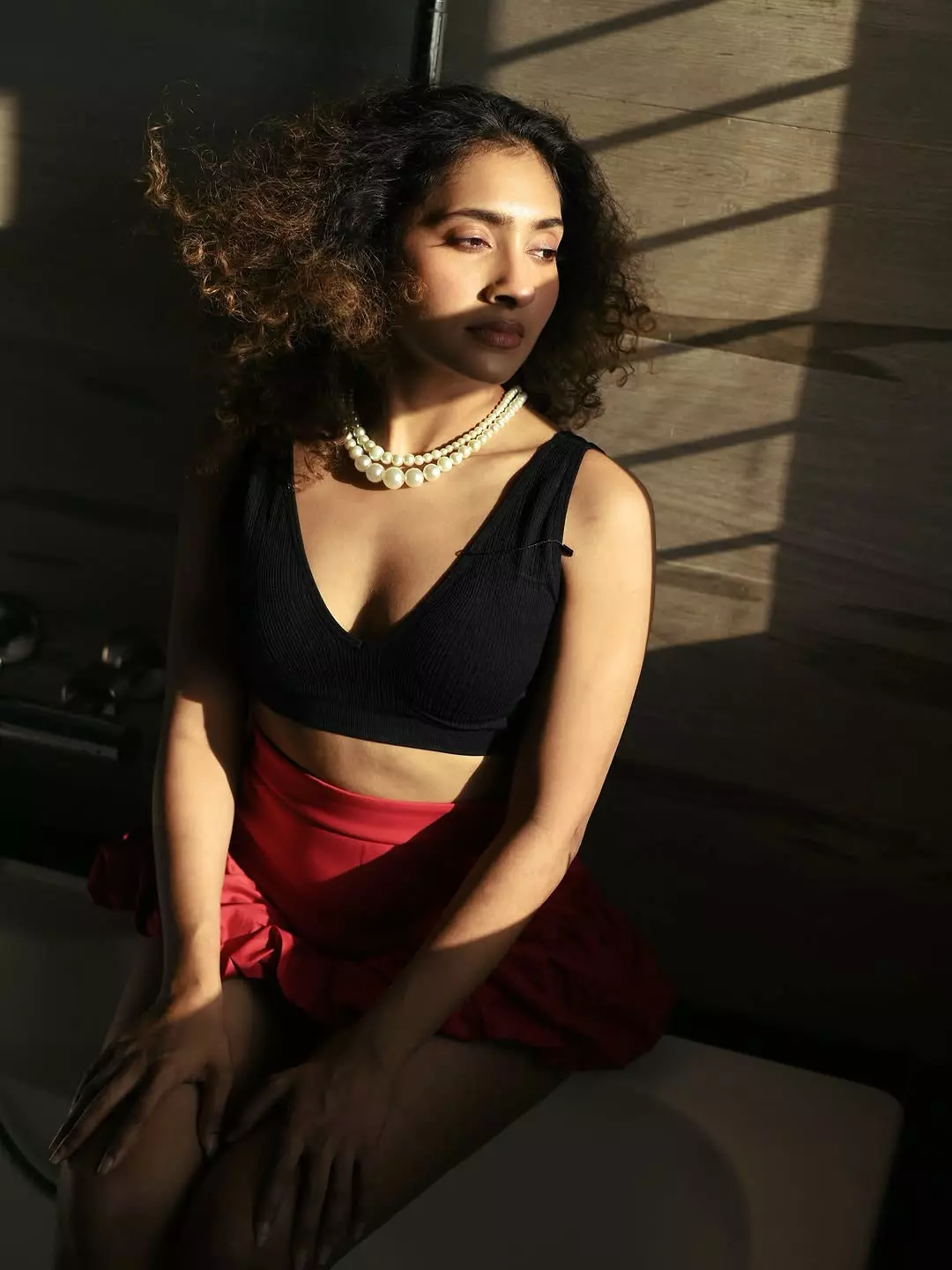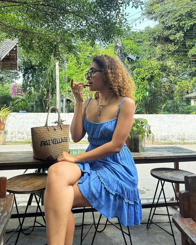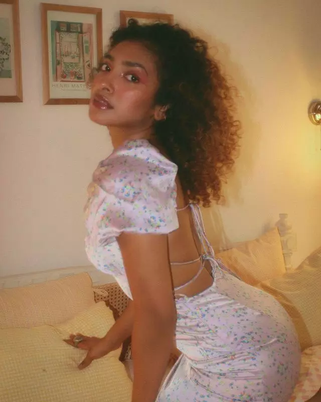 Dressed in a simple, sleeveless ribbed white top and comfortable bottoms, Gnaneswari embraces minimalism with elegance, proving that true style comes from authenticity and ease. The soft lighting enhances her glowing complexion, highlighting her fresh, makeup-free look and emphasizing her natural features and healthy skin.