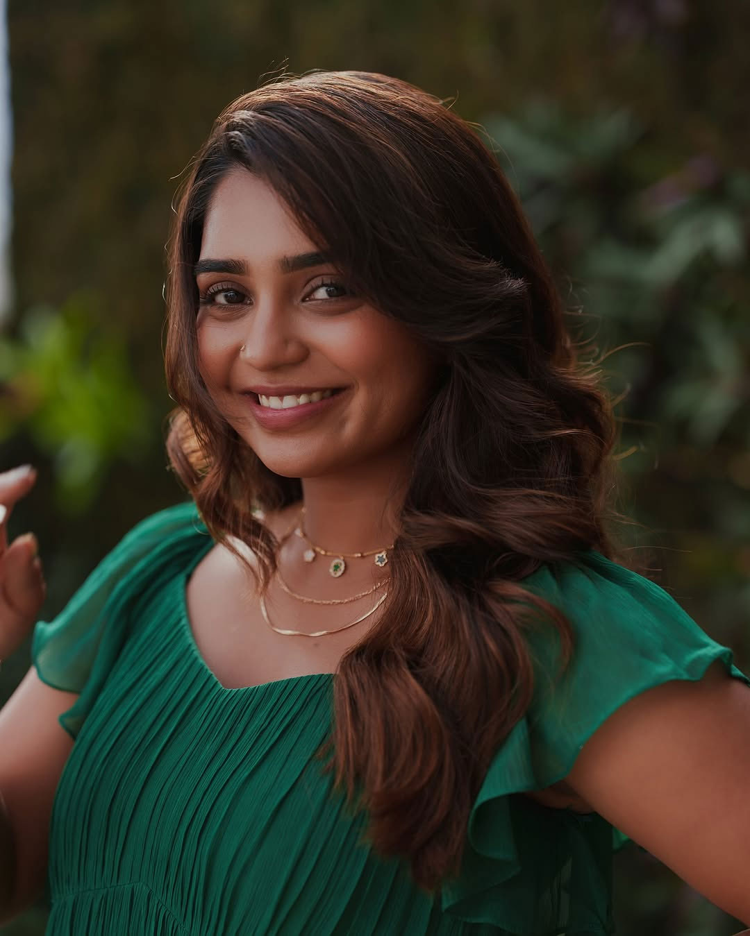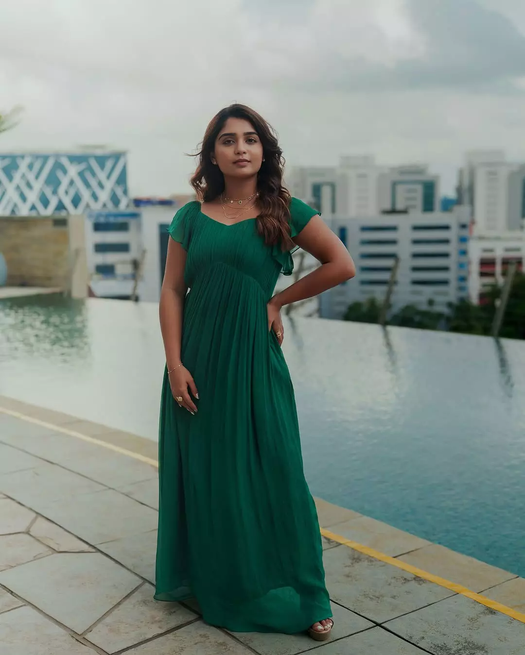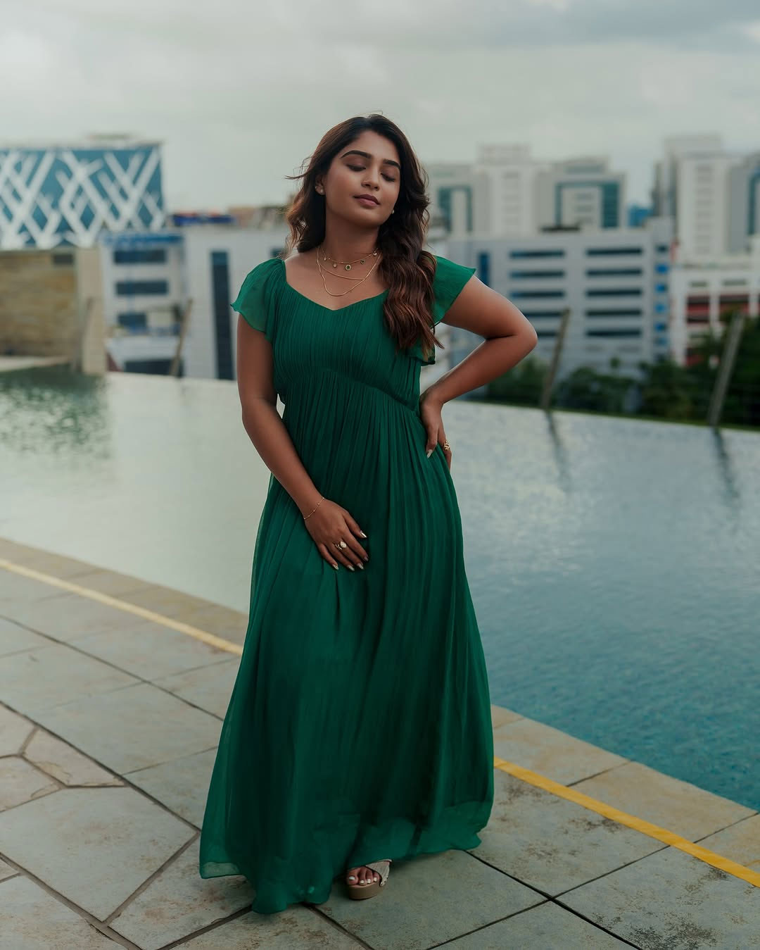 Gouri G Kishan shared a serene and stylish picture on Instagram standing gracefully by a poolside. She wore a flowing green dress that complemented the calm and refreshing vibe of the background. The backdrop of the city skyline added a modern touch to the photo making it a perfect blend of nature and urban charm.