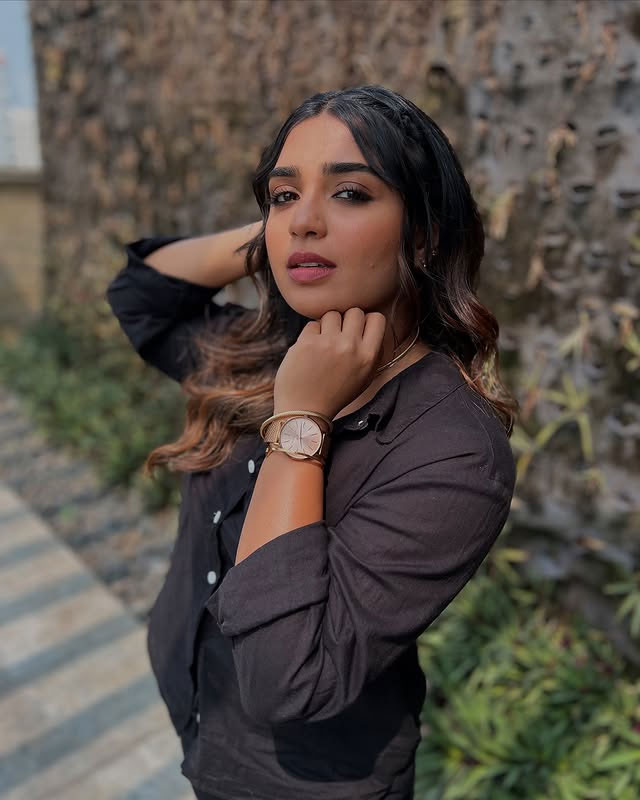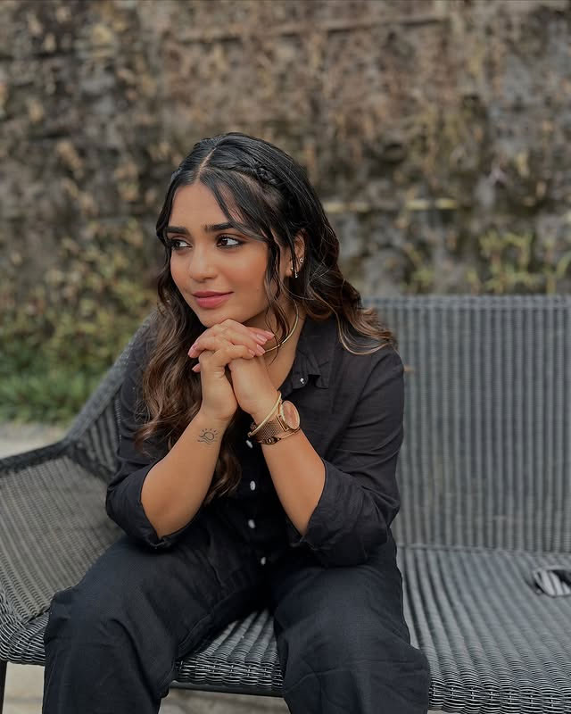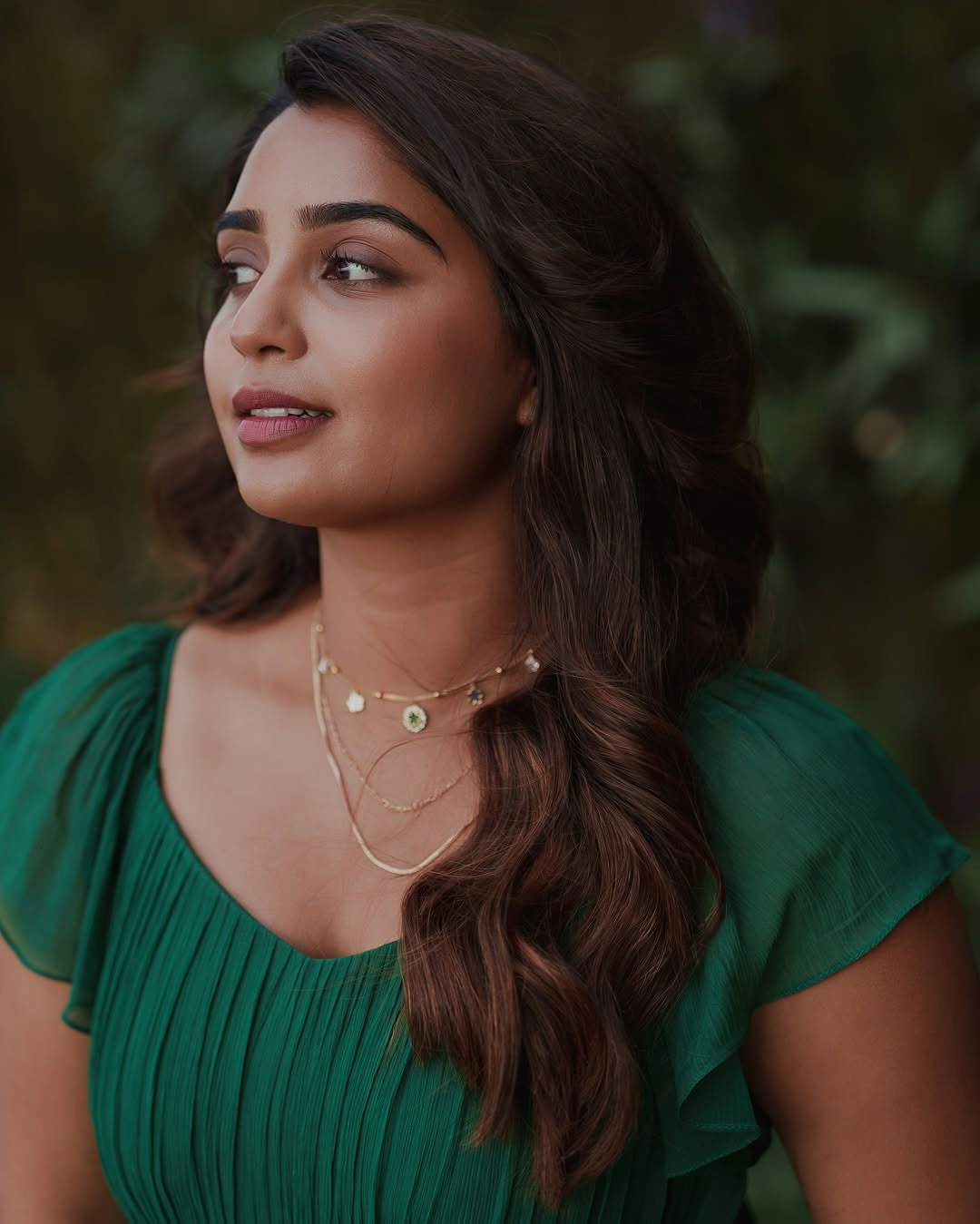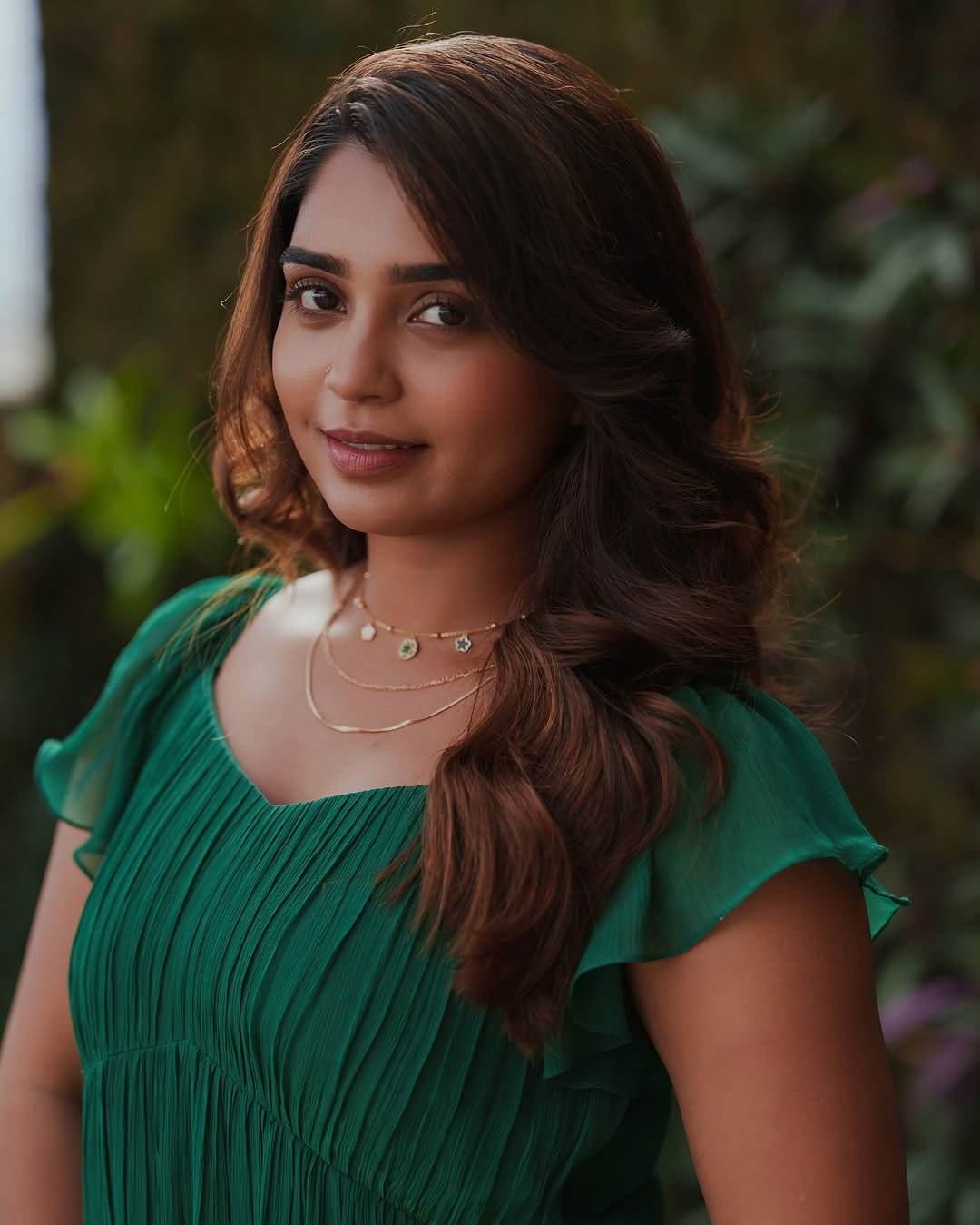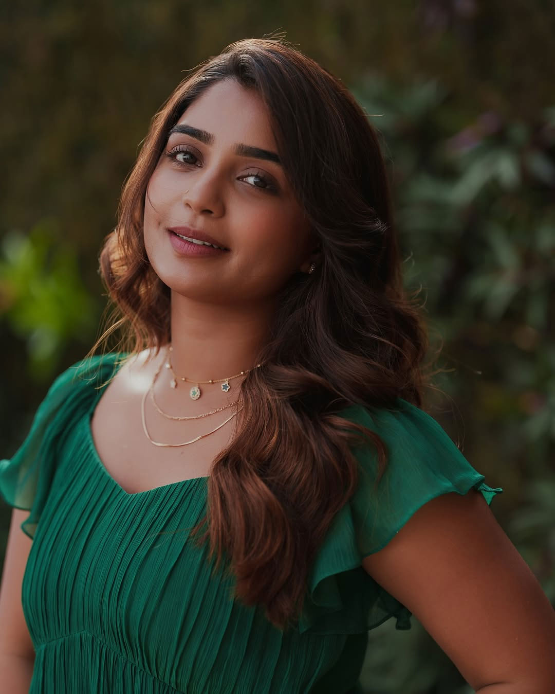 Gouri G Kishan shared a serene and stylish picture on Instagram standing gracefully by a poolside. She wore a flowing green dress that complemented the calm and refreshing vibe of the background. The backdrop of the city skyline added a modern touch to the photo making it a perfect blend of nature and urban charm.