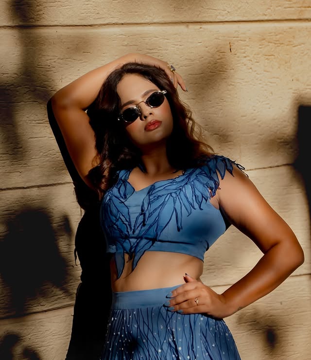 Actress Nandita Swetha steals the spotlight yet again with her effortless charm and floral flair! Dressed in a soft pastel lehenga with elegant floral prints, mirror work on the blouse and waistband, and a striking royal blue dupatta, she perfectly blends tradition with trend. Her look is elevated with bold round sunglasses, statement jhumkas, and silver bangles serving major fashion goals with that boss-lady attitude!