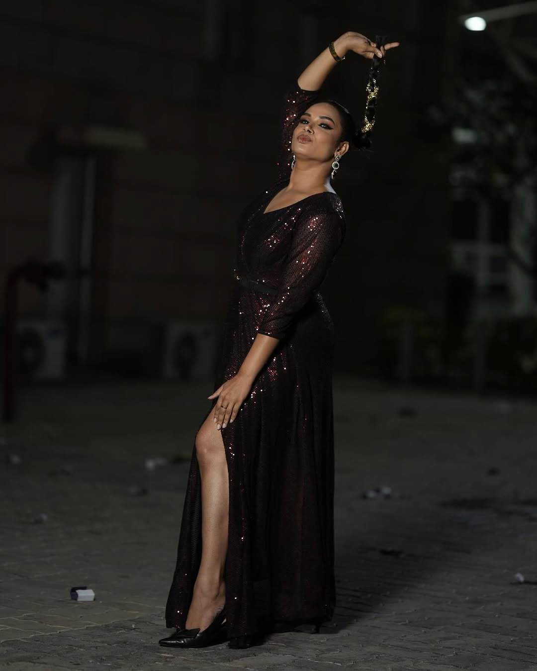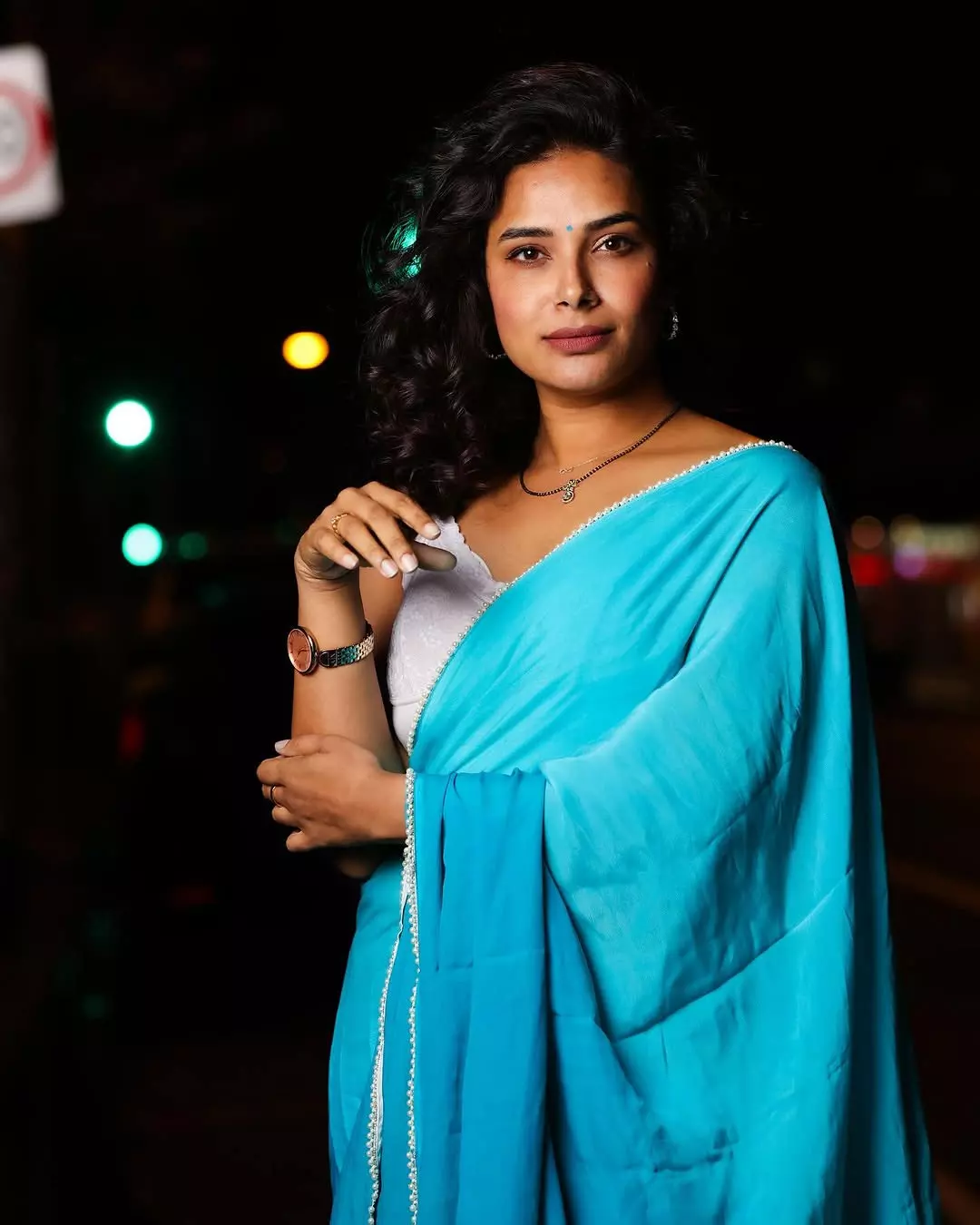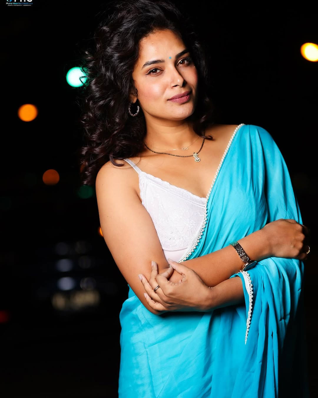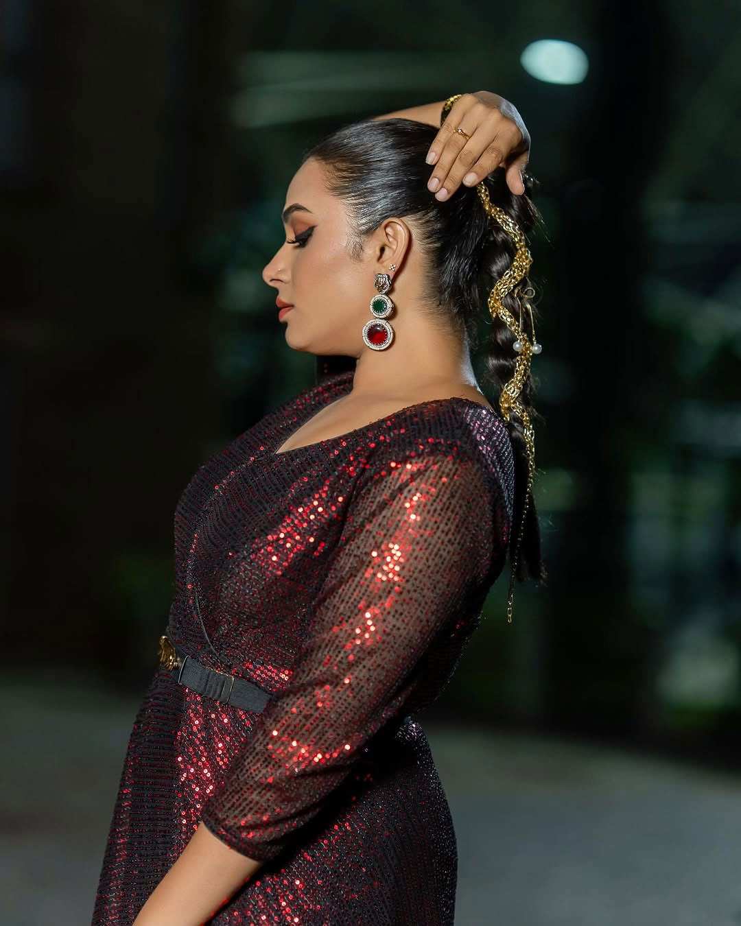 Her hair is styled in a sleek braid, and she wears statement earrings, completing the elegant look. Hari Teja's makeup is done by @lush-_makeovers.