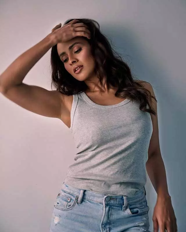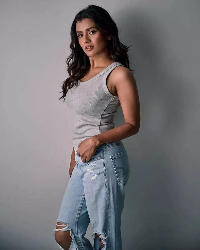 Actress Hebah Patel stuns in a laid-back yet ultra-cool outfit, donning a fitted grey tank top and ripped light-wash jeans. Her effortless pose and natural glow make this casual ensemble a total style statement. Known for her bold roles and expressive performances, Hebah continues to evolve both on and off screen.