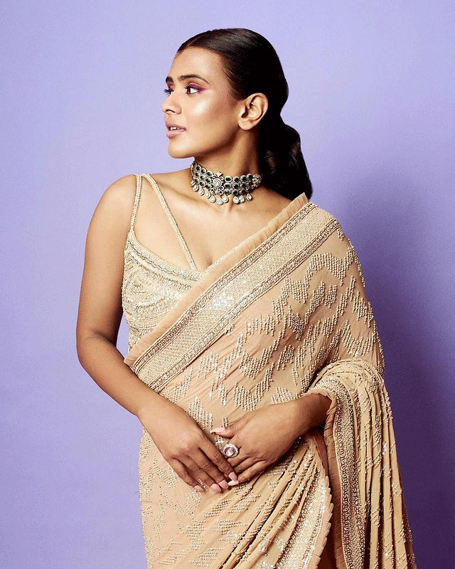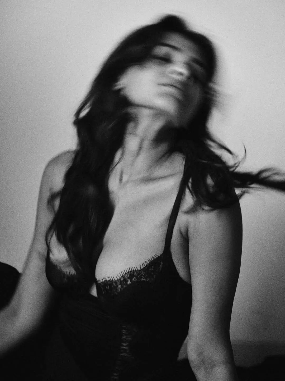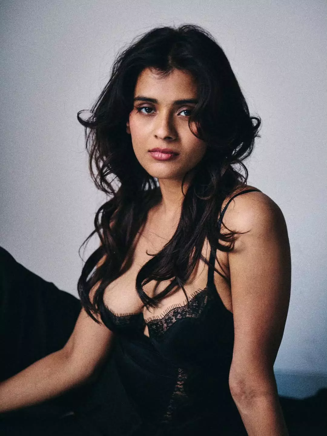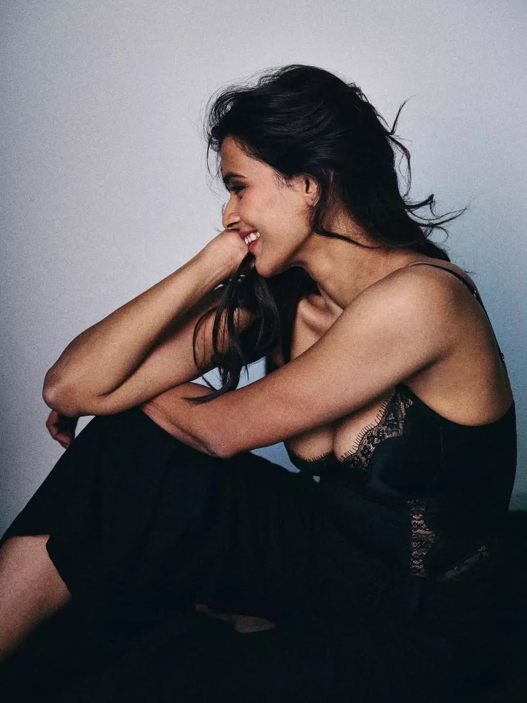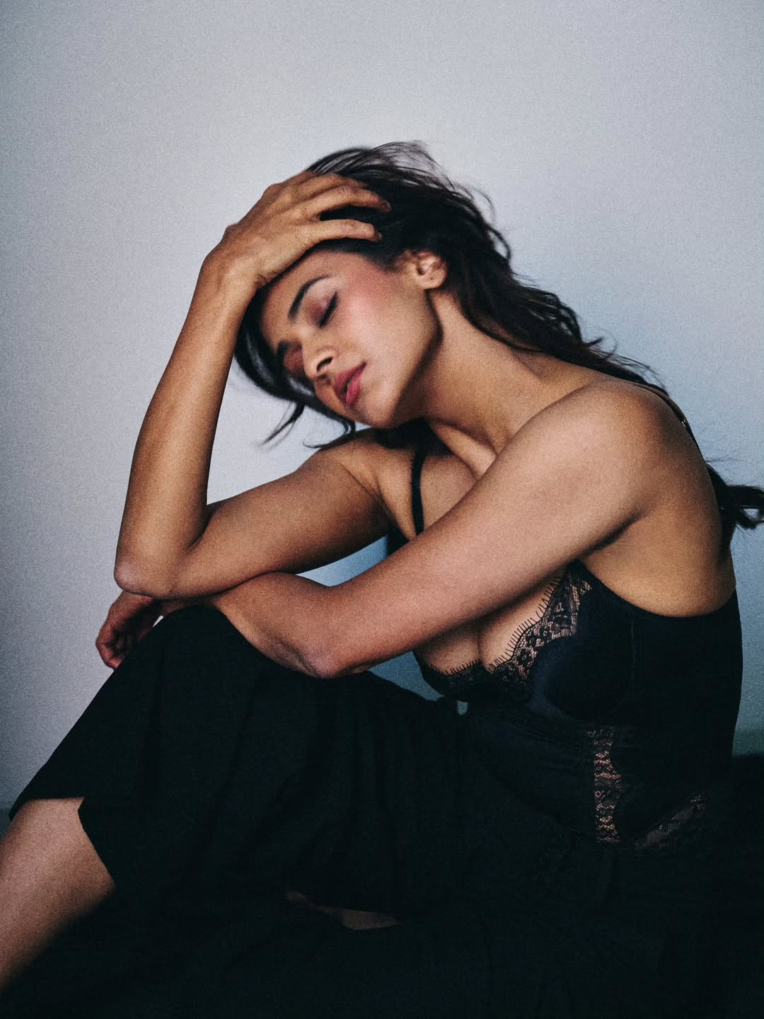 her glamorous side against a minimalist backdrop. The delicate lace detailing highlights her poised sensuality and timeless appeal.