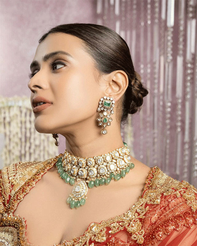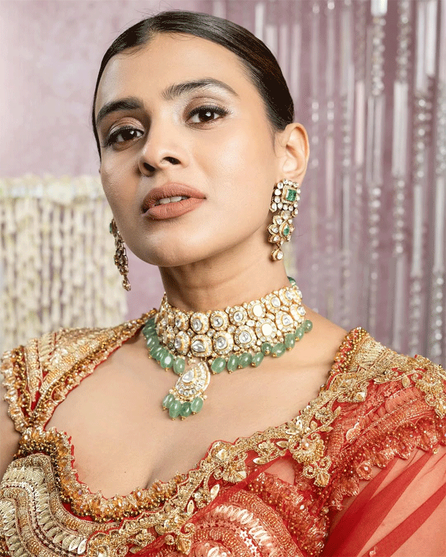 Hebah Patel recently shared a photo on Instagram wearing a shimmering nude beige saree by Dolly J Studio.