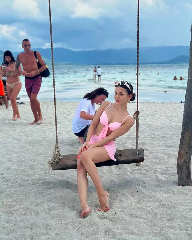 Her halter-style bikini top, adorned with delicate floral patterns, strikes the perfect balance between elegance and playful summer vibes.