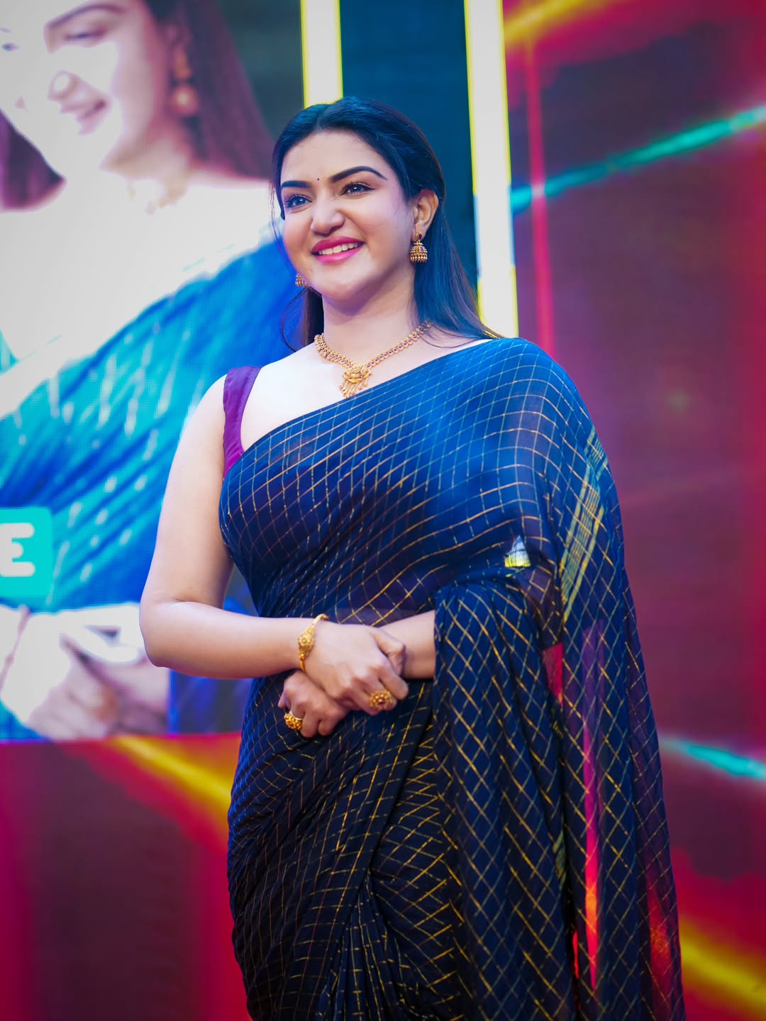 This graceful photo features Honey Rose in a sophisticated navy blue checkered saree with golden accents from @vaidehika_sarees, complemented by a deep purple sleeveless blouse. She accessorizes with traditional gold jewelry—necklace, jhumkas, bangle, and ring—while her sleek ponytail and subtle makeup enhance her serene expression. Credits: Photography @nidhinpaappi_photography, Costume @vaidehika_sarees, MUA and styled by @priyavas_makeup_artist @abhanyazen_makeupartist @imac_institute.