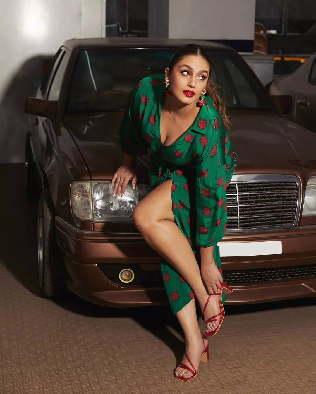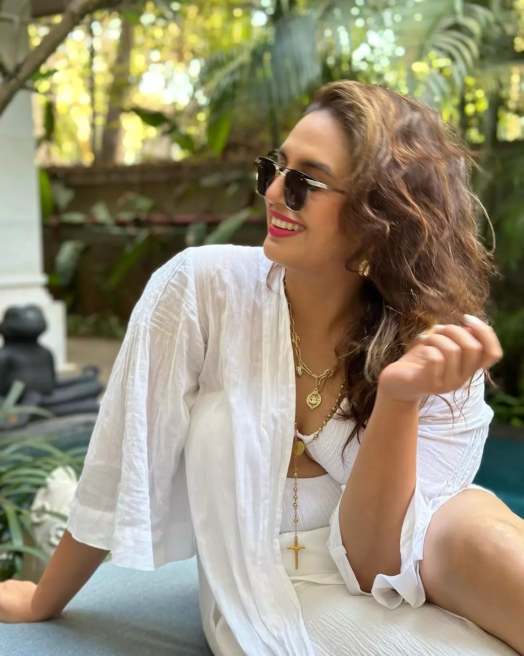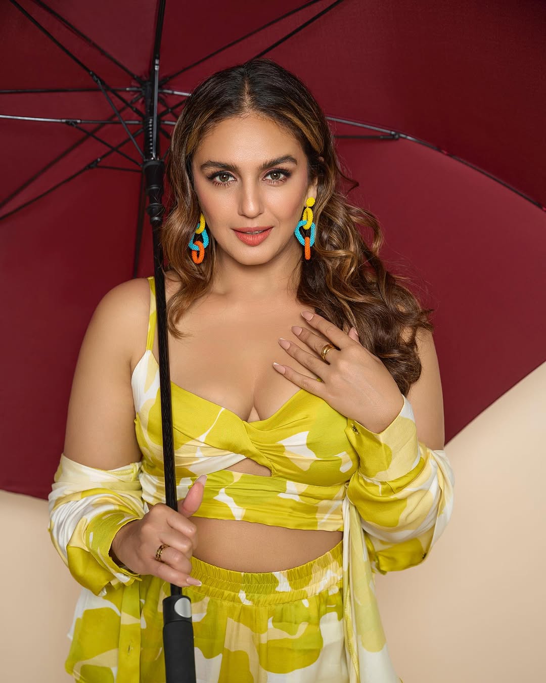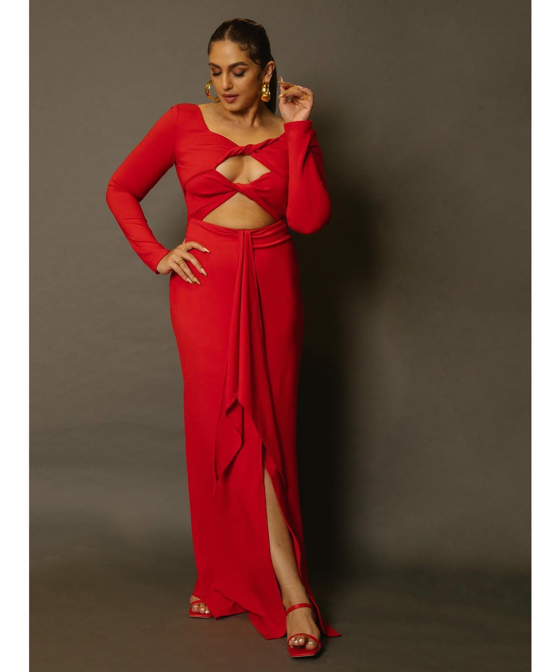 In the first look, Huma appears in a black dress with a clean and structured finish. The makeup and hair for this look were handled by Raksha Dairani Makeup and Hair. The dress was paired with stylish accessories, including jewellery from Anaqa Jewels, Mozaati, and Arvino Co. Sunglasses from Tribe India added a bold edge, while boots from The Oroh Life, coordinated through Elan Communications, completed the dress.