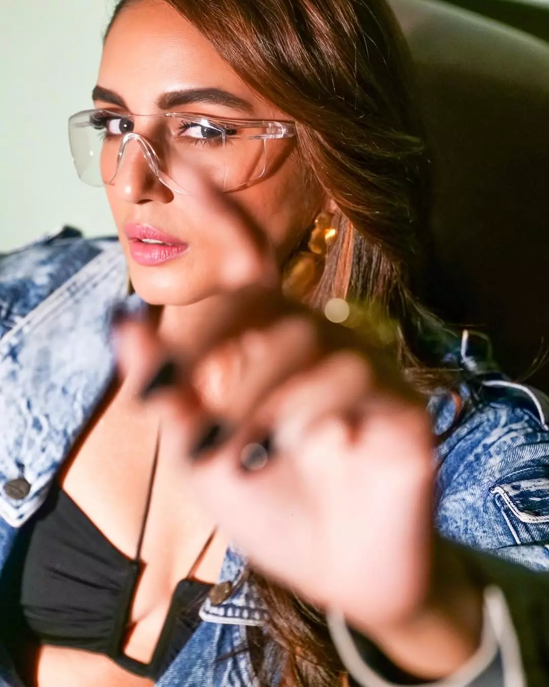 The second look features Huma in a denim dress but with a slightly darker and more intense tone. Styling was once again done by Sanjam Kaur 92. Makeup for this look was by Ajay V Rao 721, and hair was styled by Alisha Hair and Makeup. The custom black jacket and pants were designed by This Is Wearable. Earrings from Radhika Agrawal Studio and rings from Anaqa Jewels added a classy finish.