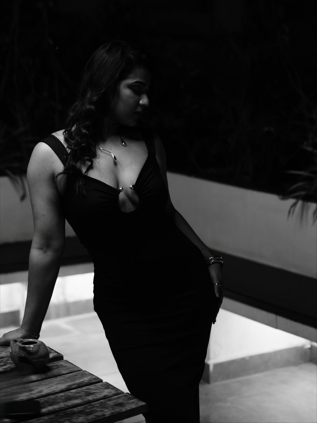 The black-and-white picture shows Inaya standing gracefully near a table, dressed in an elegant black dress. The photo captures her in a thoughtful pose, looking slightly down, which adds a mysterious feel to the frame. Her look, accessories, and the lighting of the image perfectly match the caption she wrote “Bittersweet 🍭♣️🖤”.