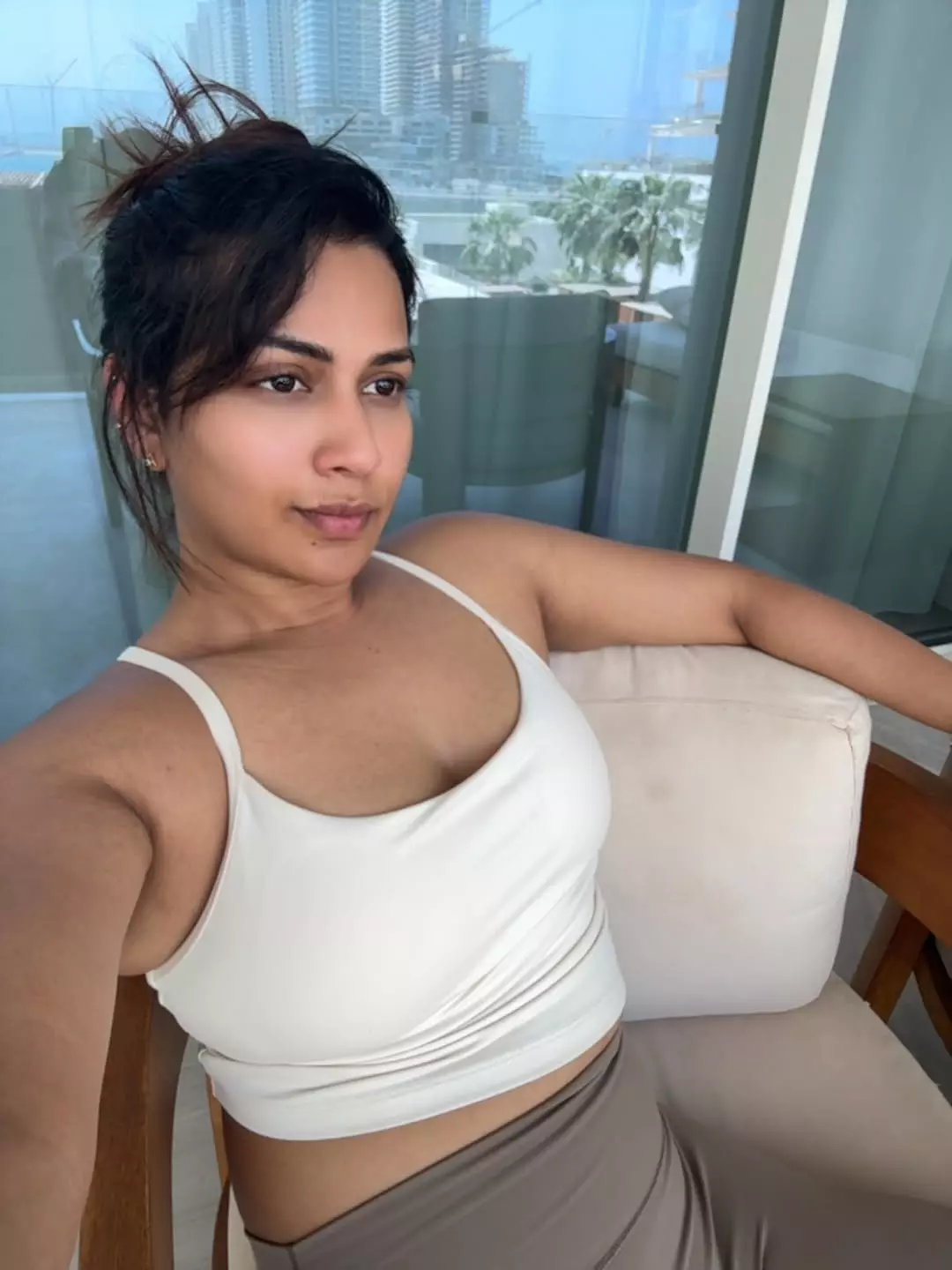 In the photo, Inaya wore a white sleeveless top paired with light brown leggings. She is seen sitting confidently while relaxing on a chair.