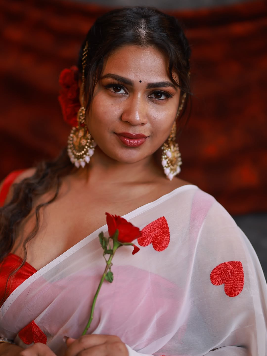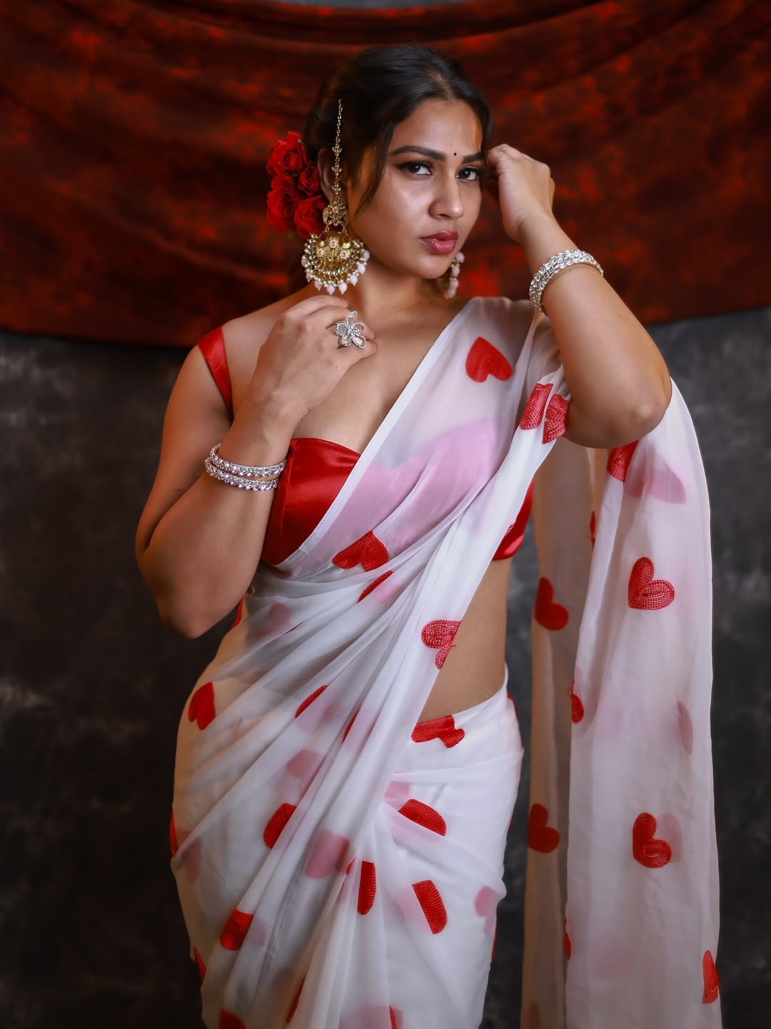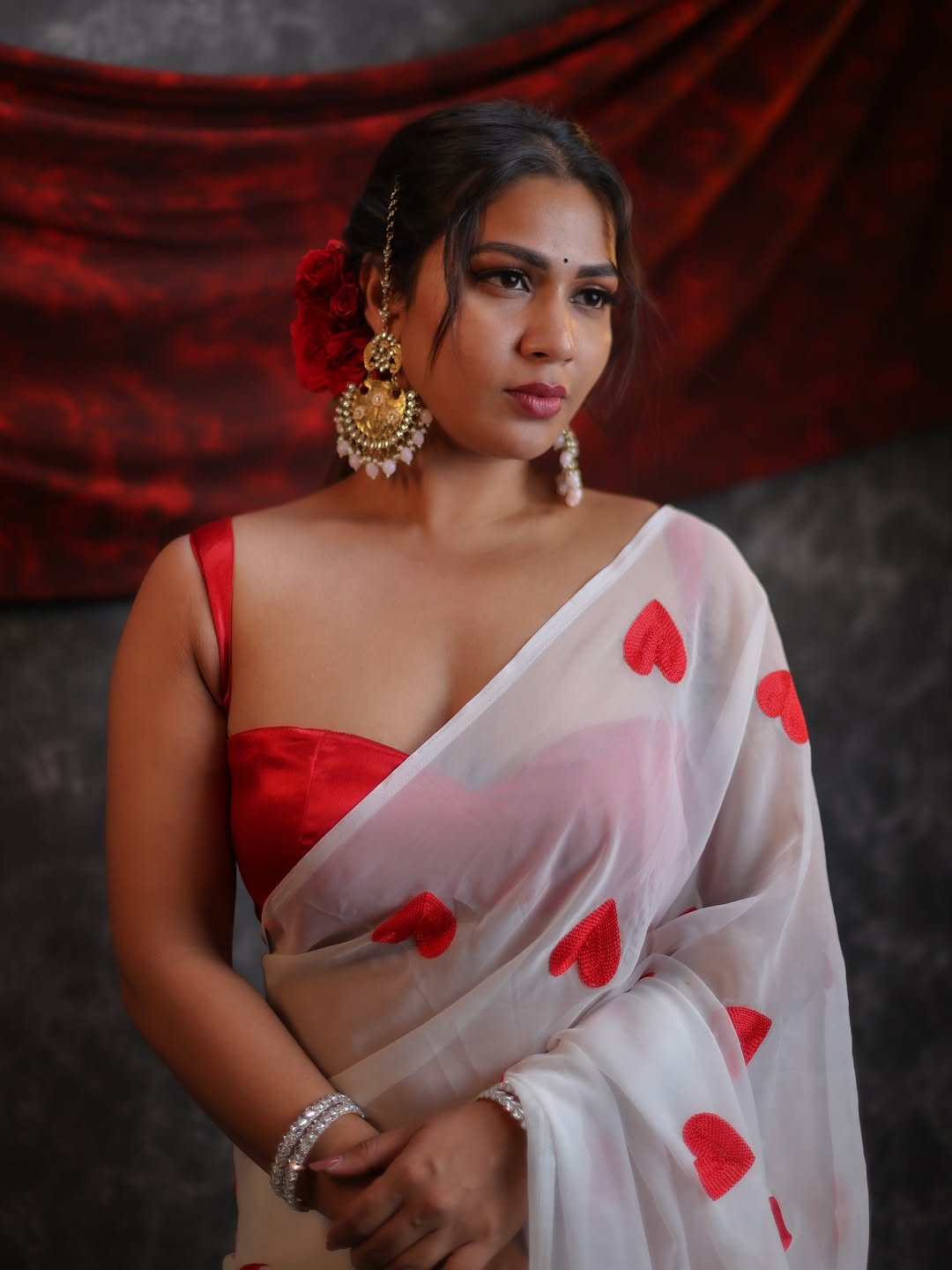 By: Tupaki Desk | 19 July 2025 10:37 AM ISTInaya Sultana is known for her captivating presence on screen. Recently an actress shared a photo getting all the attention. In this Instagram pic she is seen in a white saree adorned with red heart patterns.