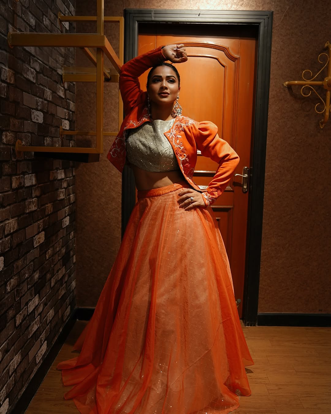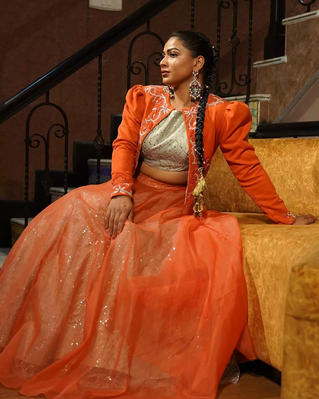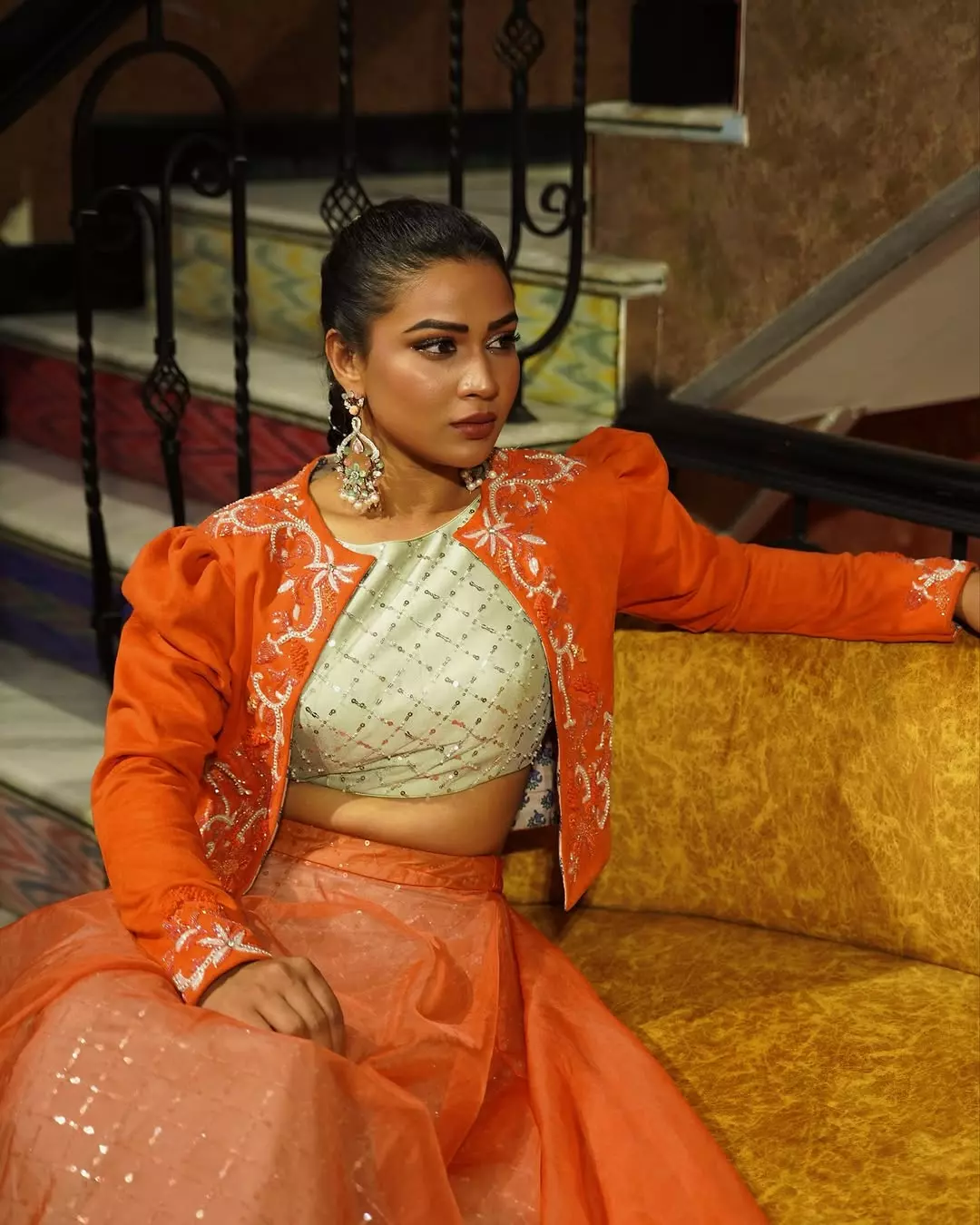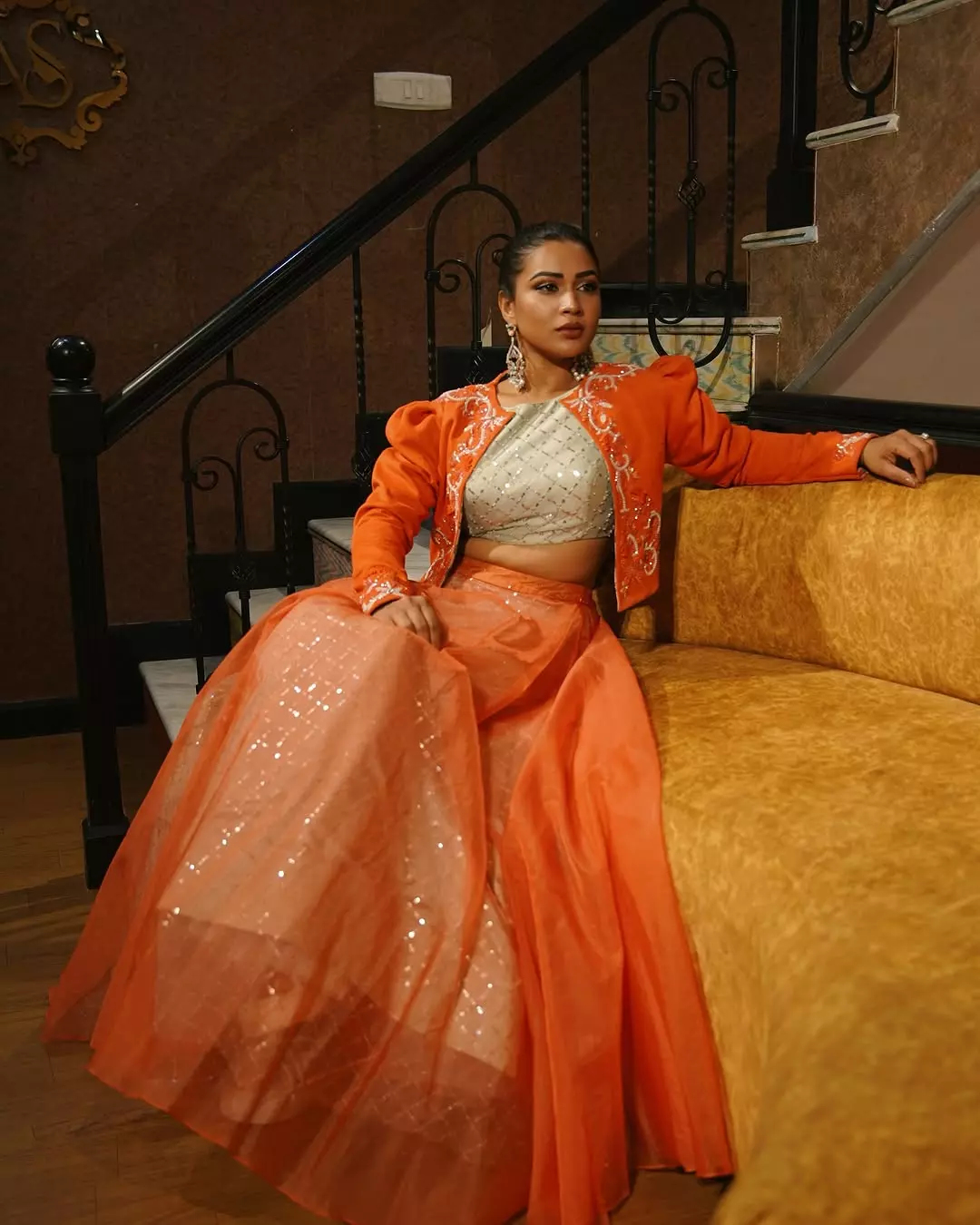 Inaya sulthana recently shared a picture in a orange beautifully embroidered dress.