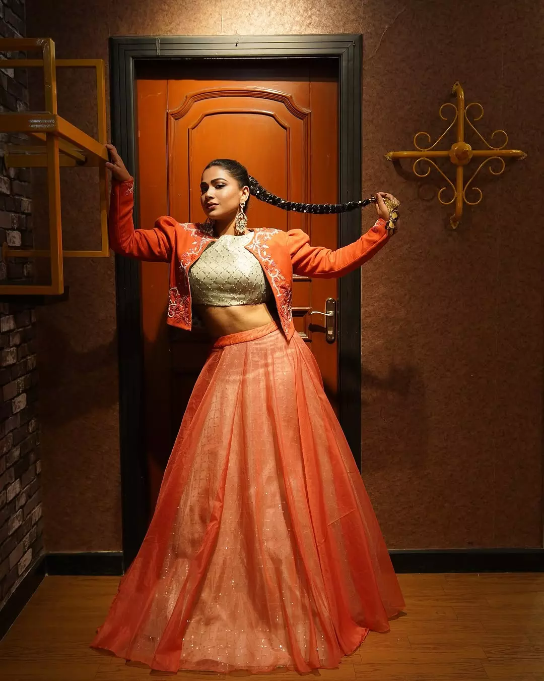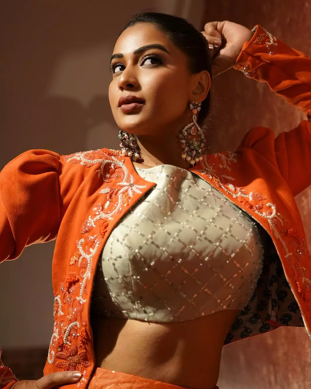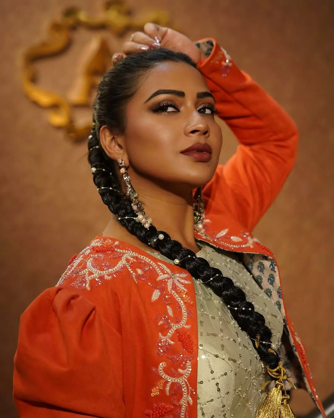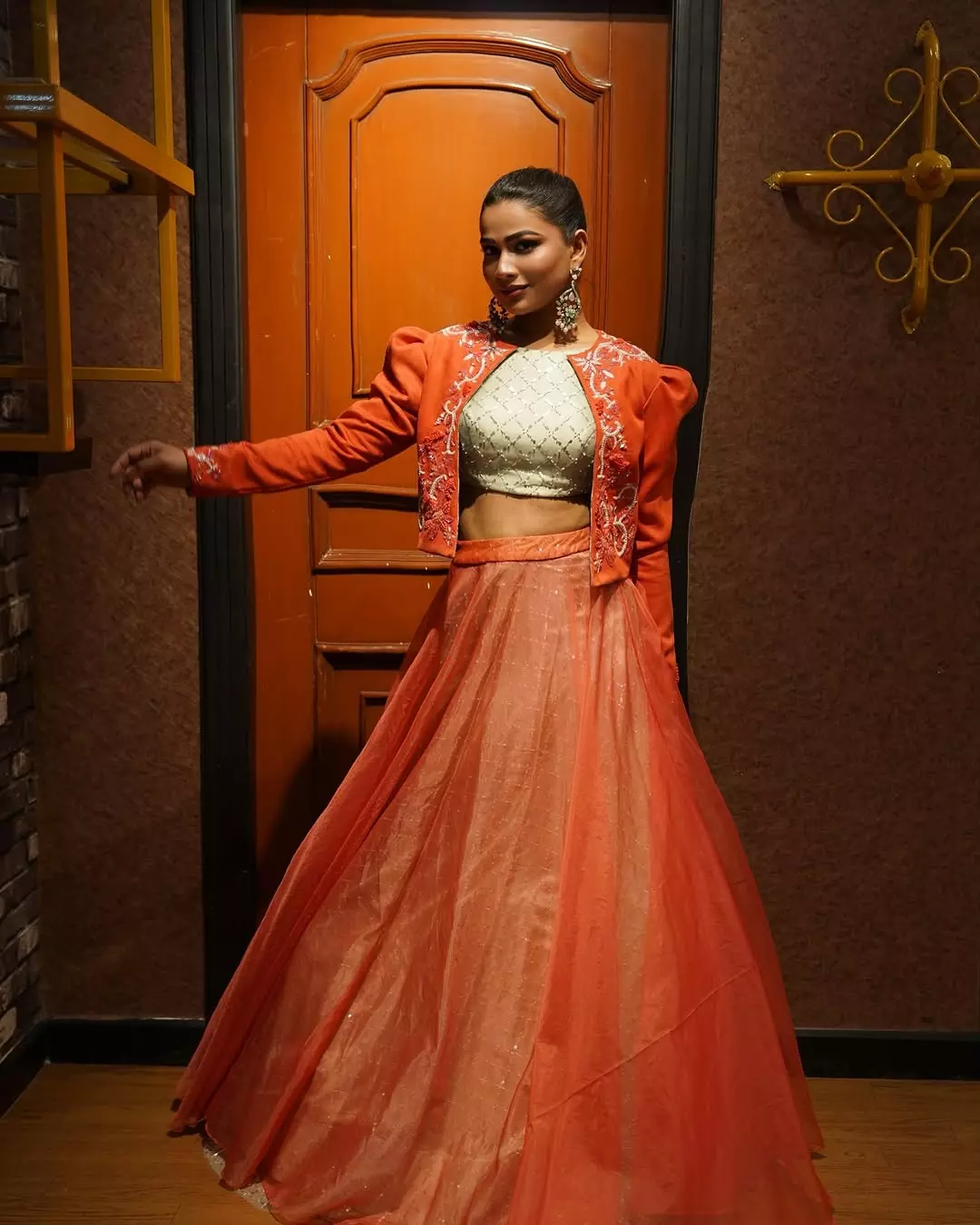 Inaya sulthana recently shared a picture in a orange beautifully embroidered dress.