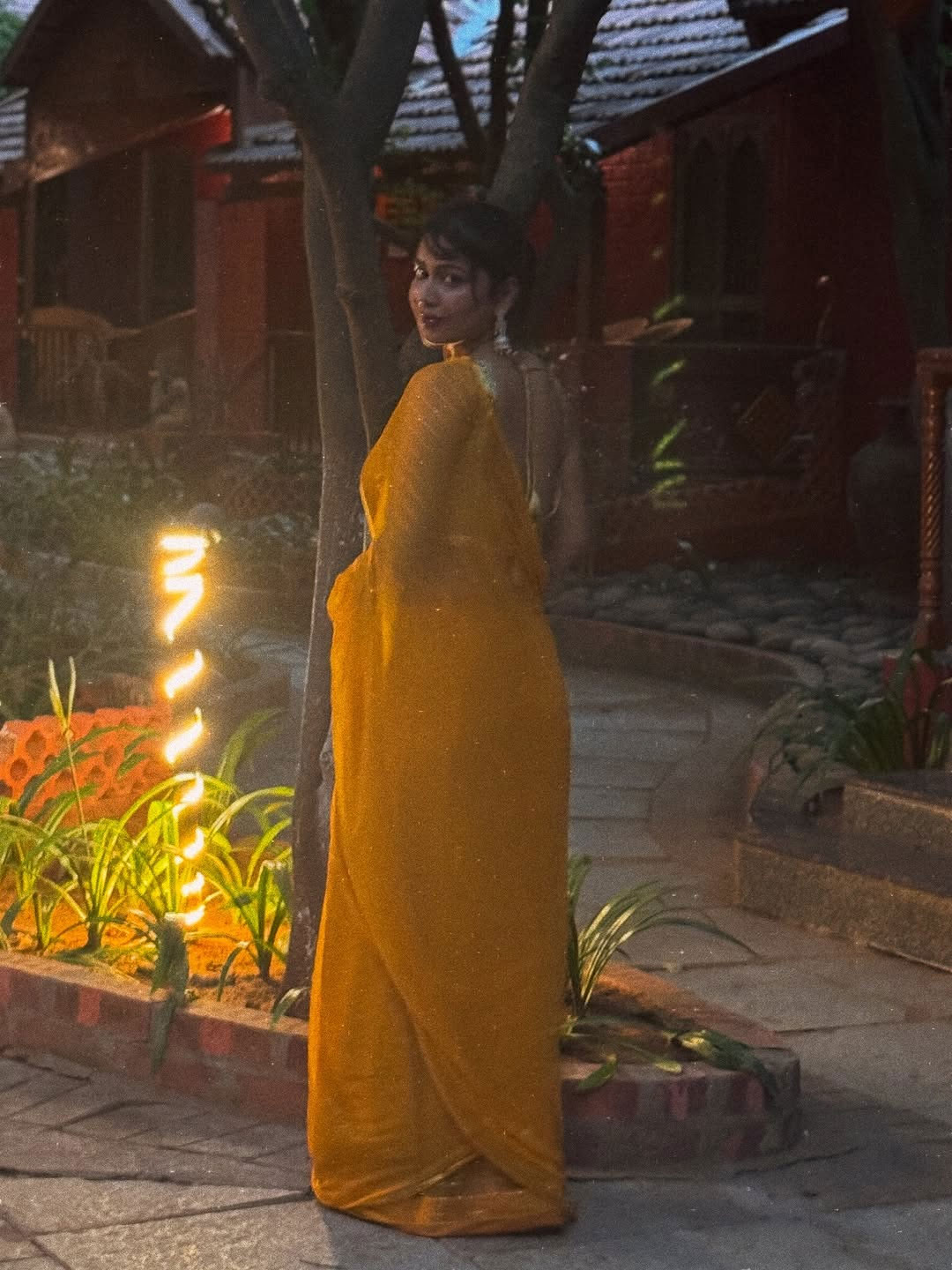 Inaya is seen wearing a bright yellow saree while walking on a peaceful garden path. Her caption read, “My ponytail is totally on fleek today 💃.”