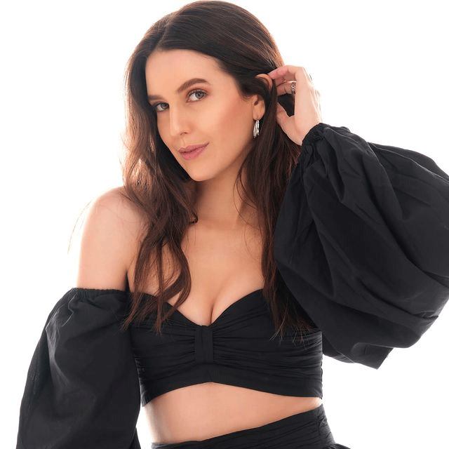 Dressed in a chic black strappy crop top and a flowing thigh-high slit skirt, Isabella embodies classic beauty. The outfit is effortlessly complemented by open hair adorned with a delicate flower crown. The black and white photography creates a timeless atmosphere, highlighting Isabella's natural beauty. The picture evokes the image of a real crown adorning a deserving queen.