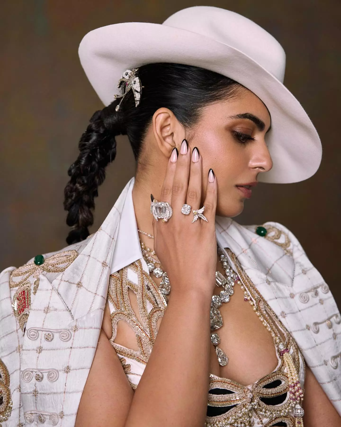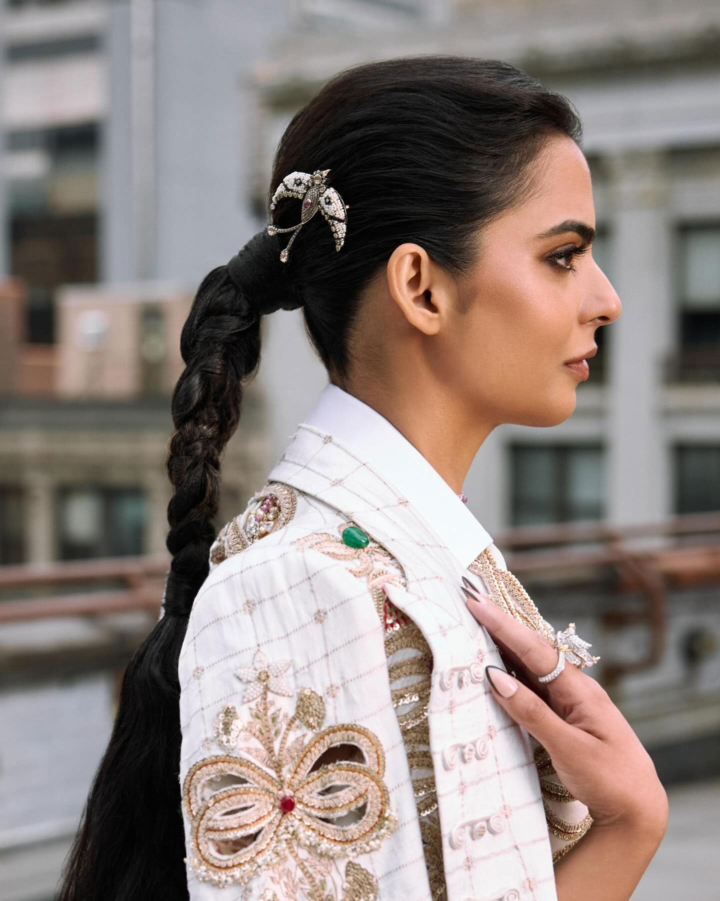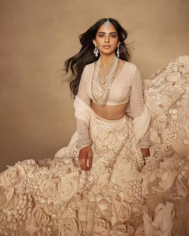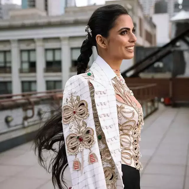 Isha added more sparkle with diamond buttons on her cape and a diamond hip ornament. She wore pearl-studded bird hairpins, Tiffany & Co. bird rings and a peacock-shaped hair clip—all chosen to reflect Indian royal heritage. Her makeup was subtle with rose-brown lips and smoky eyes. Her hair was styled neatly in a braid completing the elegant yet powerful look.