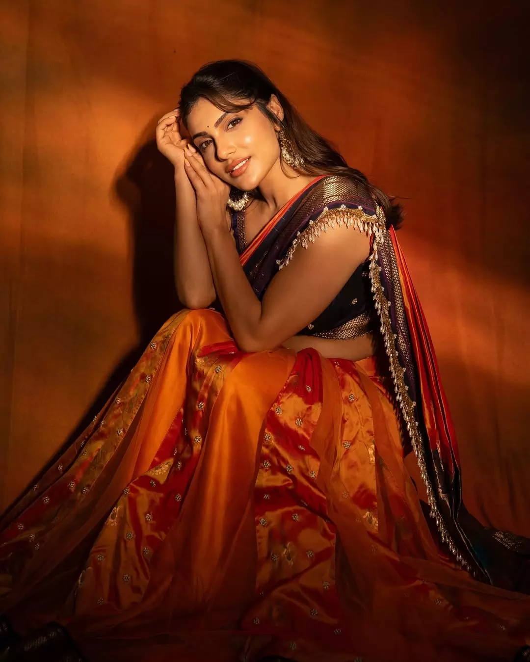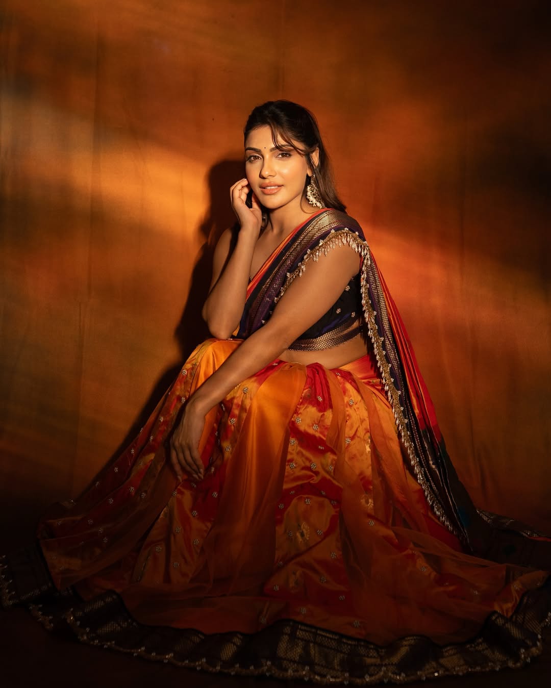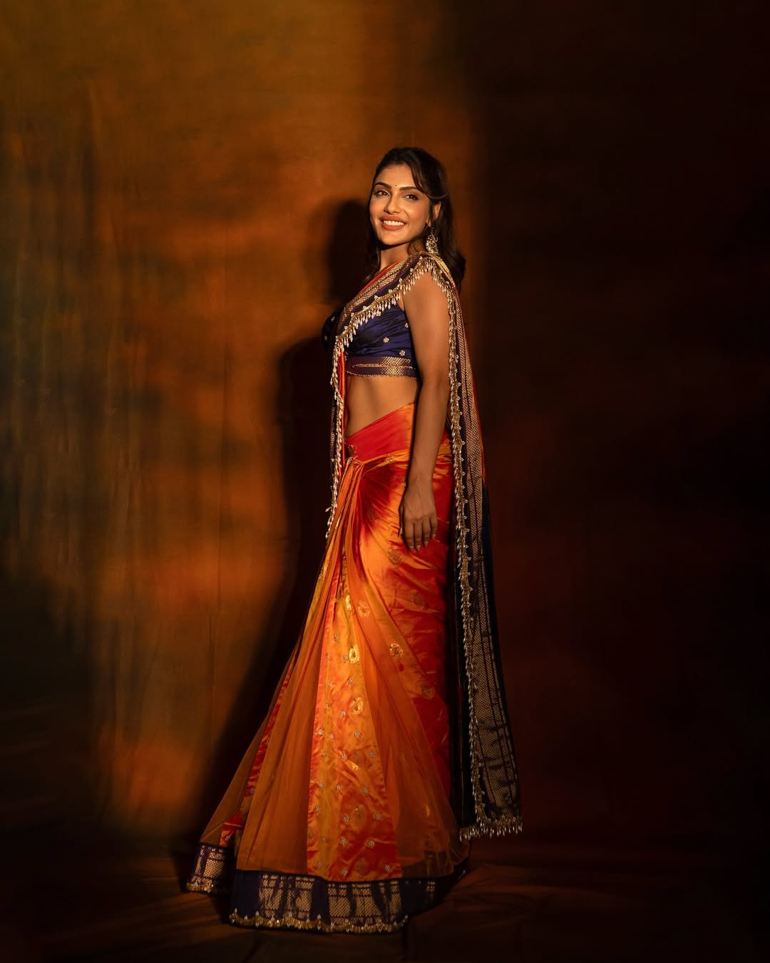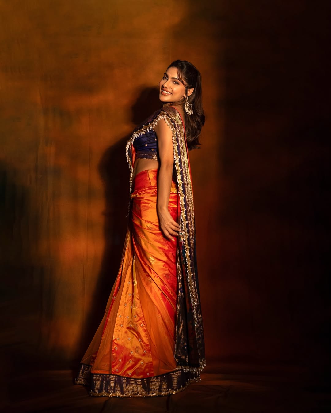 The orange saree perfectly complements her radiant skin tone. Ishita Raj has always had a unique fashion sense.
