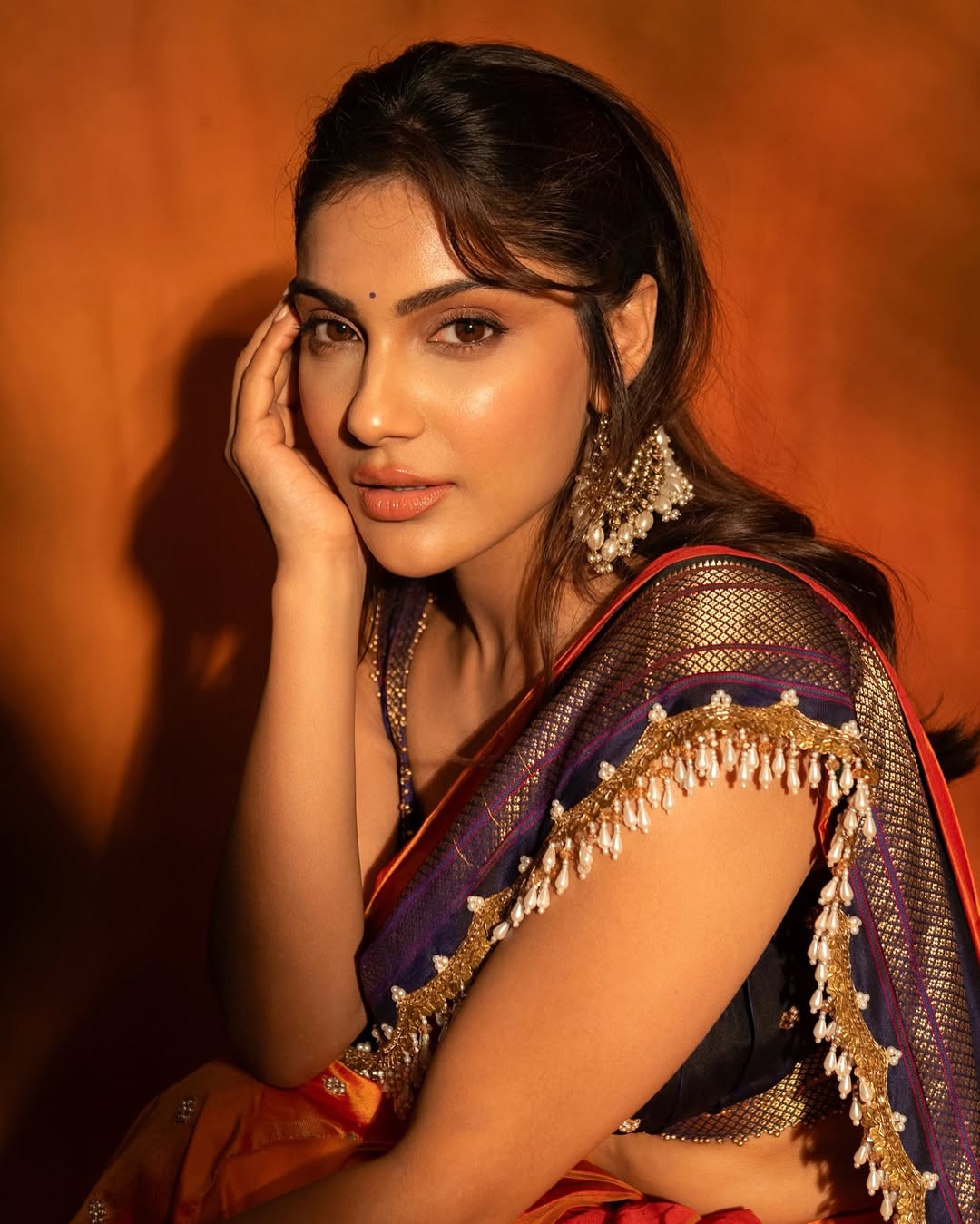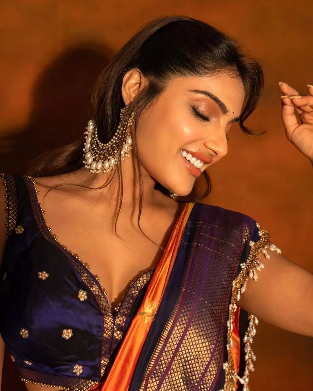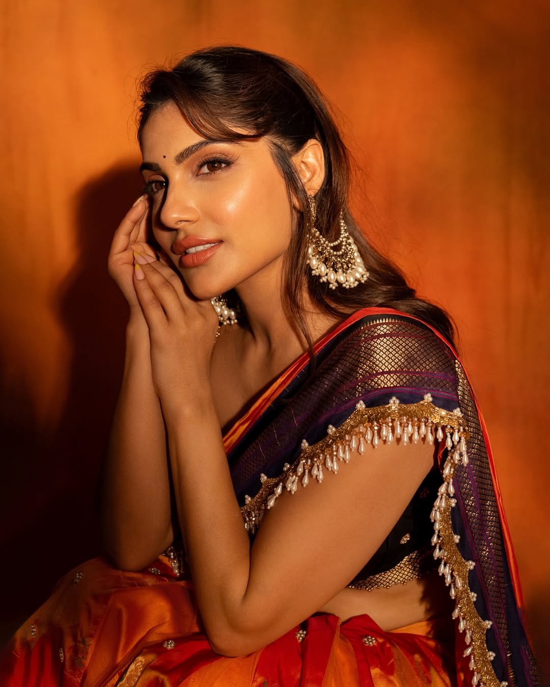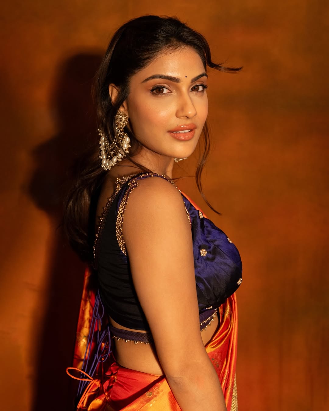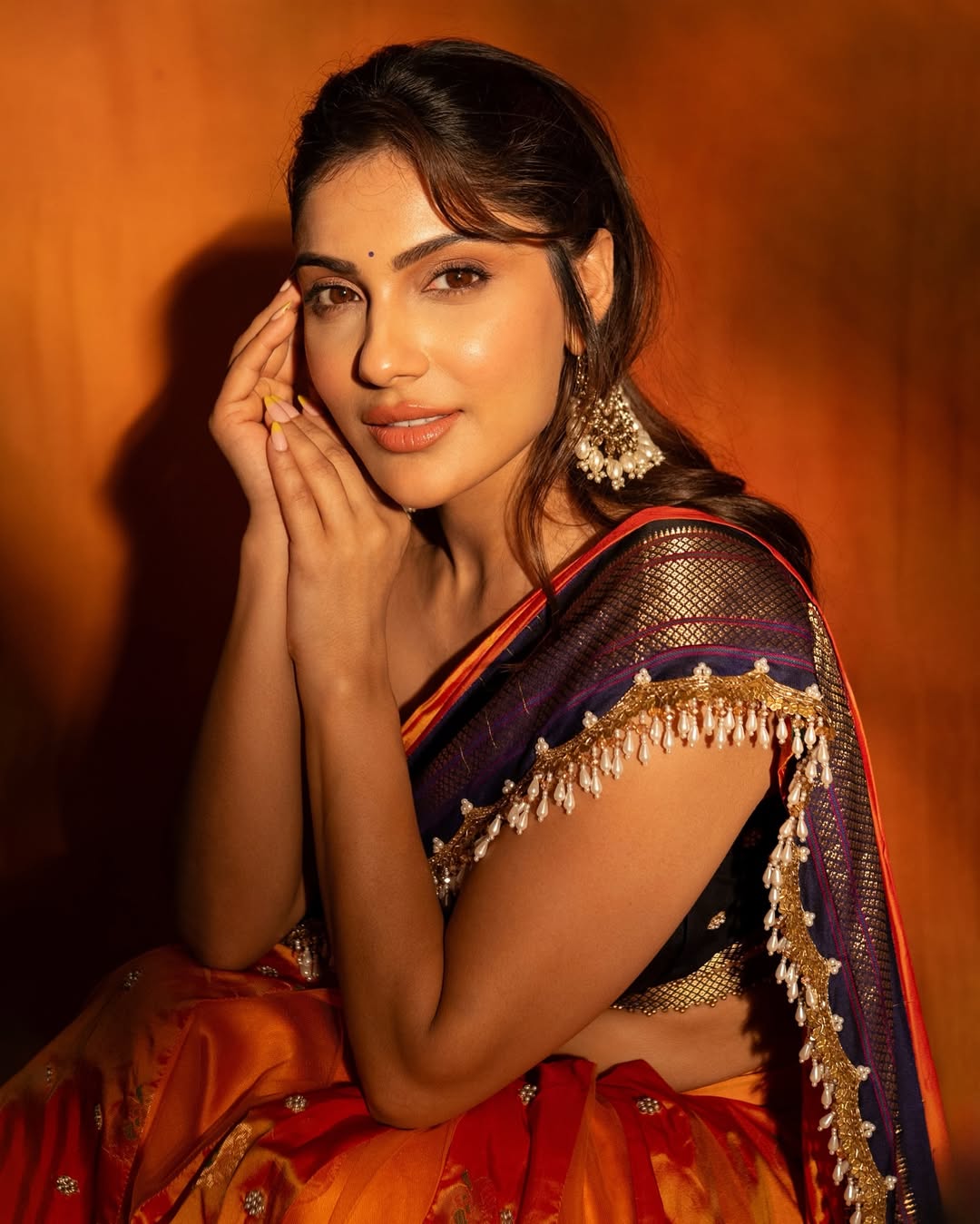 The orange saree perfectly complements her radiant skin tone. Ishita Raj has always had a unique fashion sense.