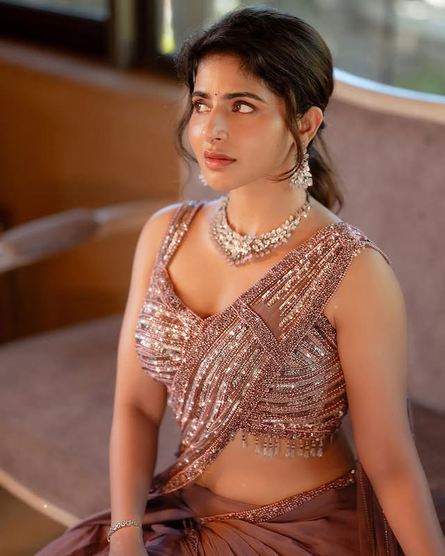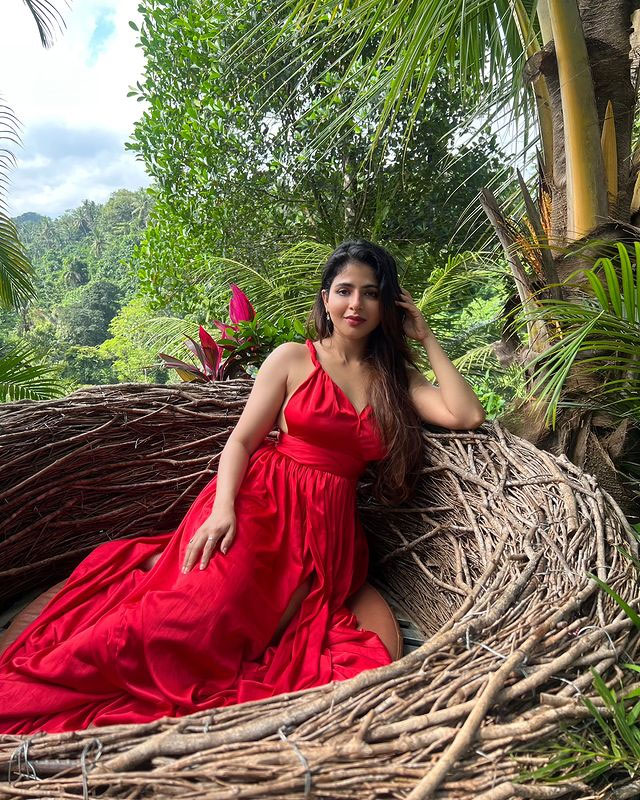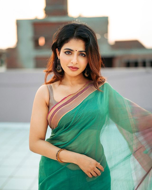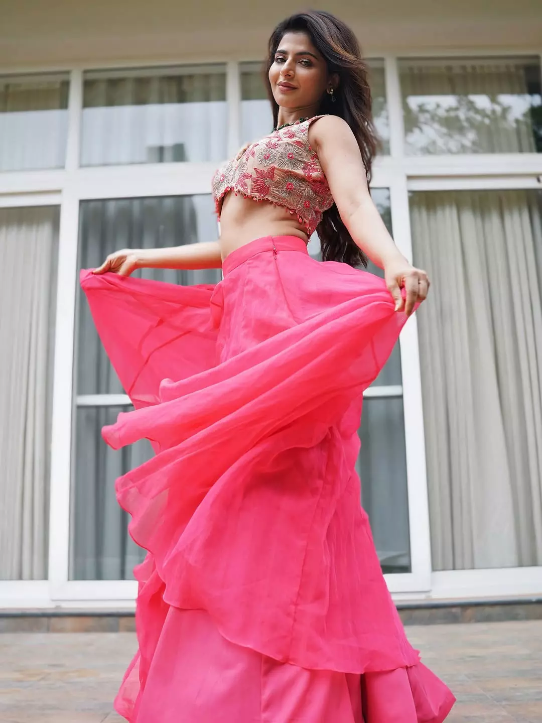 Iswarya Menon shared a happy post on Instagram. She wore a bright neon pink lehenga and blouse had floral embroidery with a deep neckline. Her lehenga was flowing and simple. She wore a green stone necklace and matching earrings and sat with a warm smile.
