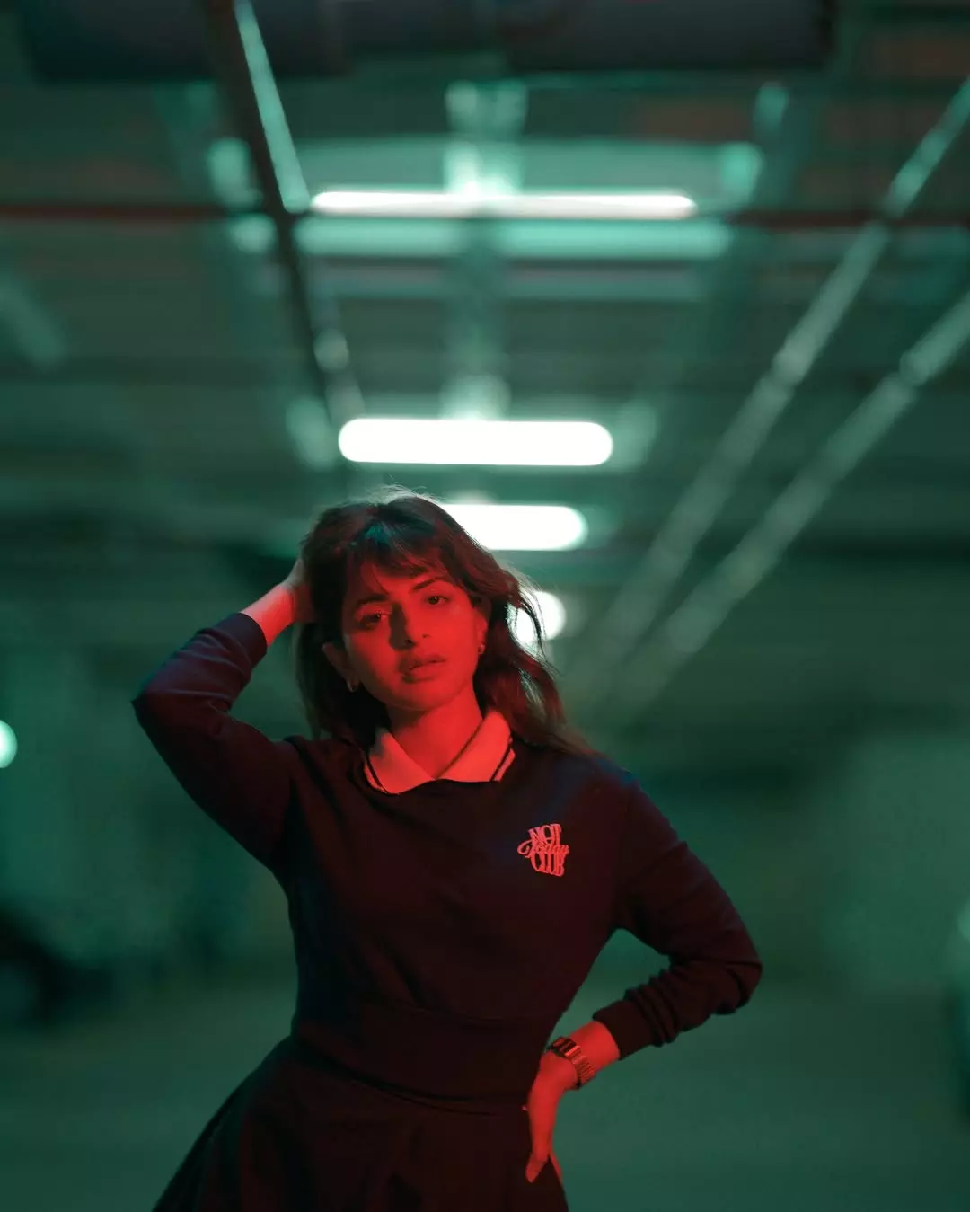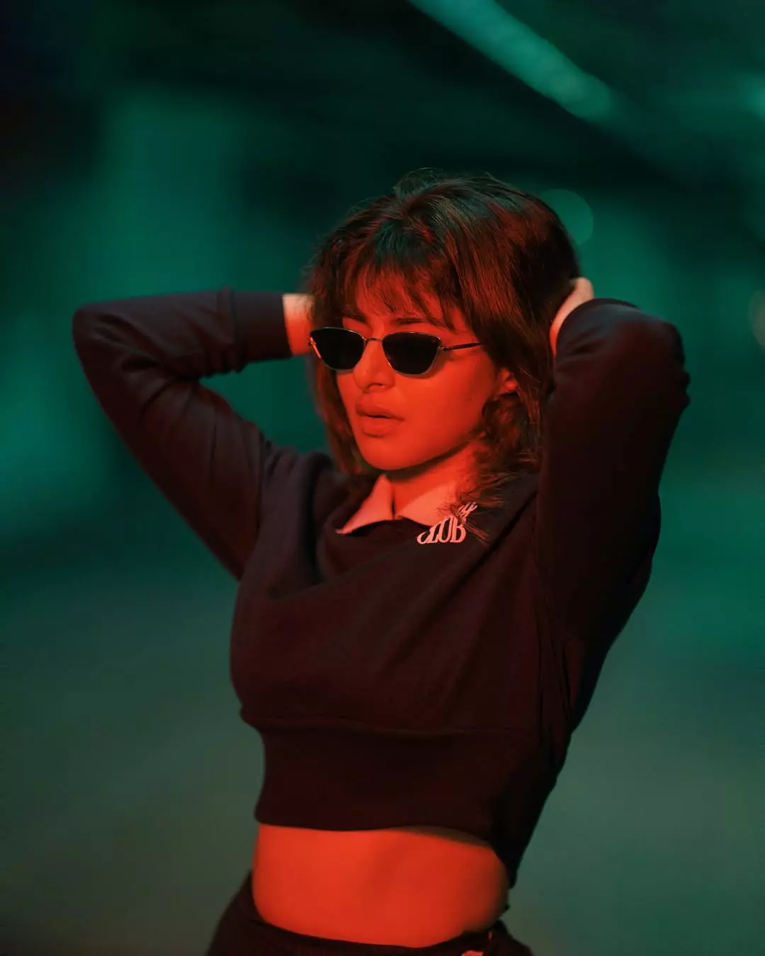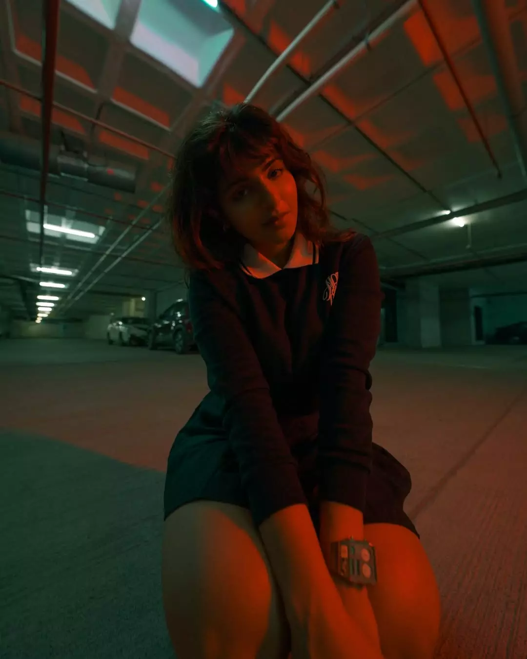 By: Tupaki Gallery Desk | 30 April 2026 10:32 PM ISTIswarya Menon delivers pure attitude in this striking photograph, captured under intense red and teal lighting. With her hands casually behind her head, sleek black sunglasses, and a cropped black sweatshirt, she oozes effortless cool and confidence. The dramatic lighting highlights her sharp features and rebellious charm in this edgy, high-energy portrait.
