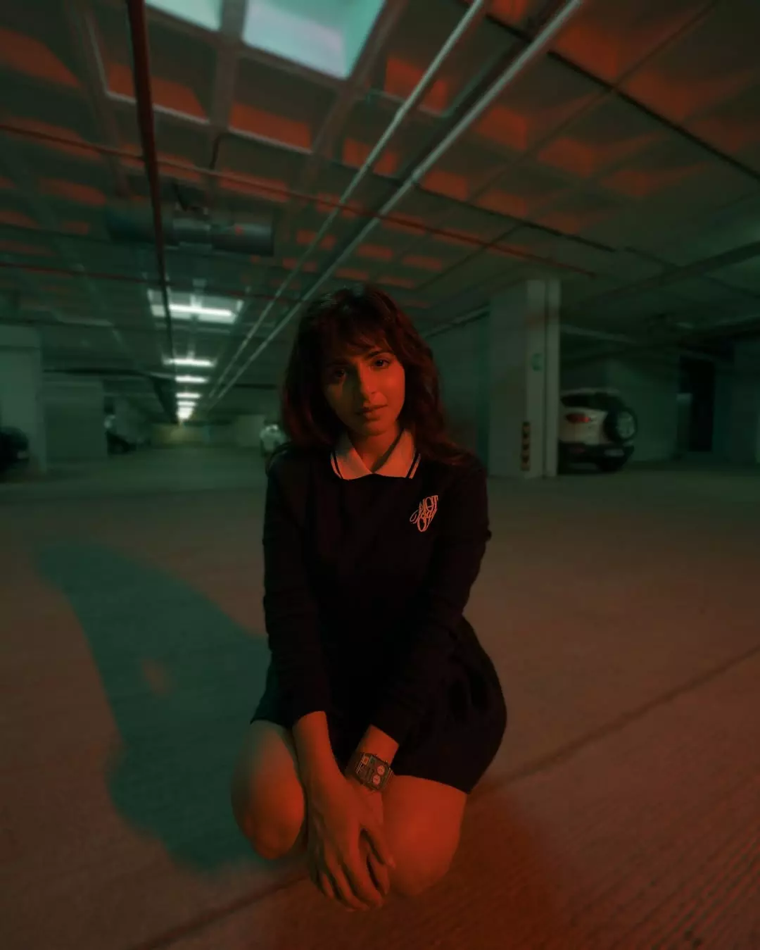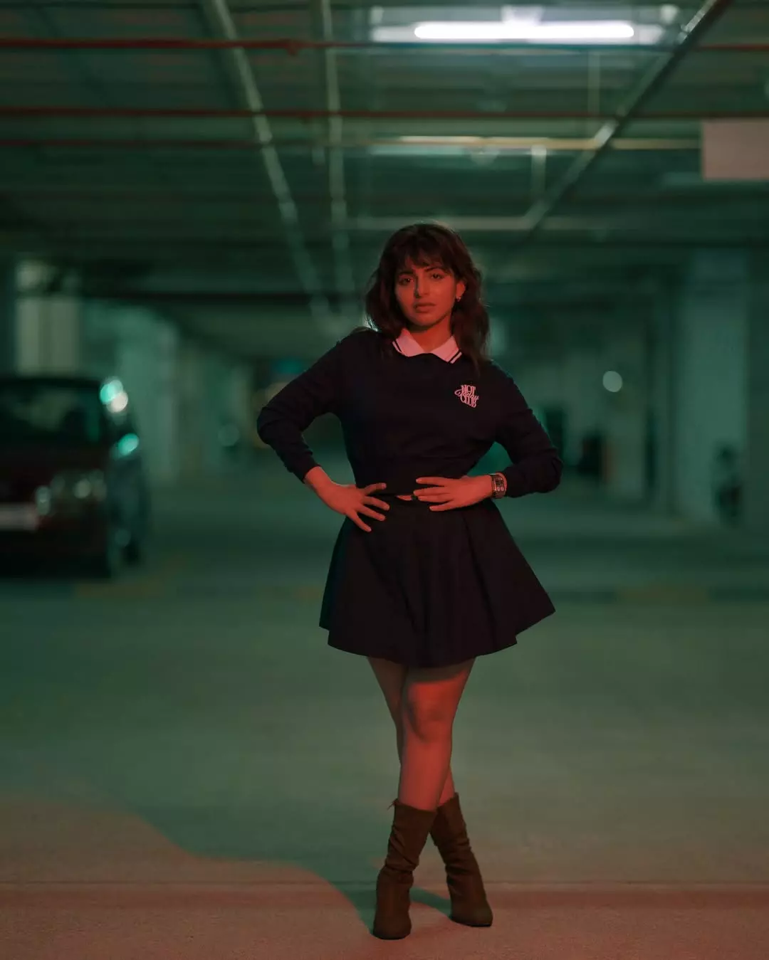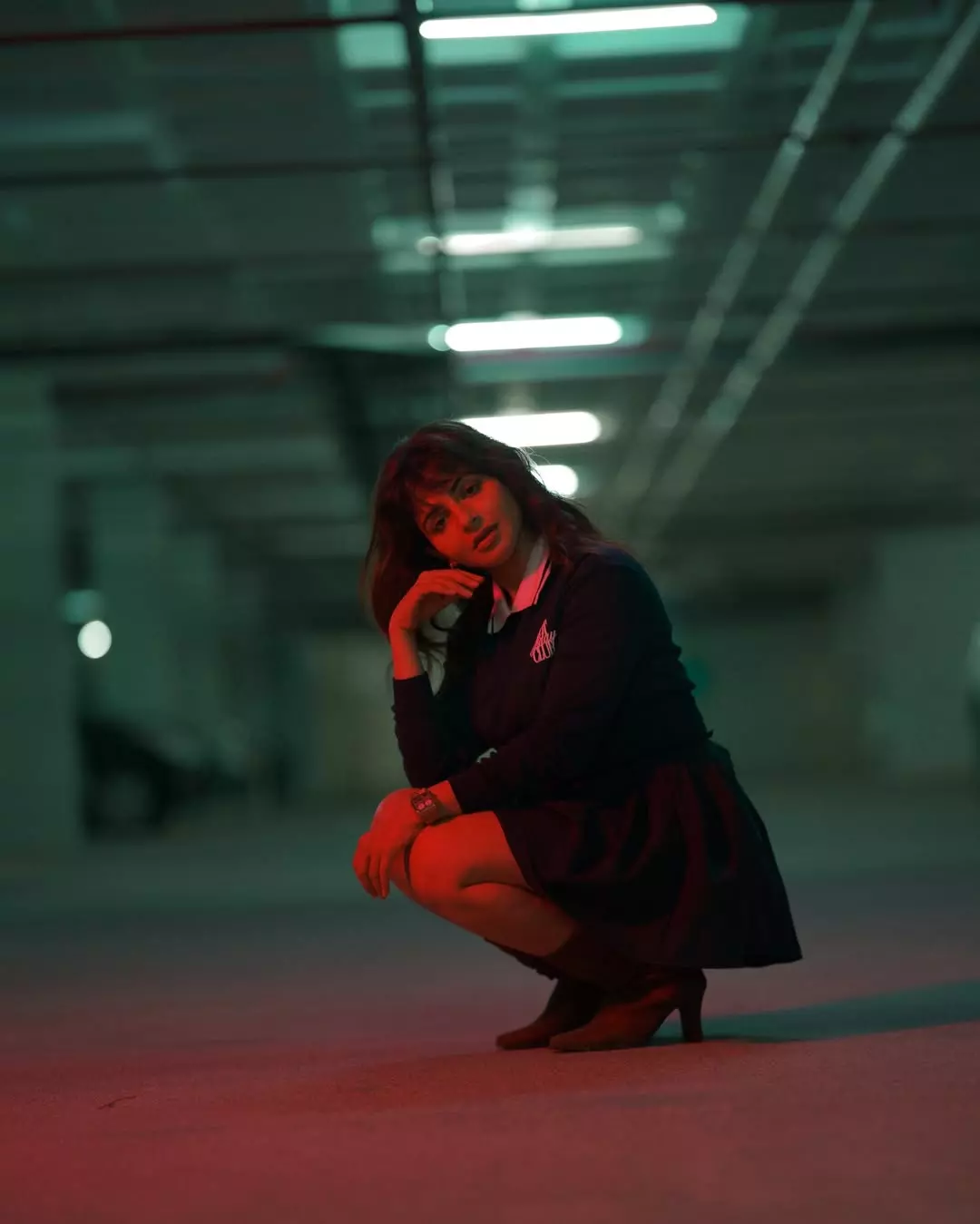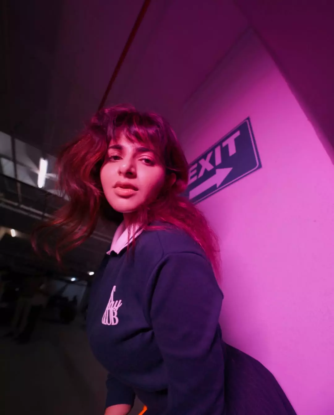 By: Tupaki Gallery Desk | 30 April 2026 10:32 PM ISTIswarya Menon delivers pure attitude in this striking photograph, captured under intense red and teal lighting. With her hands casually behind her head, sleek black sunglasses, and a cropped black sweatshirt, she oozes effortless cool and confidence. The dramatic lighting highlights her sharp features and rebellious charm in this edgy, high-energy portrait.