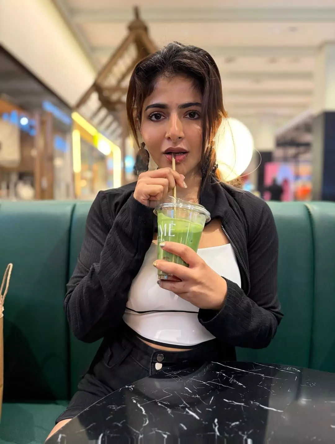Actor Iswarya Menon posted a picture on her Instagram profile with the caption “Matcha & Conversations” along with a cup emoji and a hand gesture. The photo shows her sitting at a café, sipping a green matcha drink and enjoying a relaxed break. She wears a white crop top layered with a black jacket and paired with dark shorts.