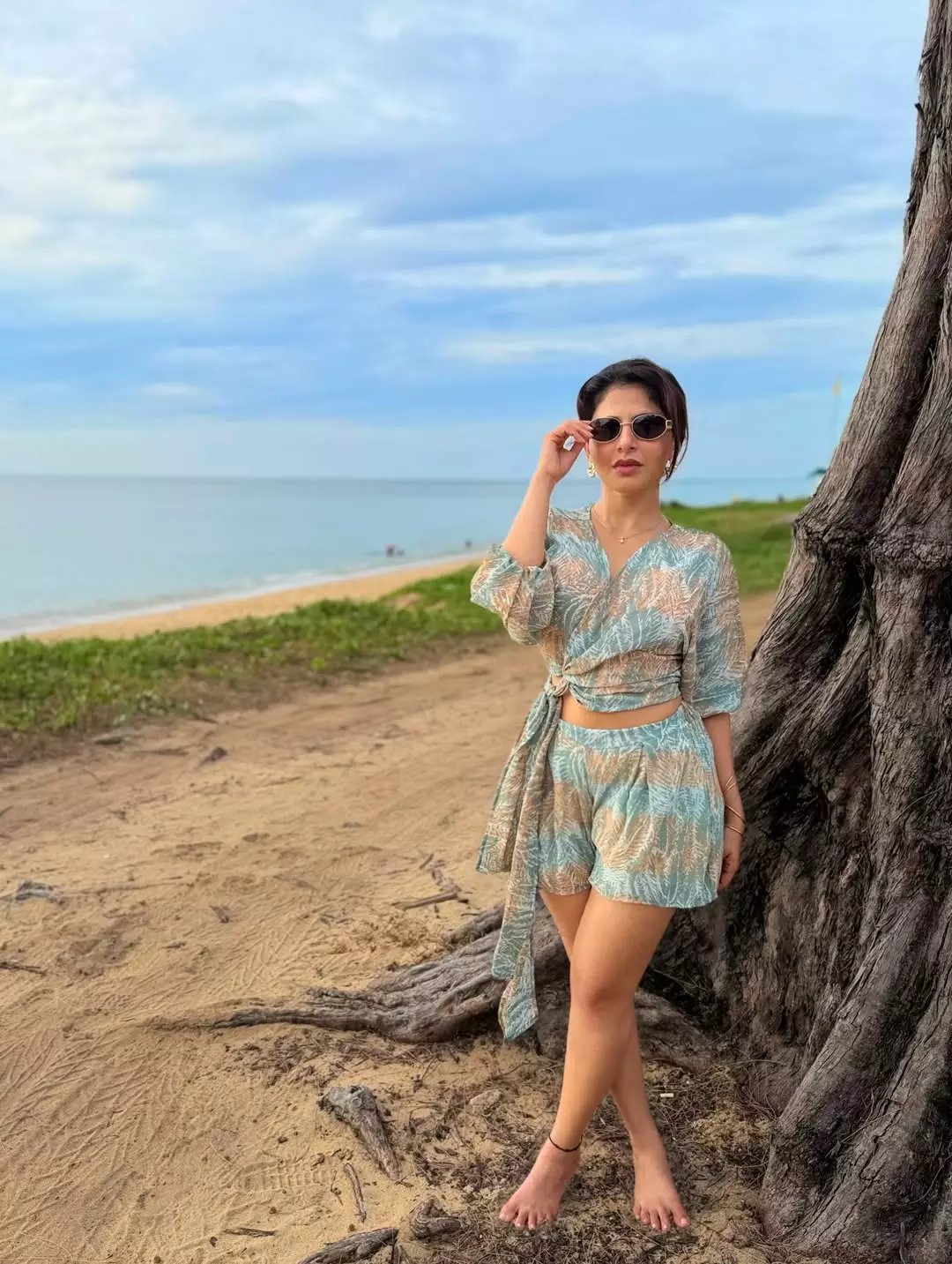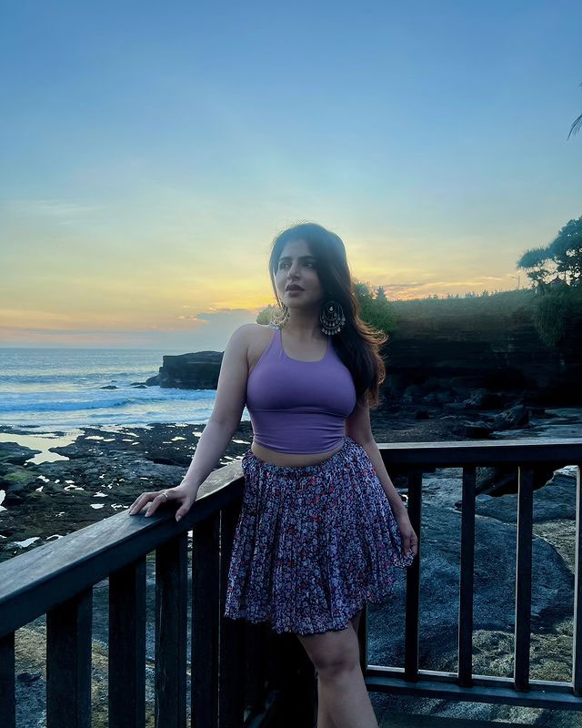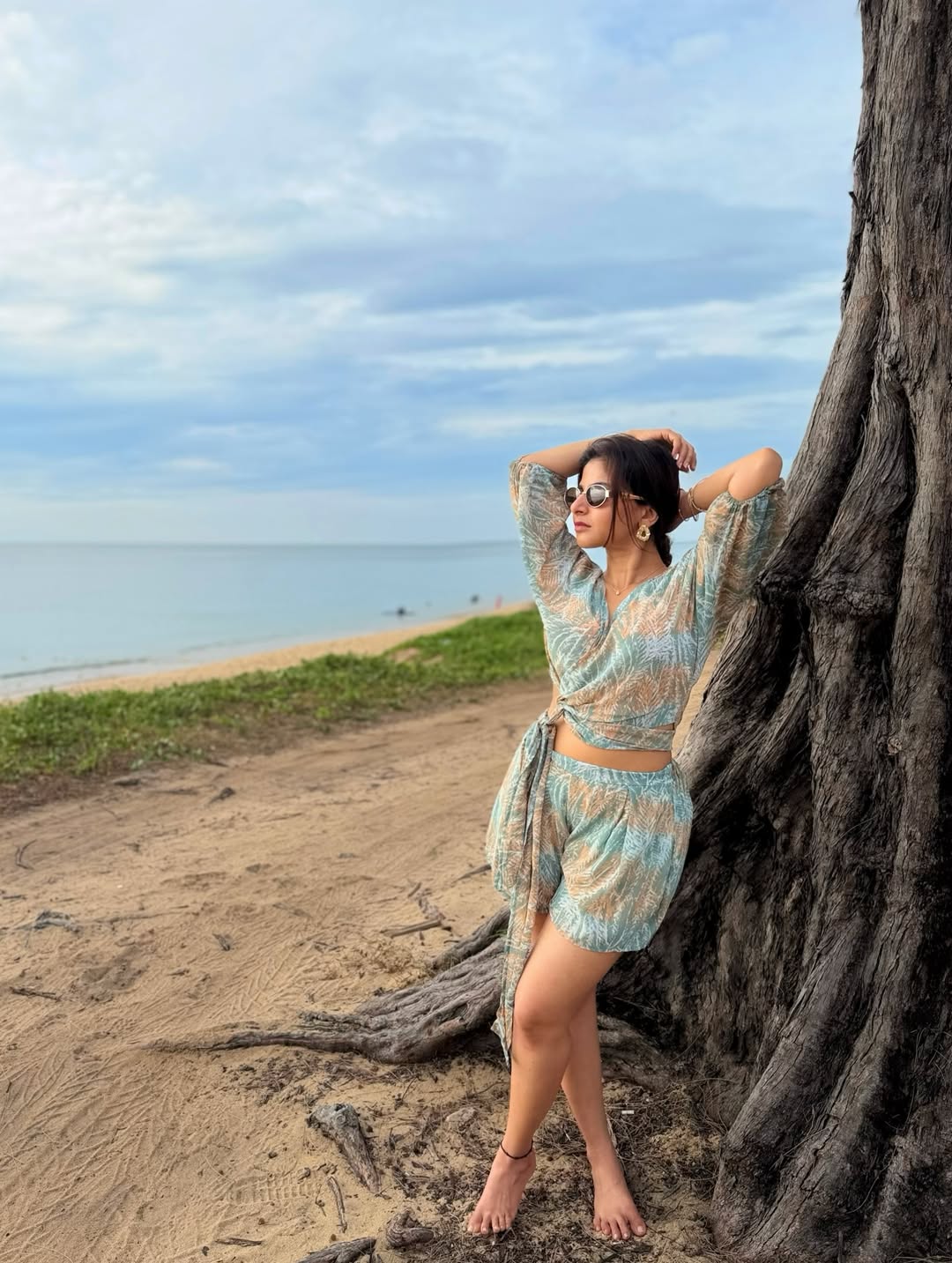 Perfectly suited for casual outings, resort getaways, or beachside escapes, the outfit balances comfort with understated elegance. Its flowing silhouette allows for ease of movement, while the subtle print adds a gentle visual charm without overpowering the look. Iswarya’s poised yet relaxed stance enhances the ensemble’s laid-back appeal, making the style feel organic and effortless.